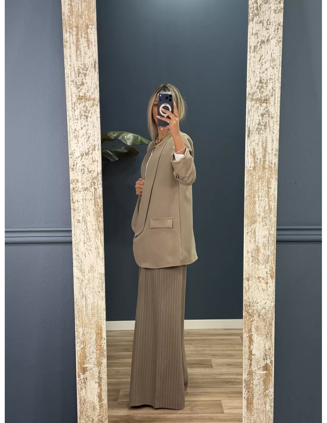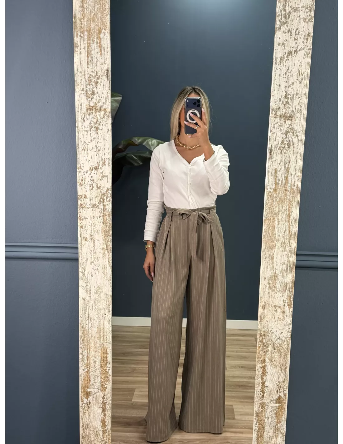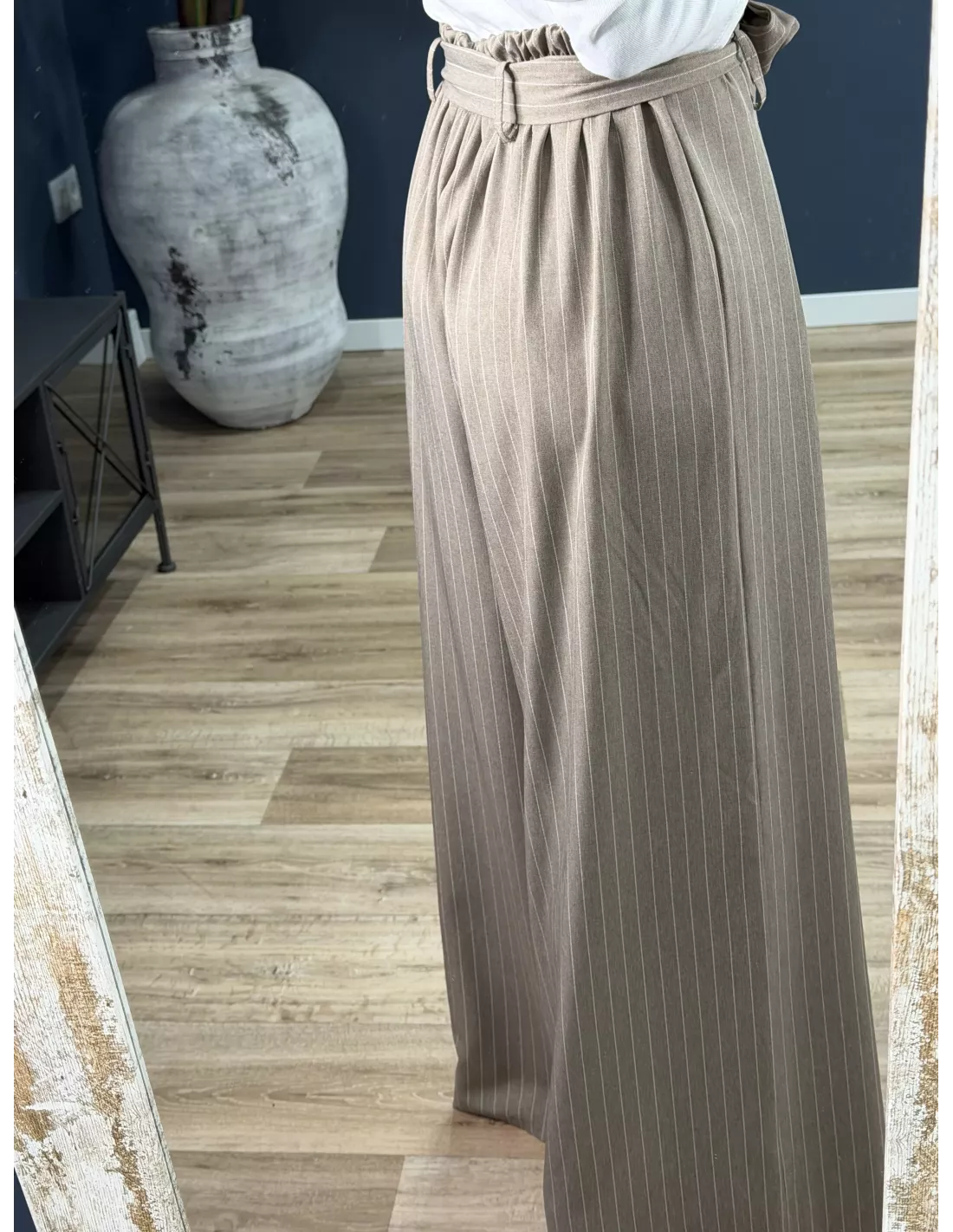 El pantalón es tipo Palazzo de talle alto que trae cinturón del mismo tejido. La parte de atrás de la cintura lleva goma. No tiene bolsillos.