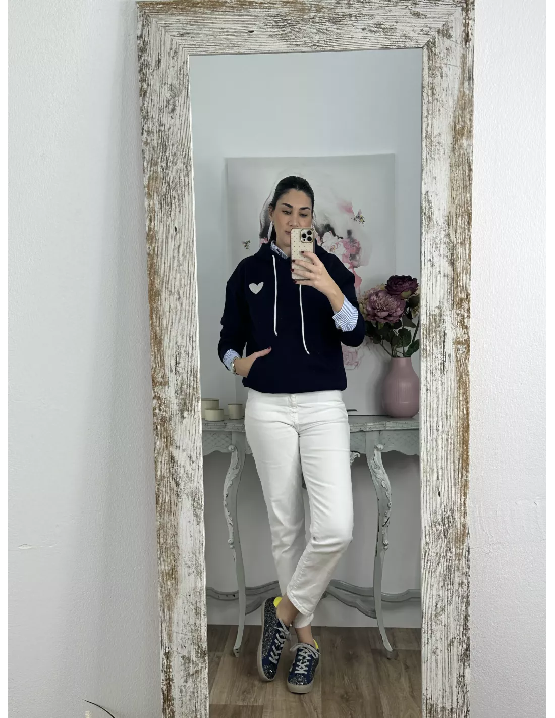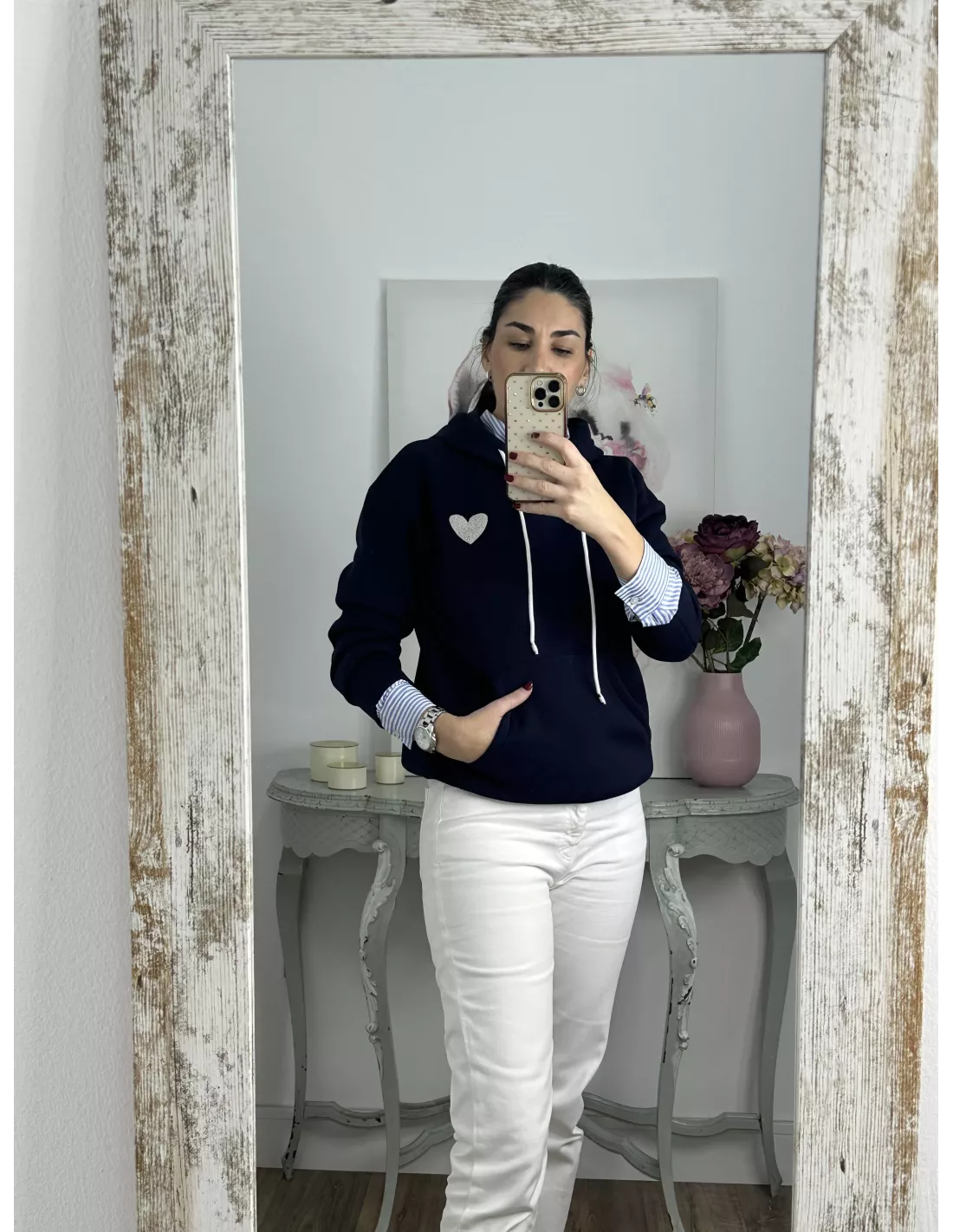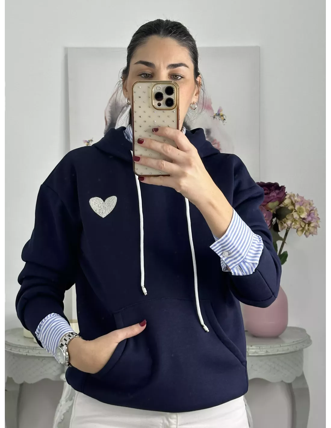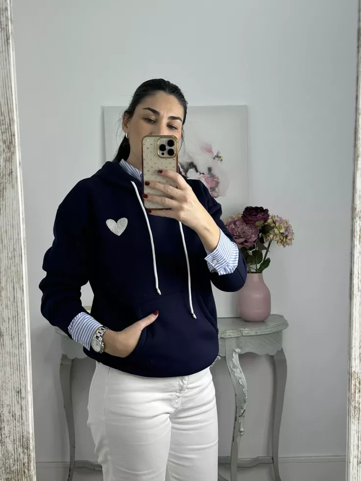 Sudadera con capucha. Con un corazón en relieve. El interior lleva pelito. La parte de abajo simula como si llevara una camiseta, pero va cosido