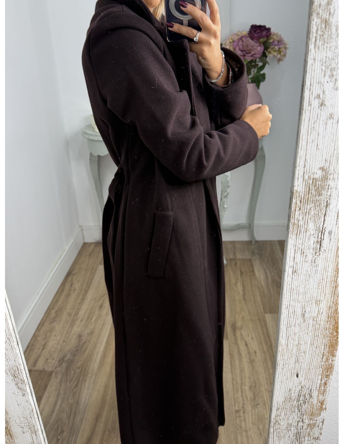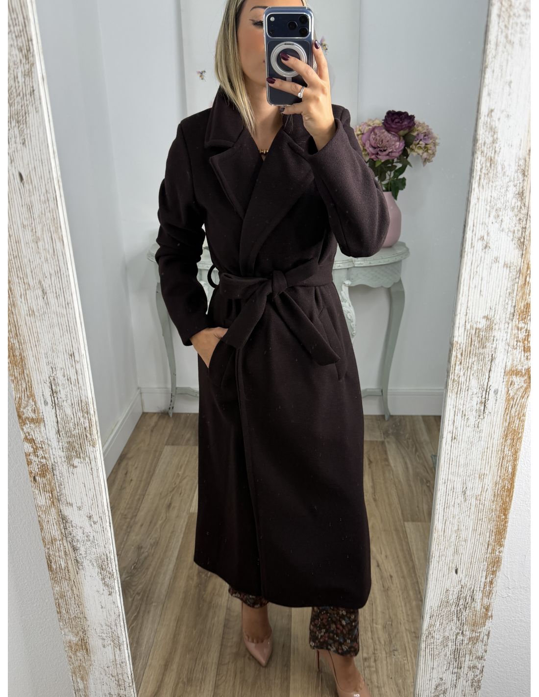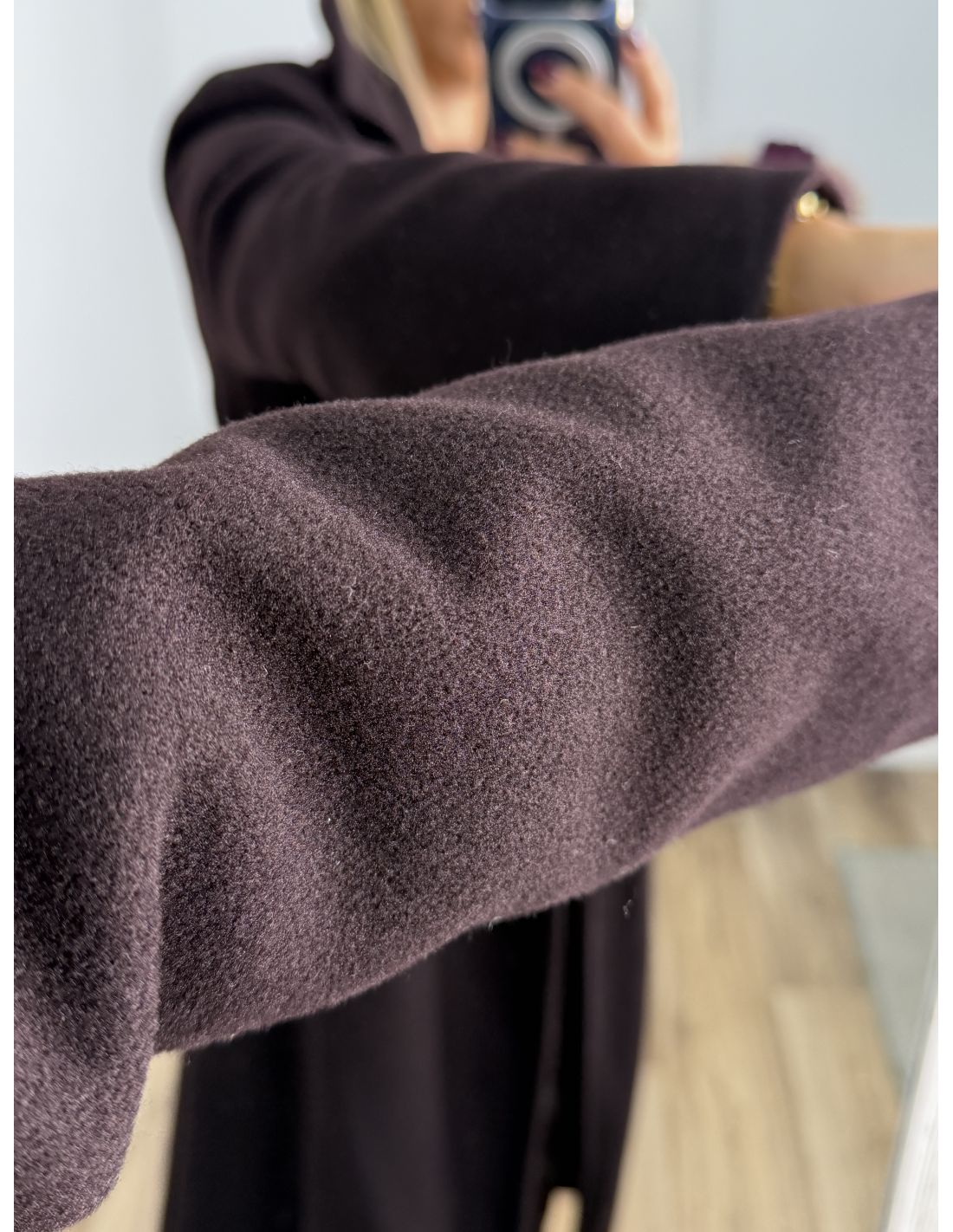 Abrigo de tejido tipo paño, el cortes es tipo bata, va forrado. Tiene bolsillos y cinturón del mismo tejido. Tiene dos botones en el centro.