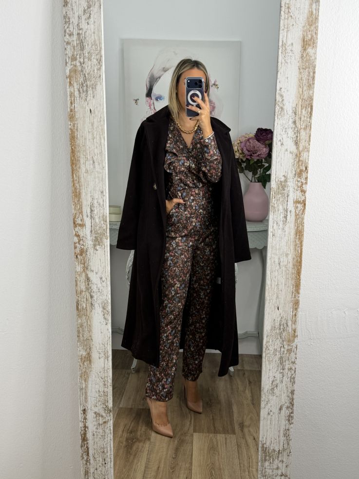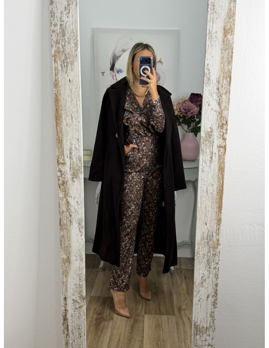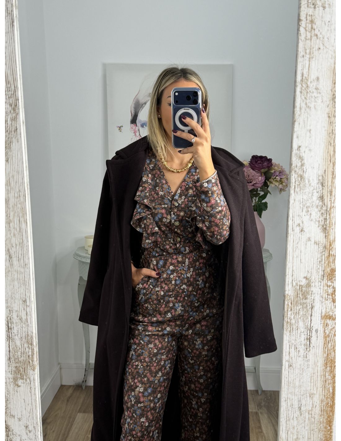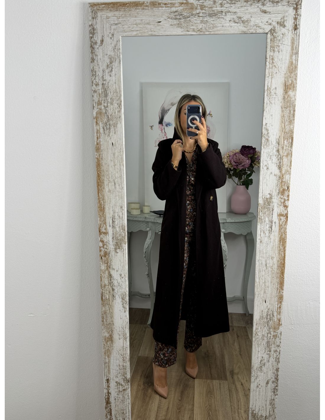 Abrigo de tejido tipo paño, el cortes es tipo bata, va forrado. Tiene bolsillos y cinturón del mismo tejido. Tiene dos botones en el centro.
