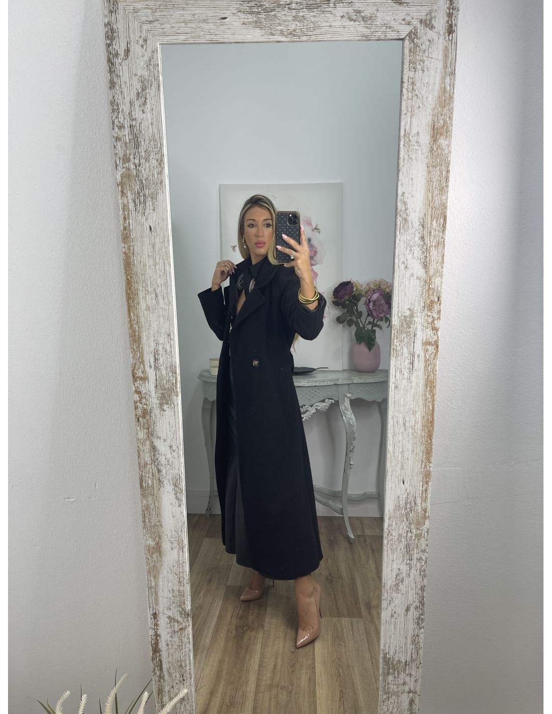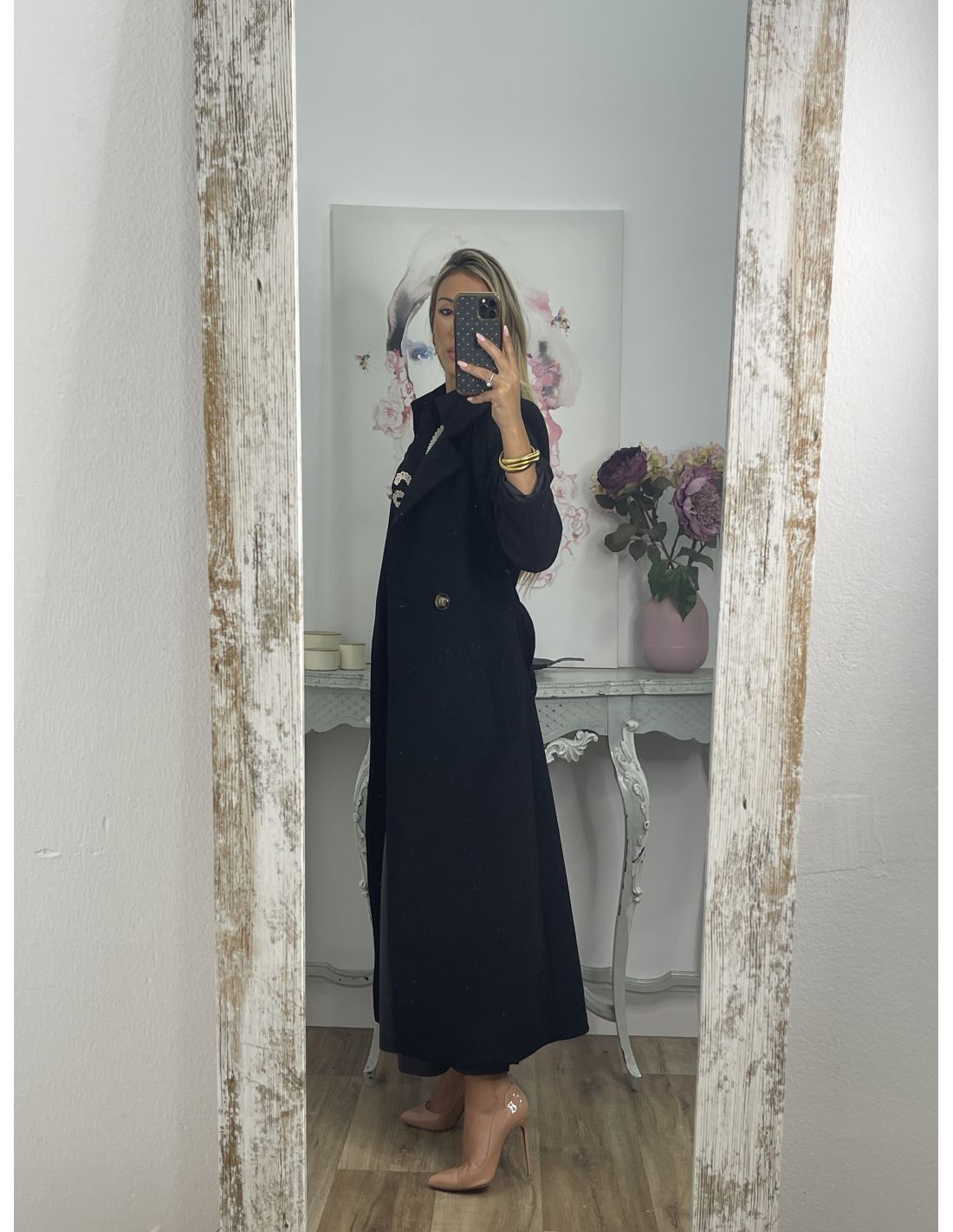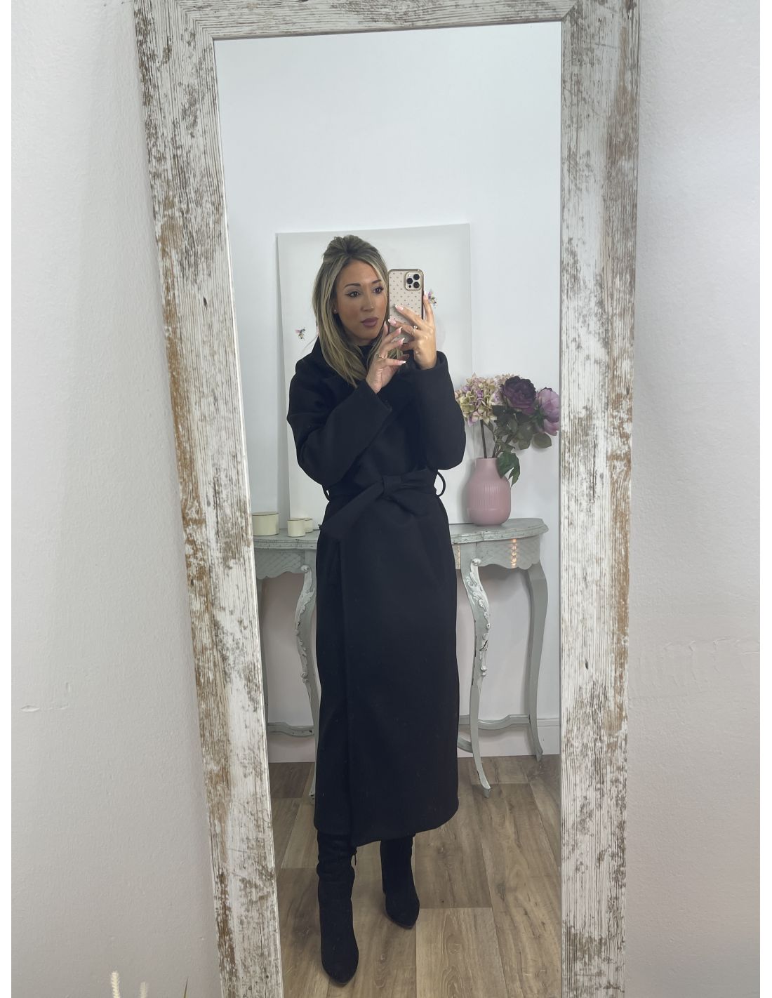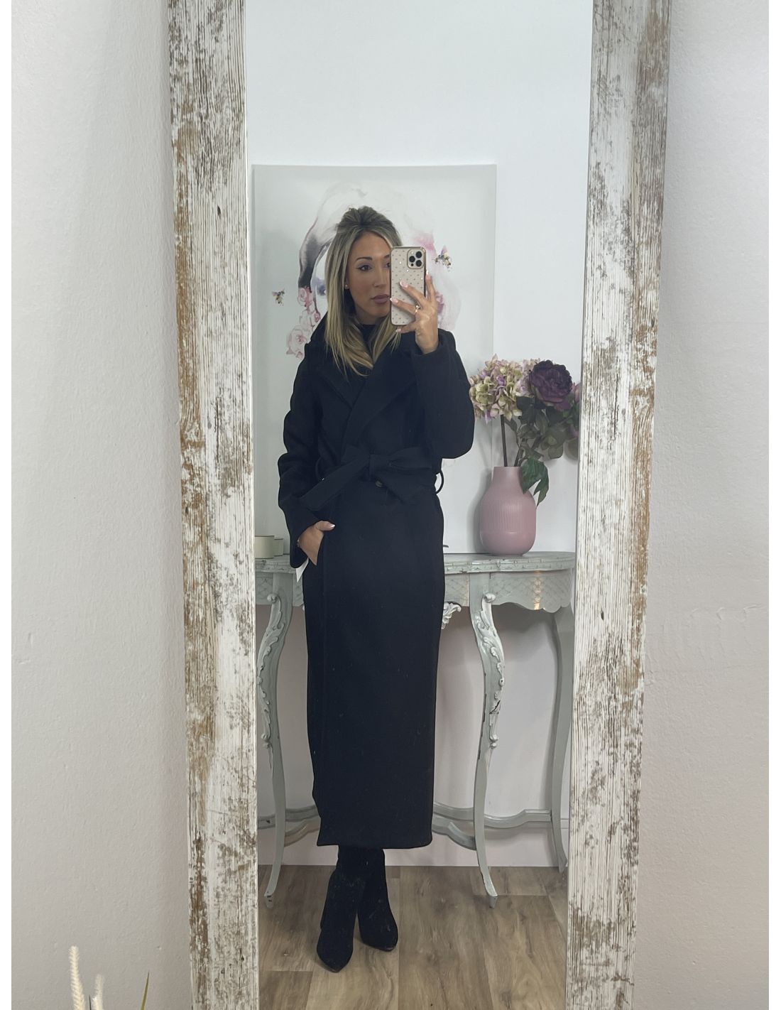 Abrigo de tejido tipo paño, el cortes es tipo bata, va forrado. Tiene bolsillos y cinturón del mismo tejido. Tiene dos botones en el centro.
