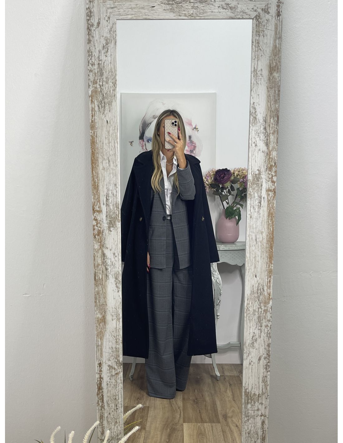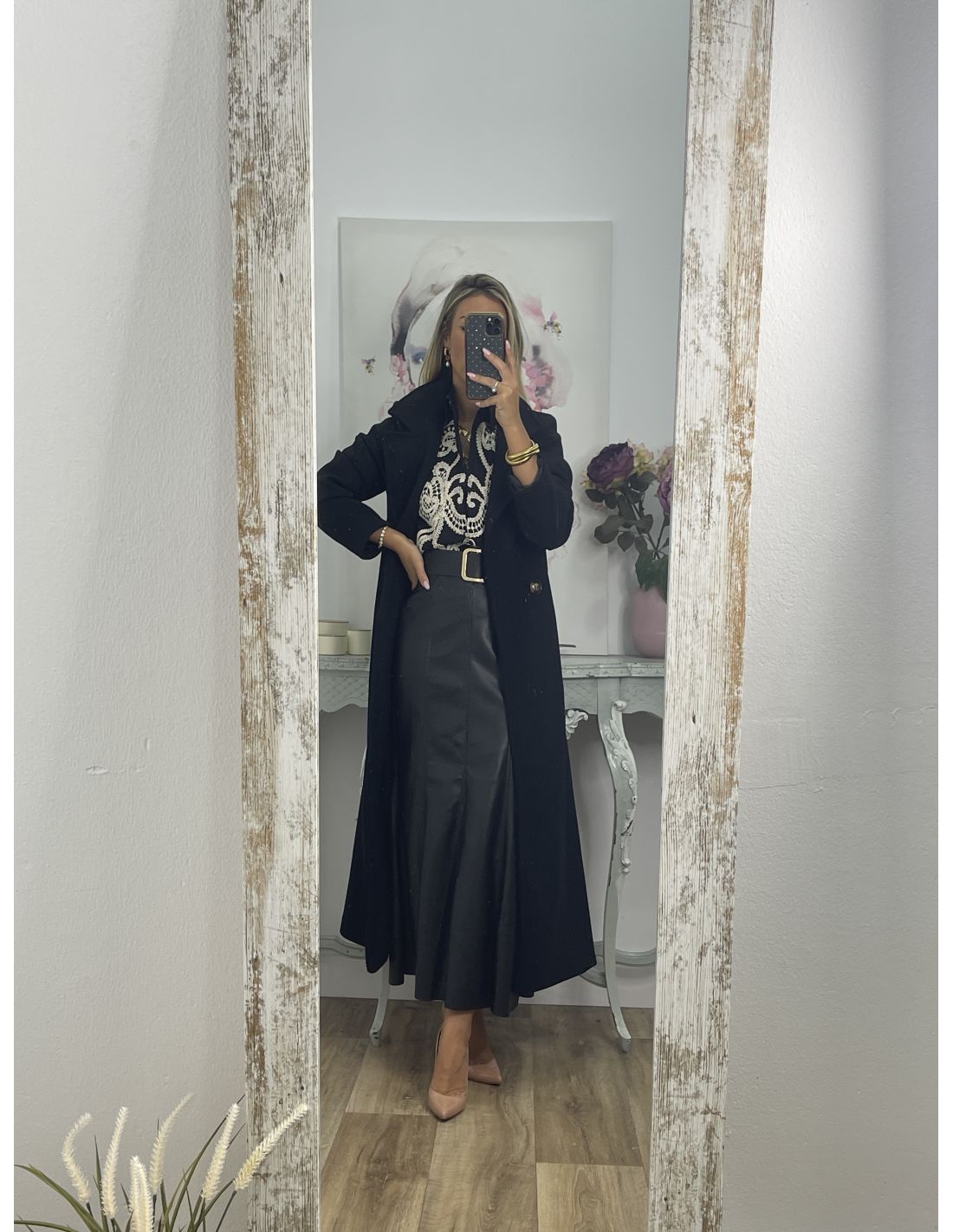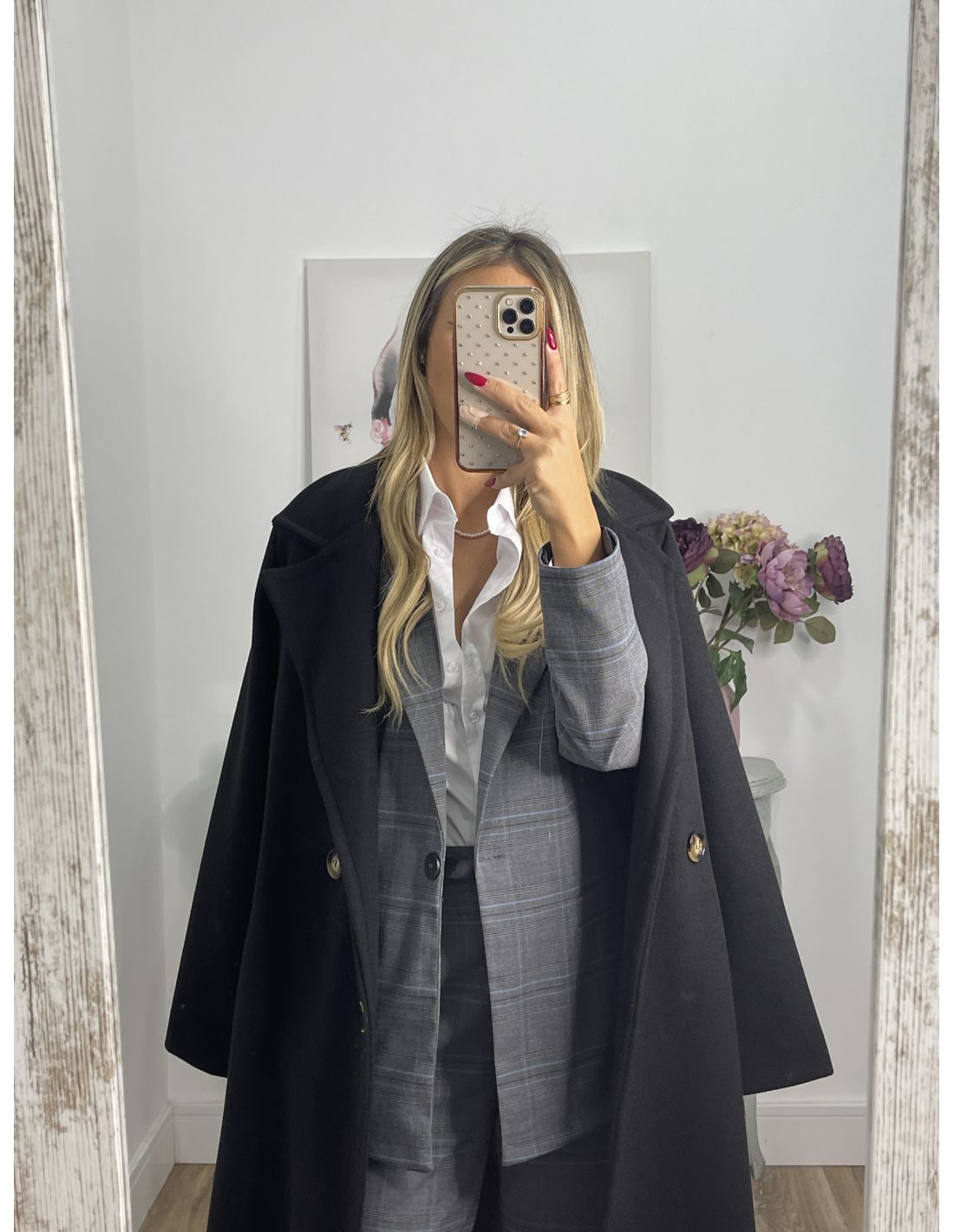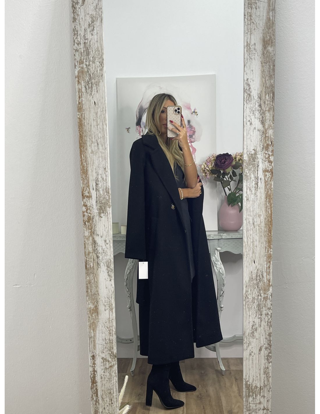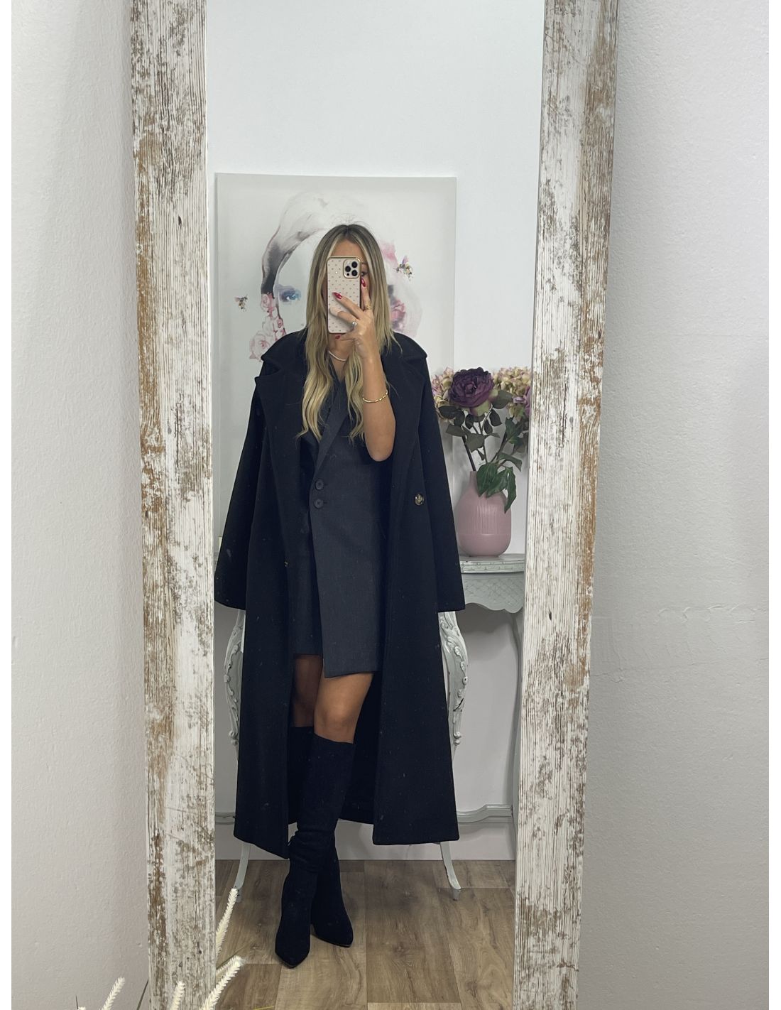 Abrigo de tejido tipo paño, el cortes es tipo bata, va forrado. Tiene bolsillos y cinturón del mismo tejido. Tiene dos botones en el centro.