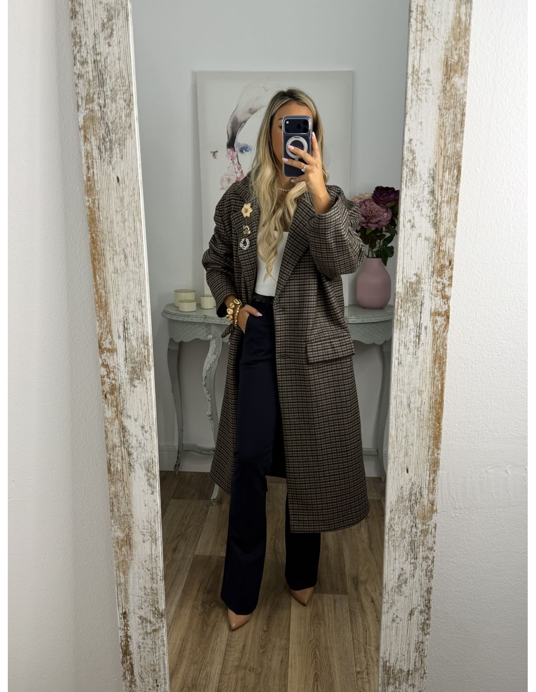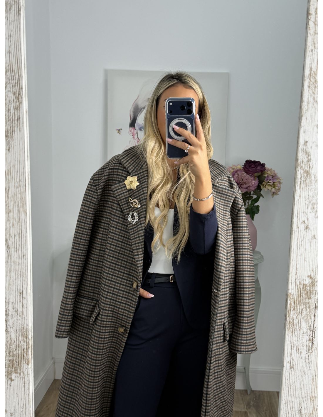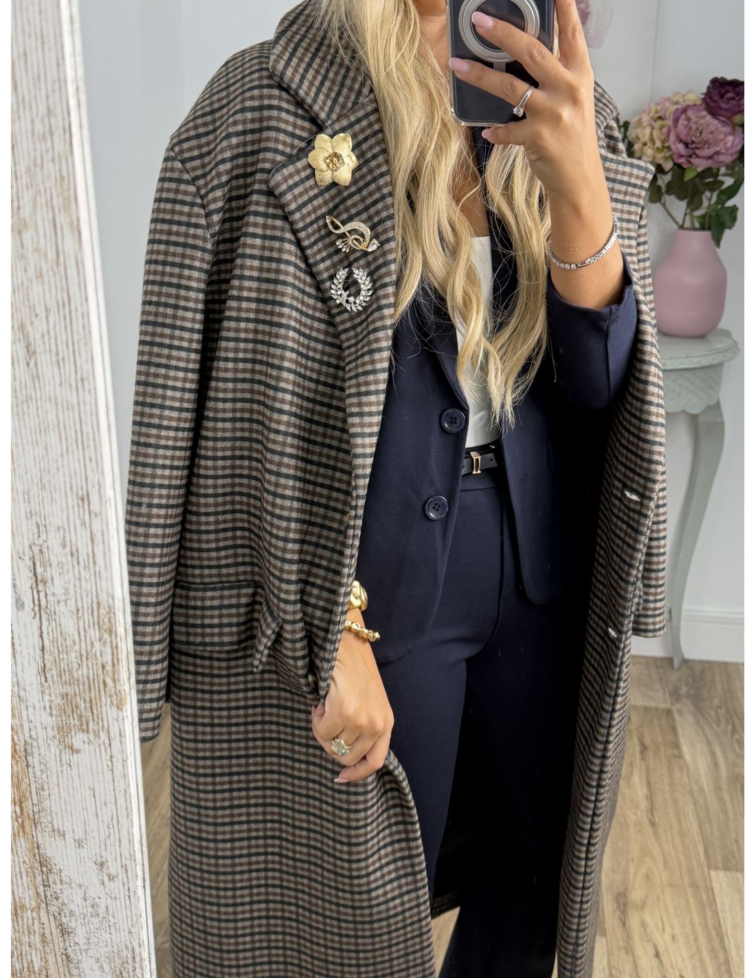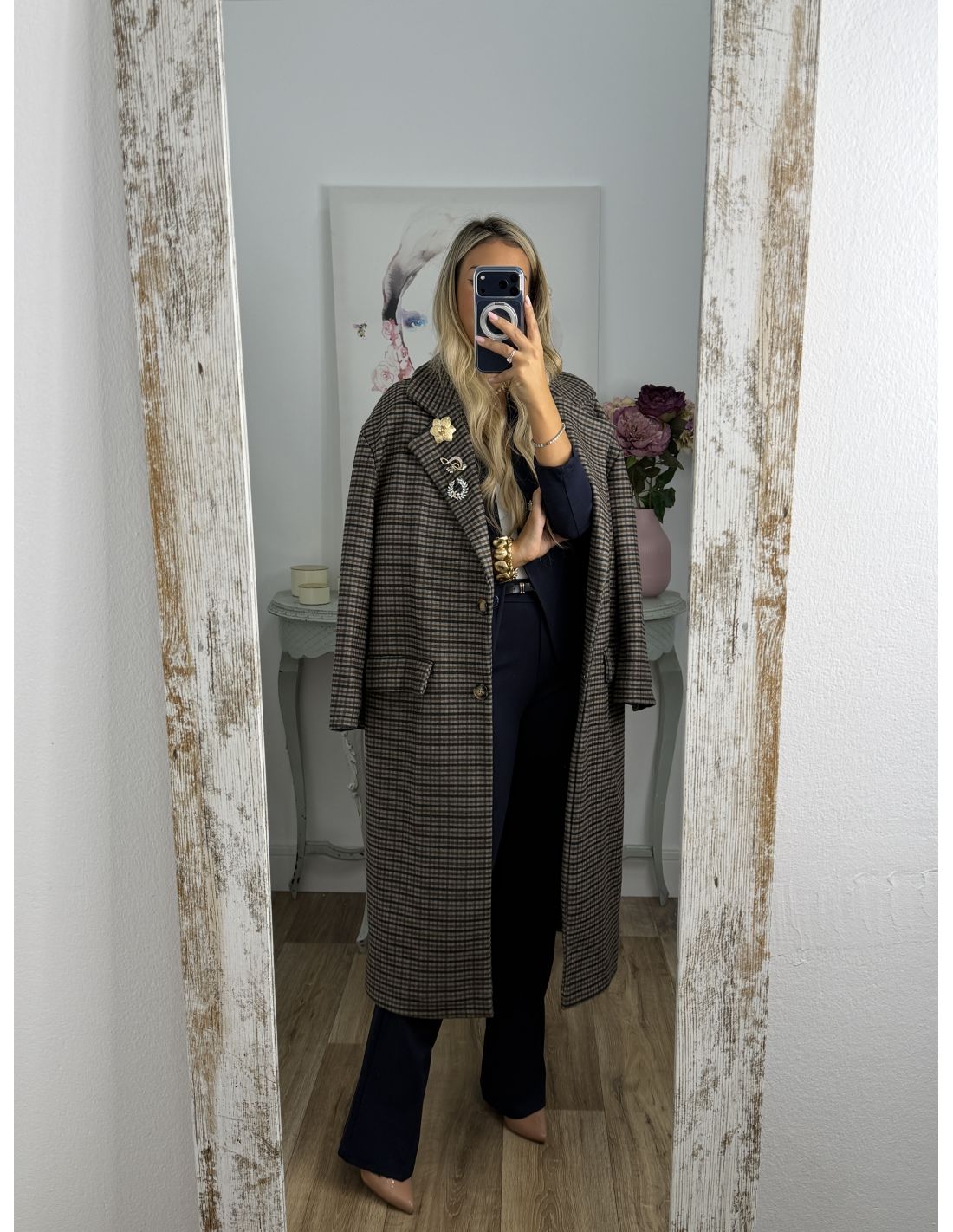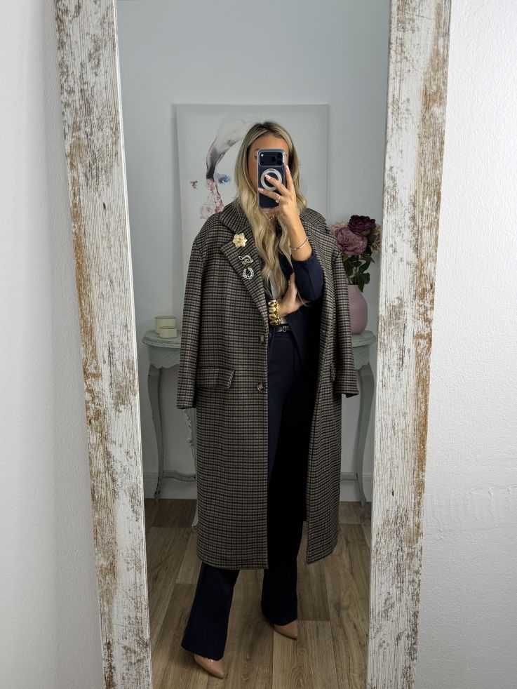 Abrigo de tejido tipo paño, de corte oversize, va forrado. Tiene bolsillos y lleva unos broches en la solapa que se pueden quitar.