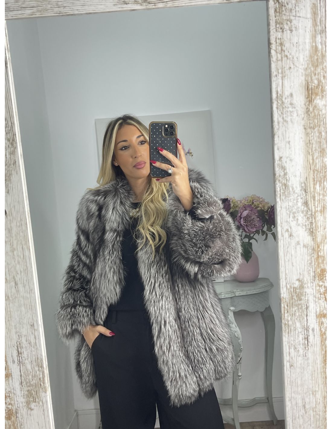 Abrigo de pelo largo natural de zorro. Lleva enganches para cerrarlo. Tiene bolsillos y es de cuello a la caja.