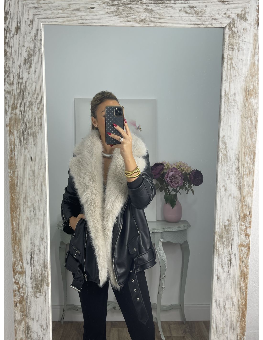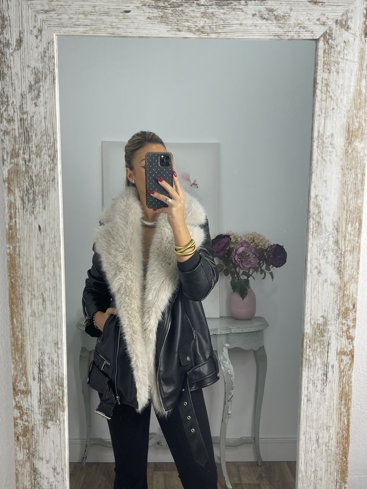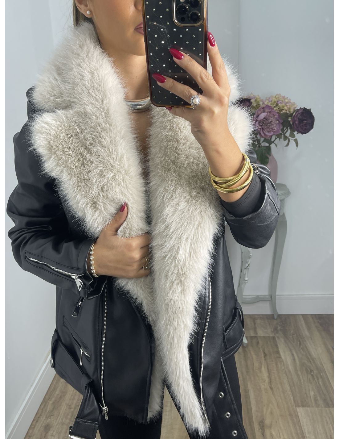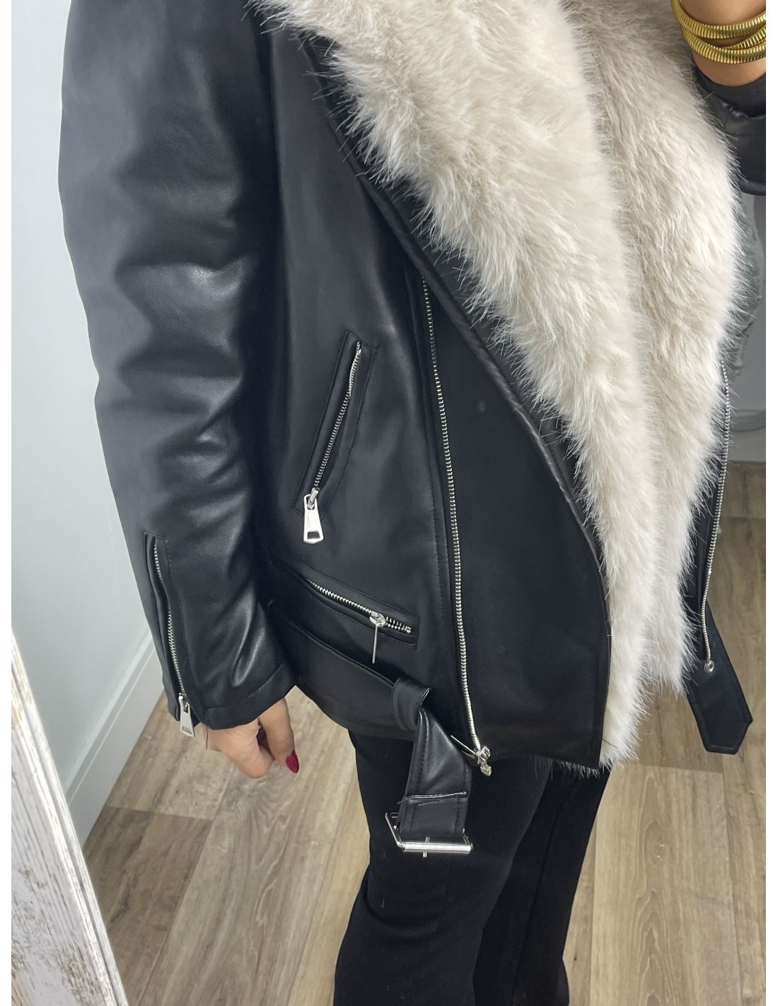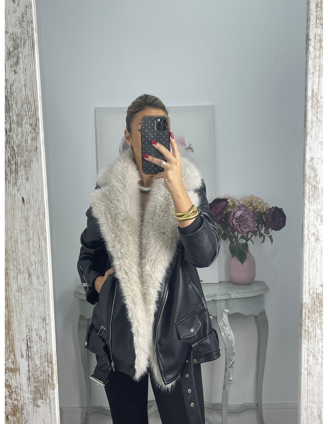 Abrigo de poli piel combinado con pelo sintético, El pelo del cuello se puede quitar. Las cremalleras que llevan son plateadas. El interior del abrigo va forrado de pelo, a excepción de las mangas. Tiene corte oversize.