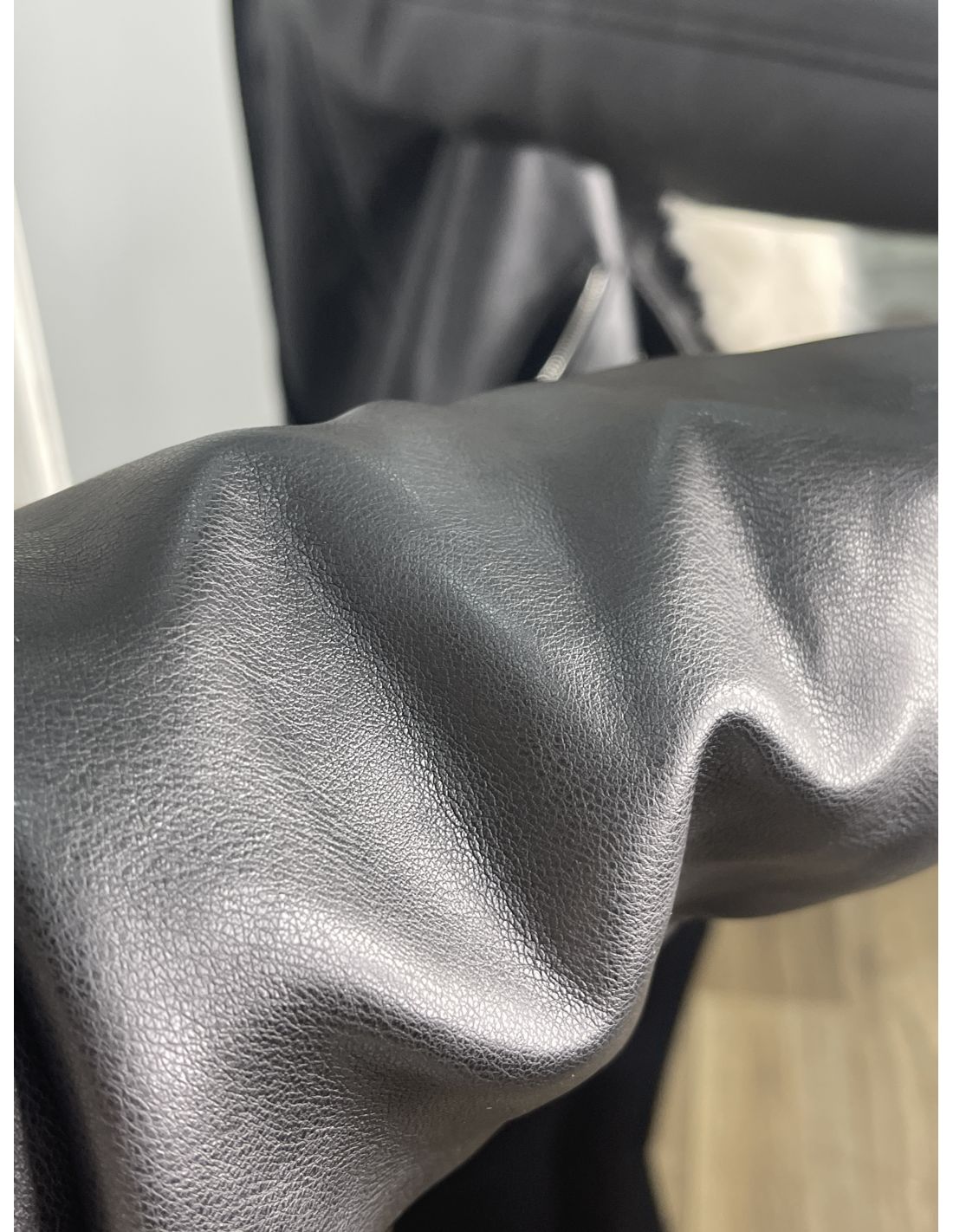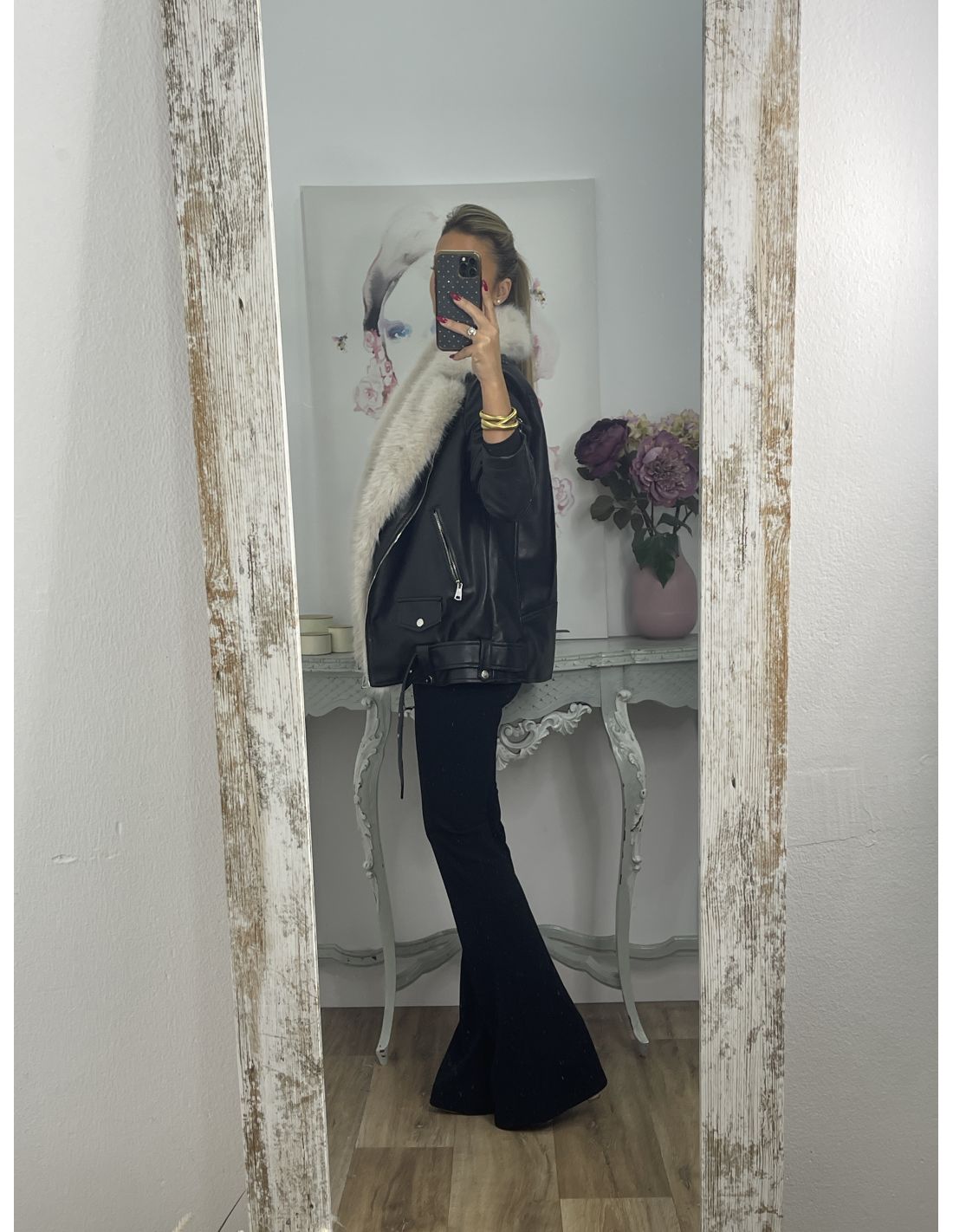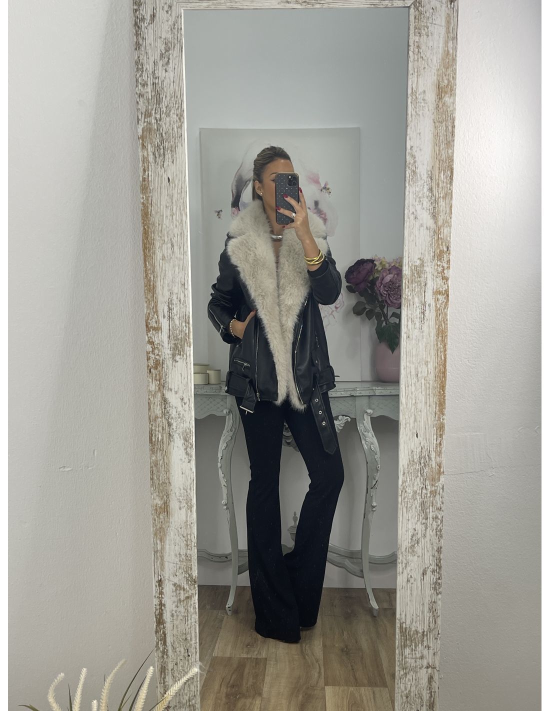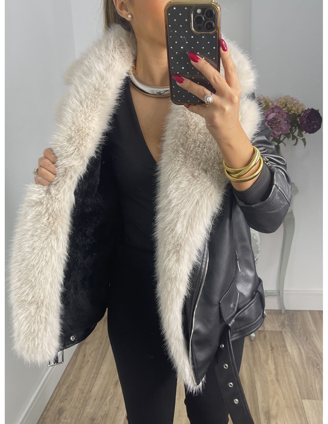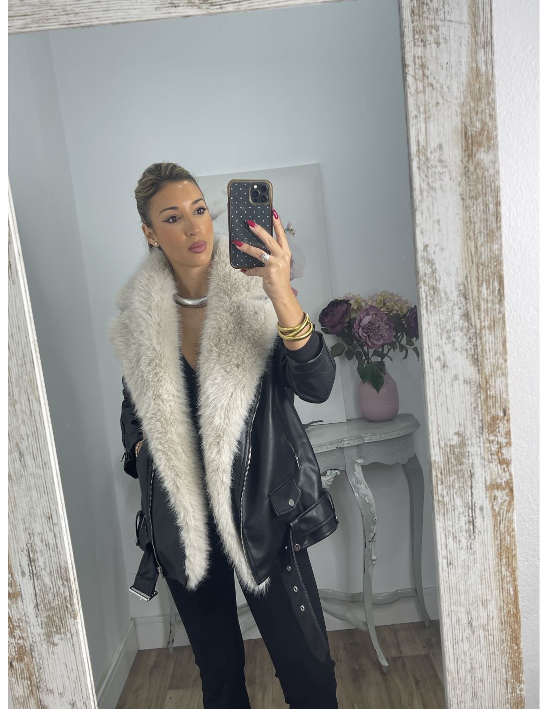 Abrigo de poli piel combinado con pelo sintético, El pelo del cuello se puede quitar. Las cremalleras que llevan son plateadas. El interior del abrigo va forrado de pelo, a excepción de las mangas. Tiene corte oversize.