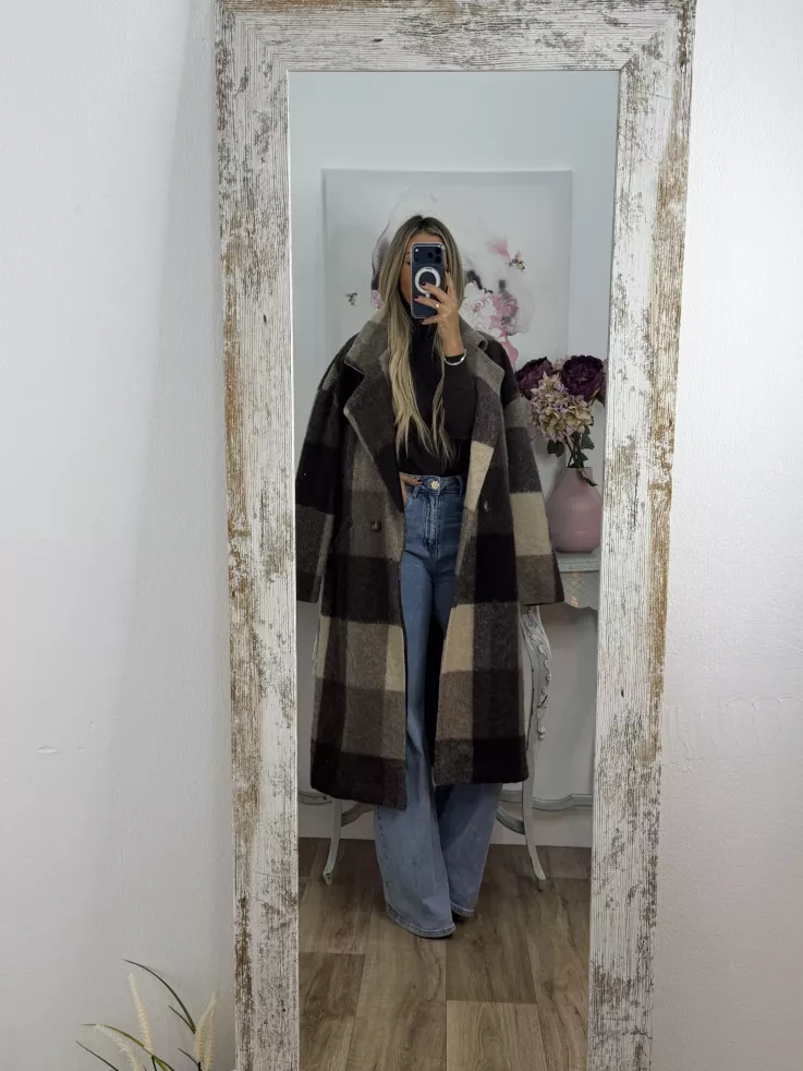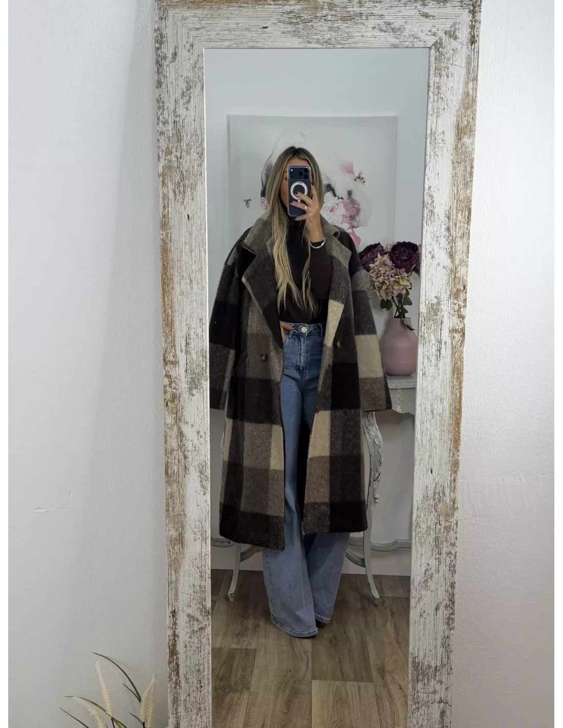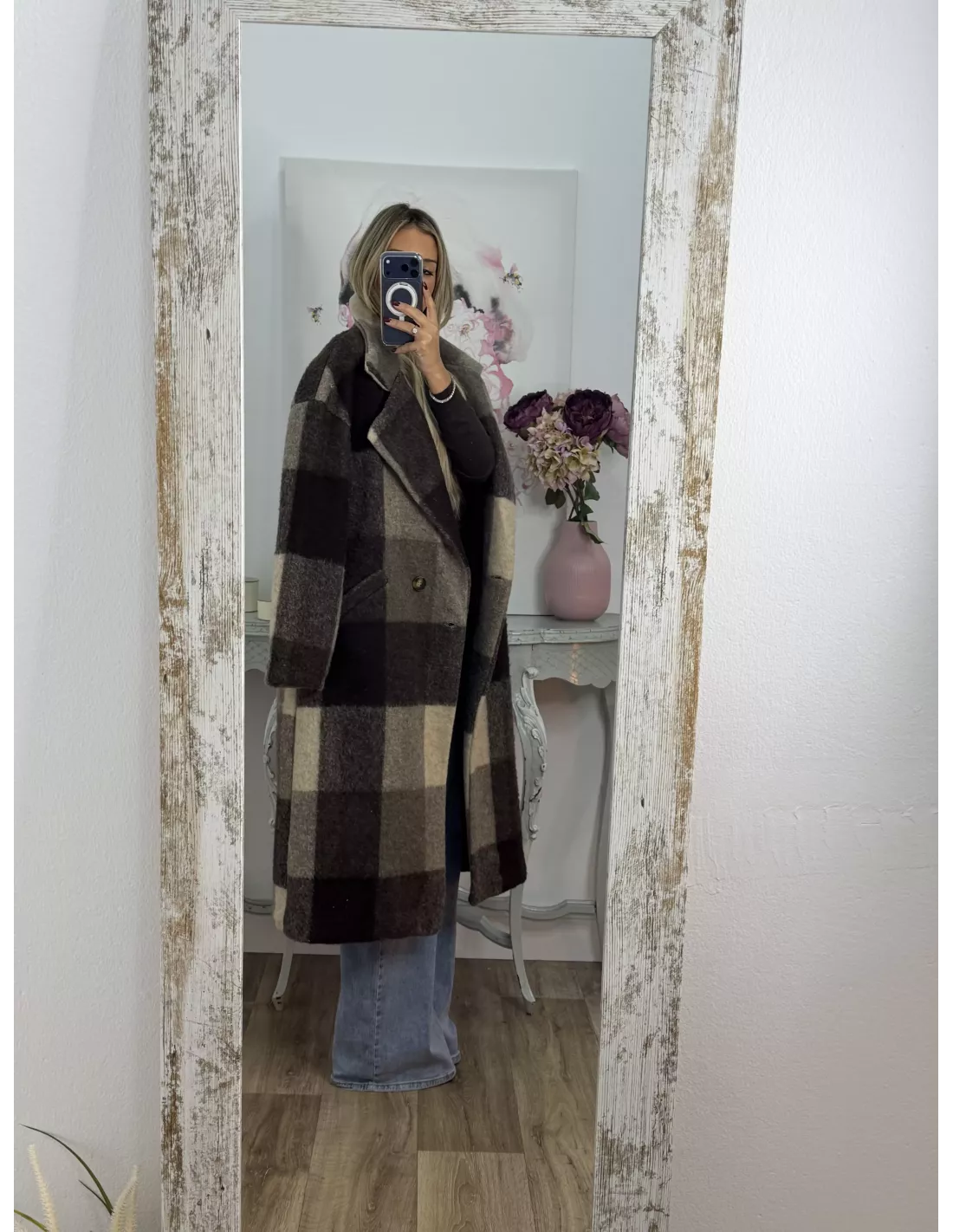 Abrigo de lana, con estampado de cuadros, de corte oversize, va forrado. Tiene bolsillos.