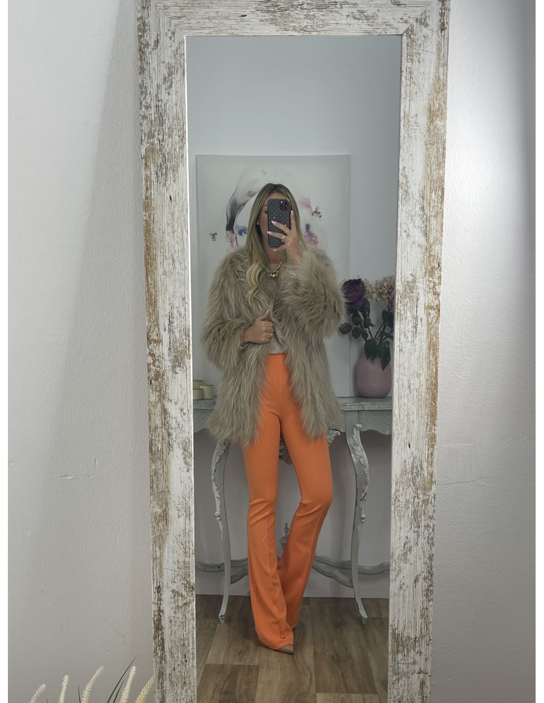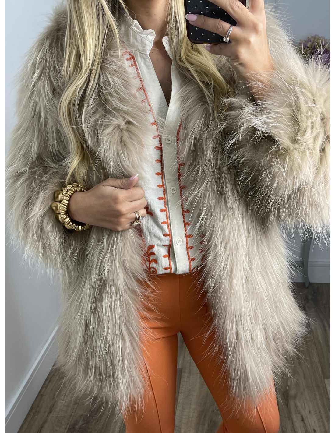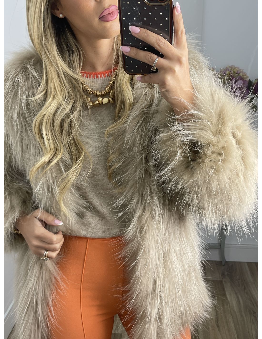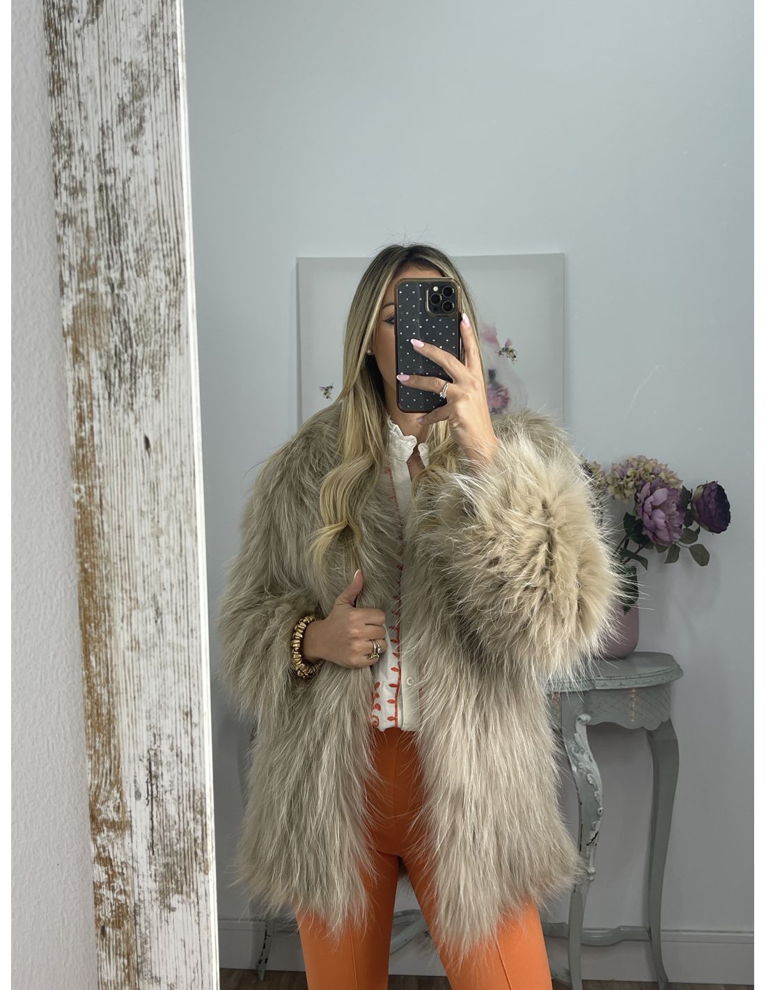 Abrigo de pelo natural, que se cierra con enganches el Cortes recto. No va forrado.