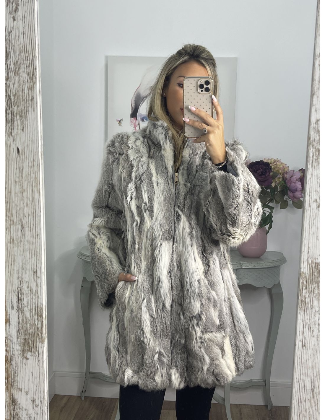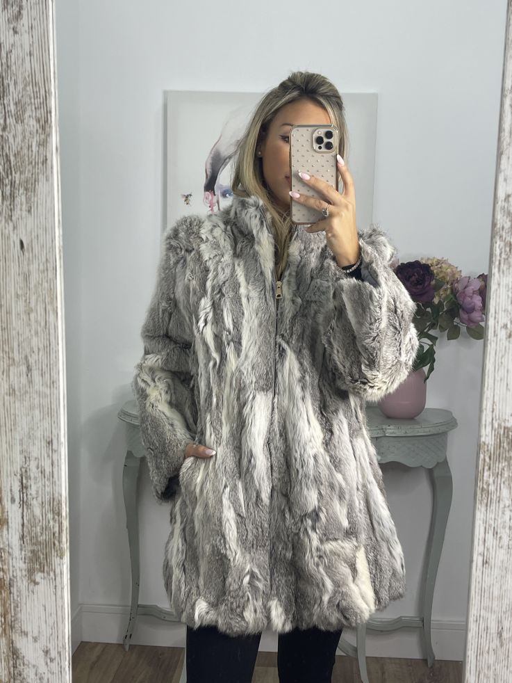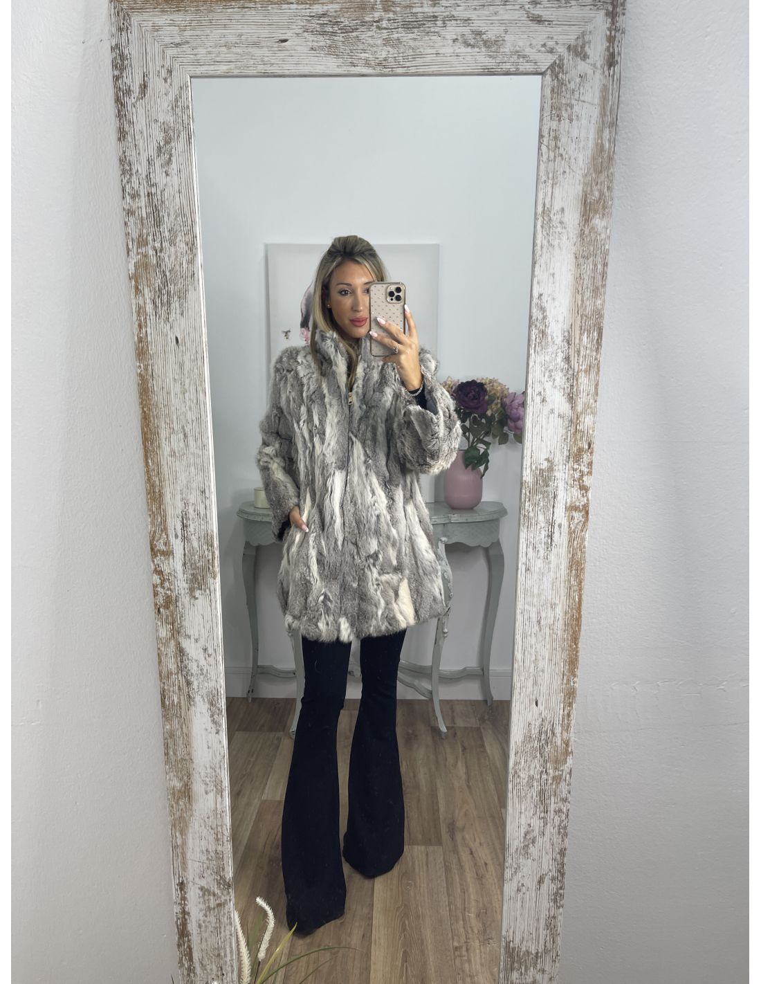 Abrigo de conejo. Va forrado, es de manga larga y tiene bolsillos.