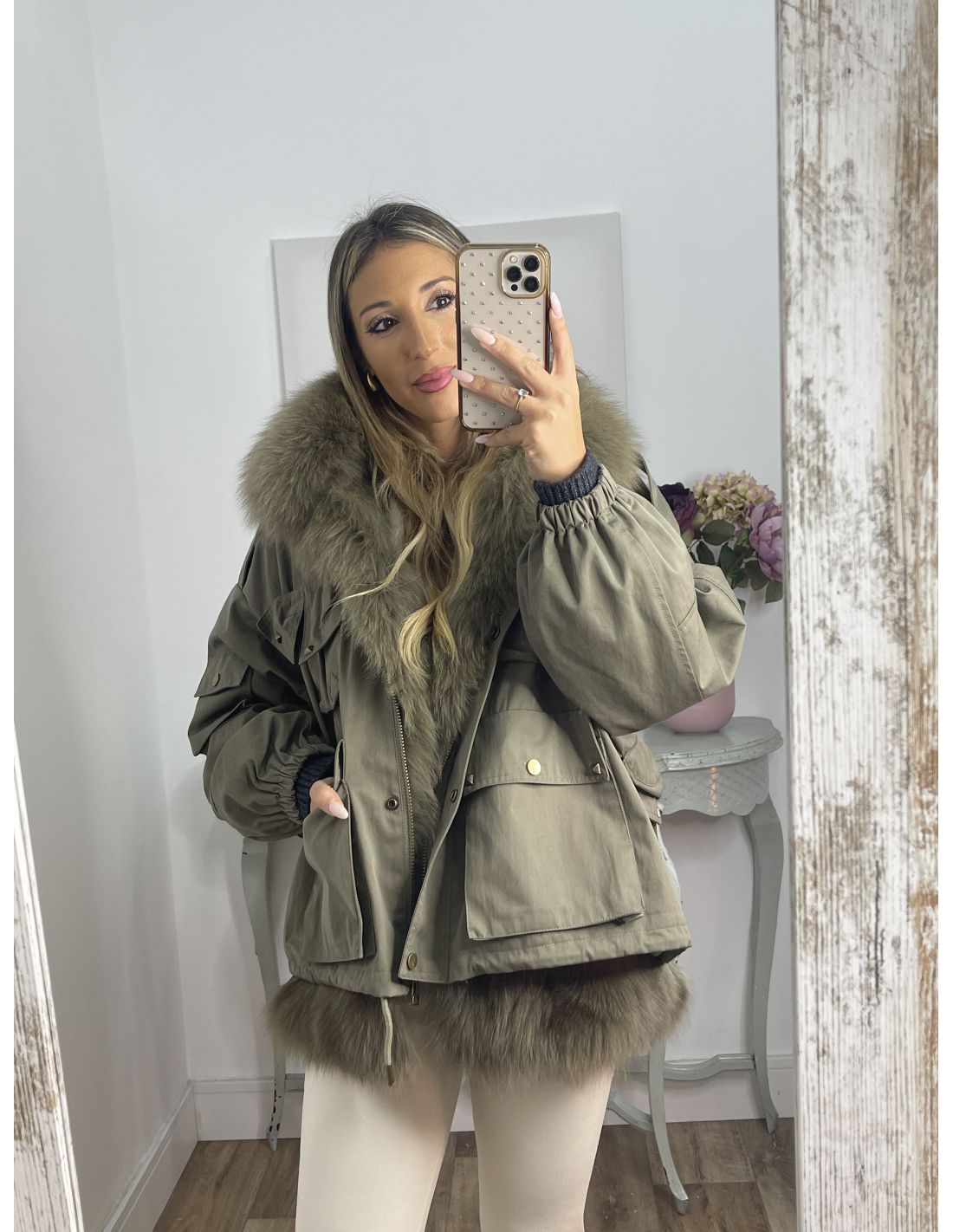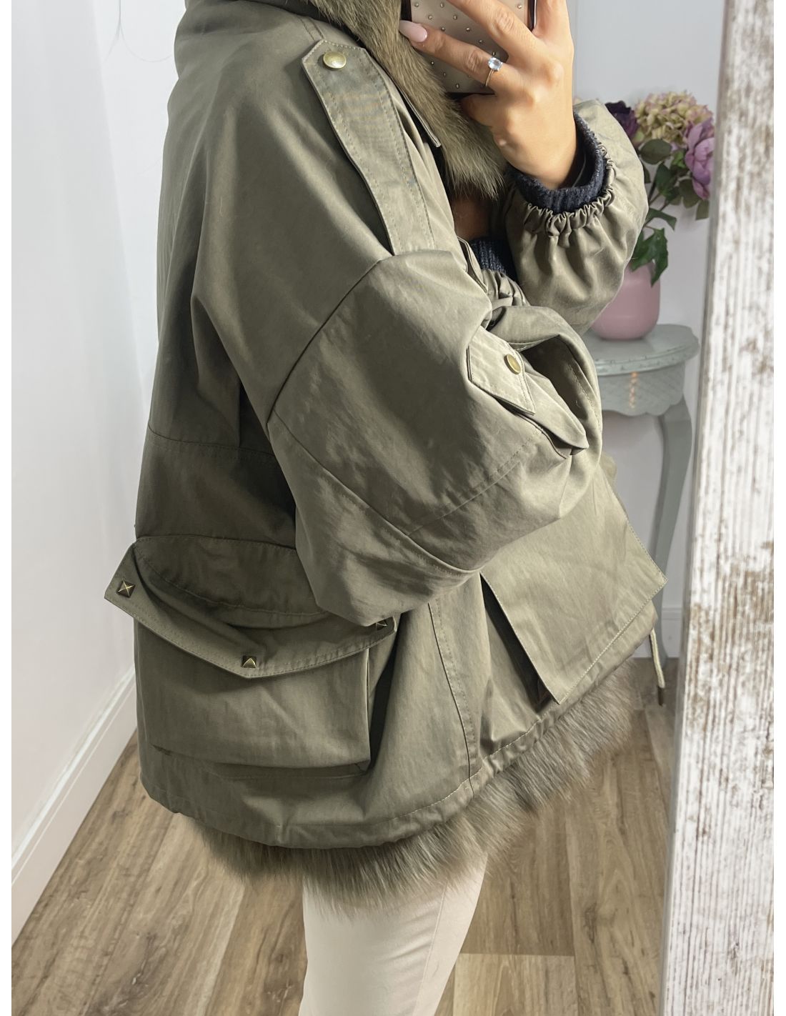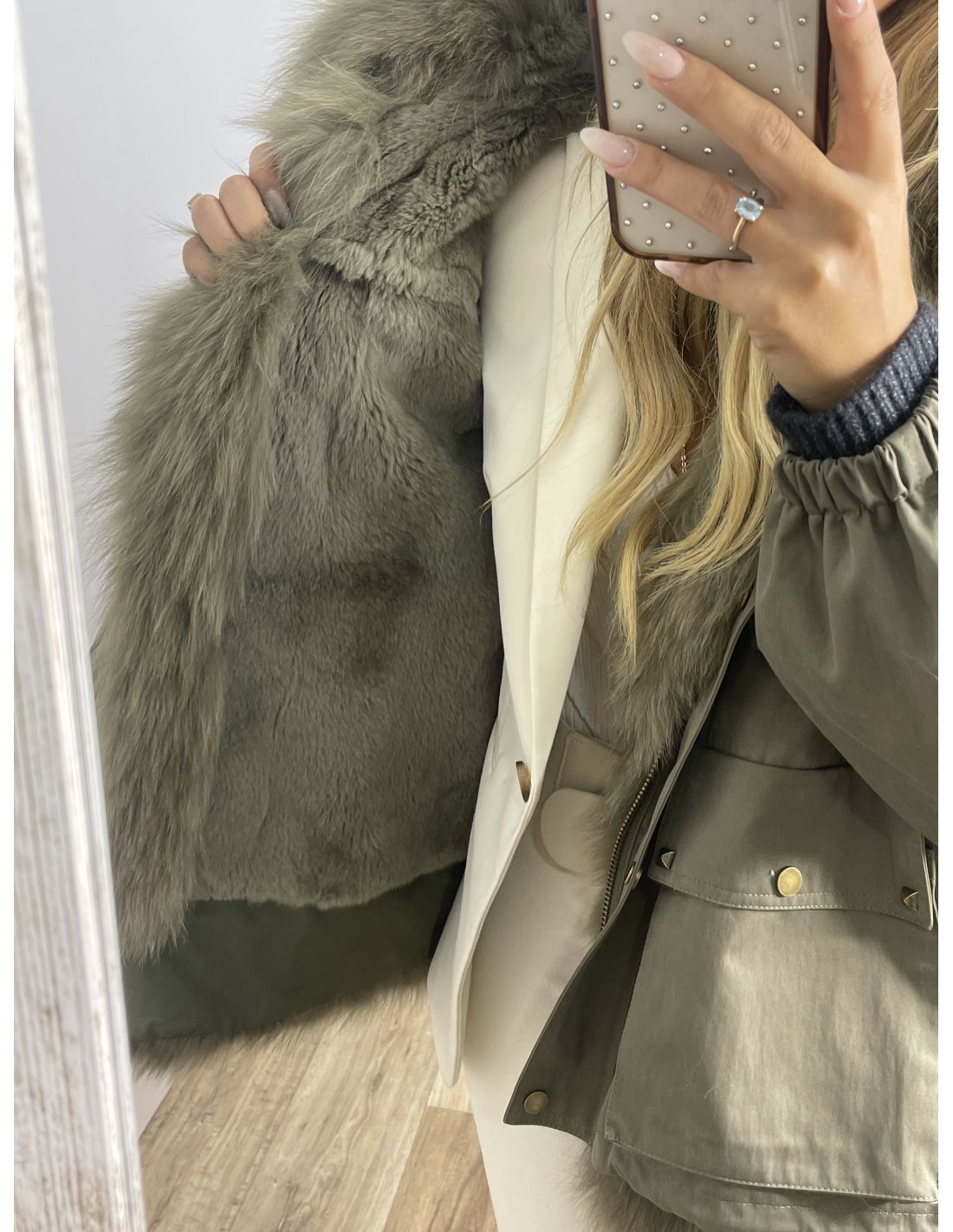 Abrigo tipo parka de corte muy oversize. Forrado de pelo de zorro natural por dentro, a excepción de las mangas que son de punto. Se le quita el pelo de dentro, se puede utilizar por separado.