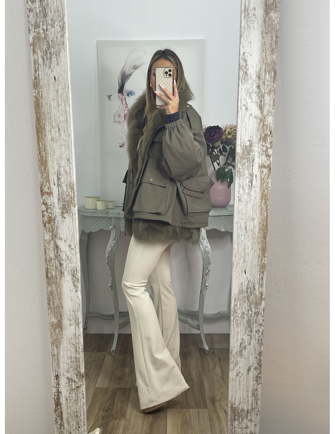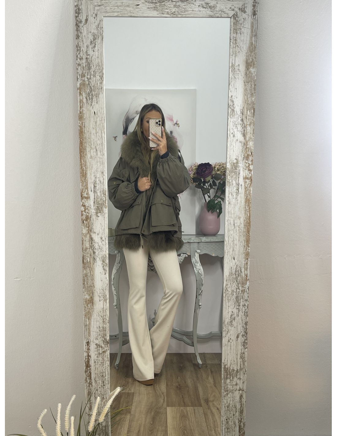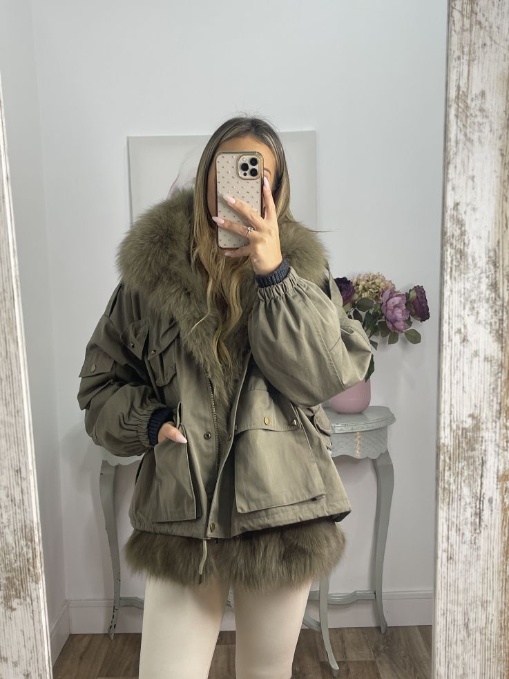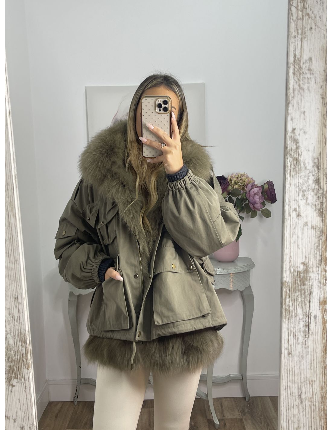 Abrigo tipo parka de corte muy oversize. Forrado de pelo de zorro natural por dentro, a excepción de las mangas que son de punto. Se le quita el pelo de dentro, se puede utilizar por separado.