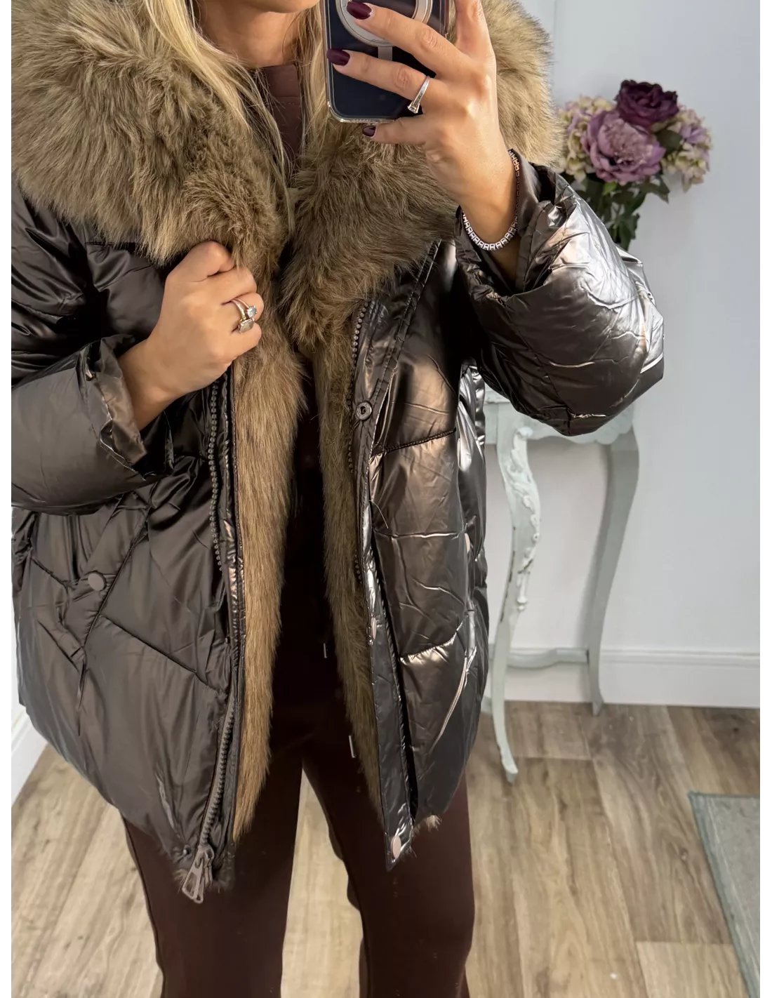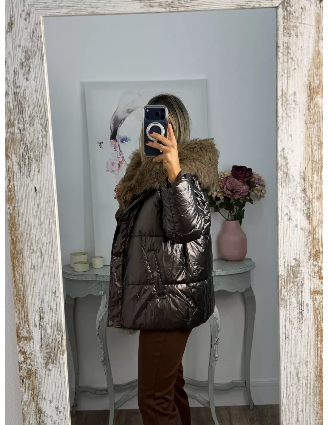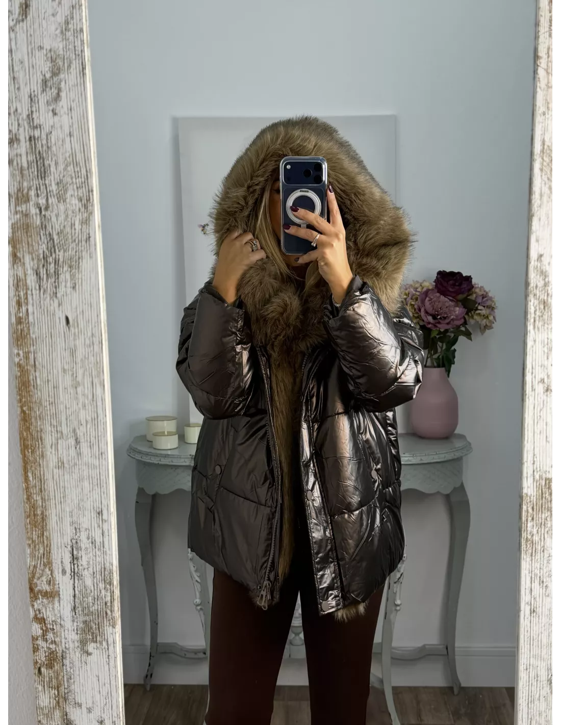 Abrigo de efecto metalizado. Lleva capucha que no se puede quitar. El pelo si se puede quitar, el pelo es sintético. El corte es oversize y recto.