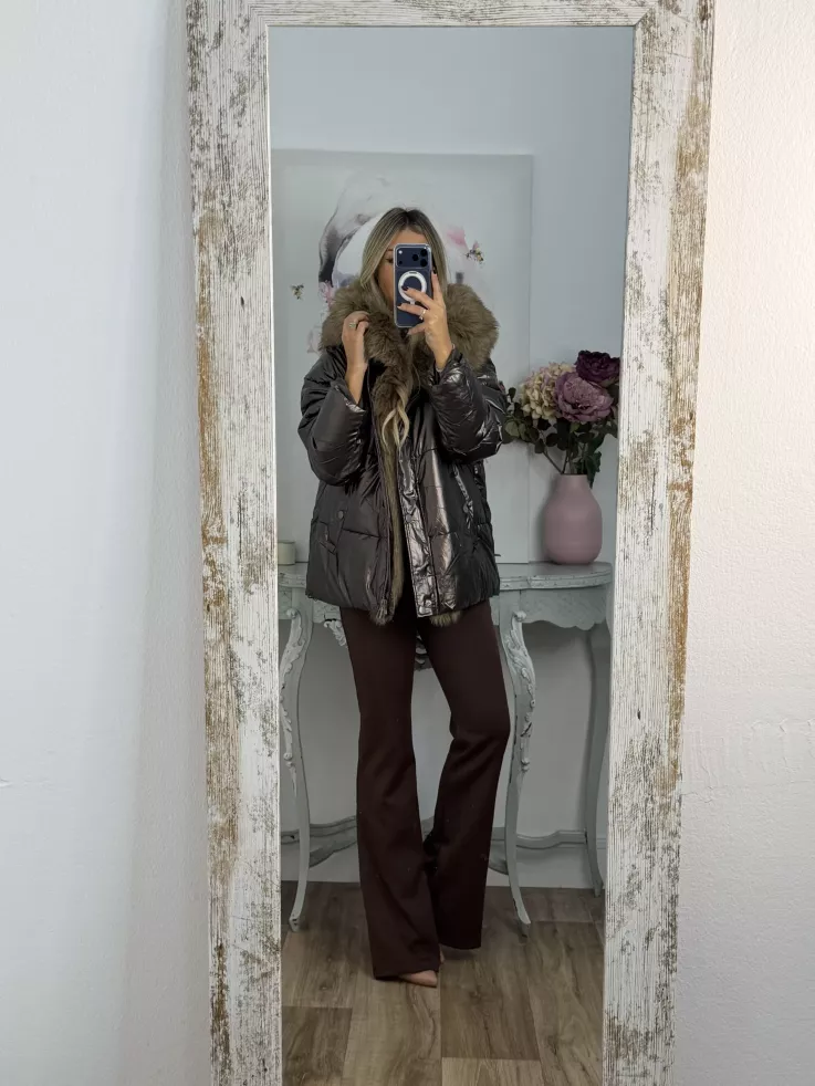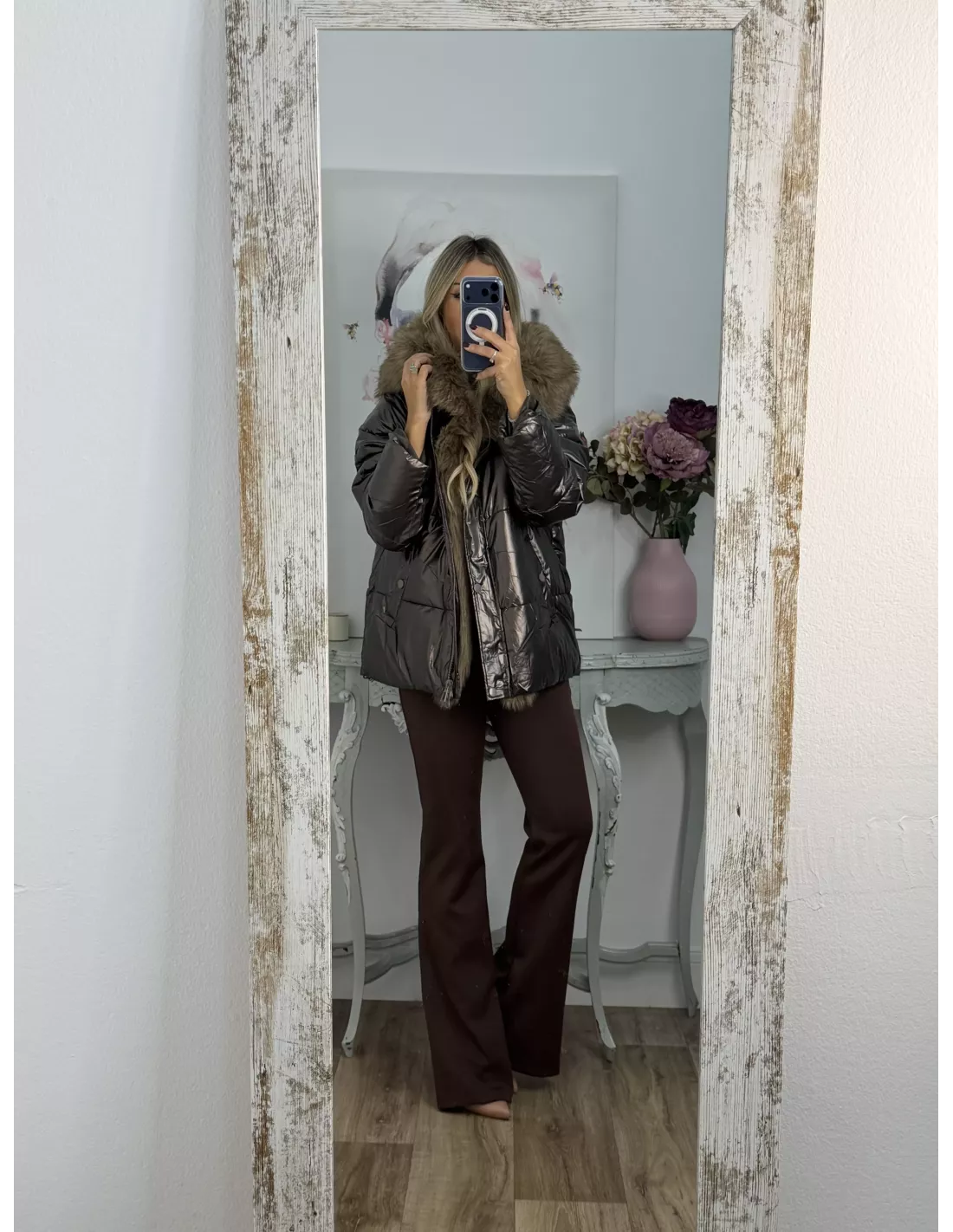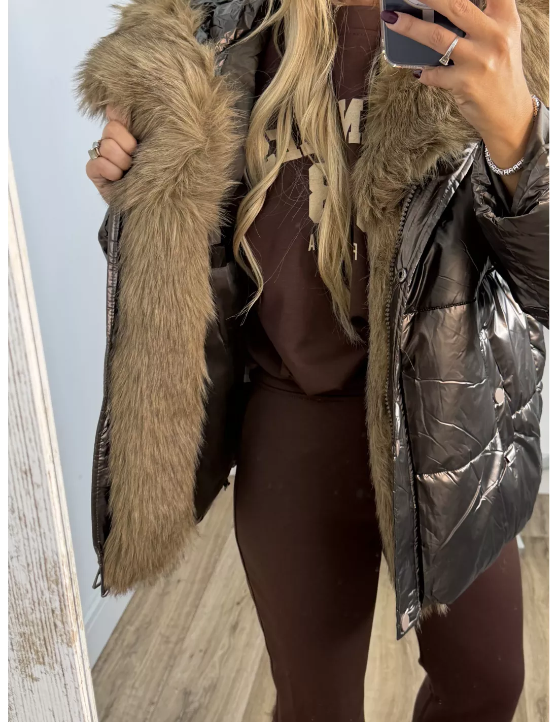 Abrigo de efecto metalizado. Lleva capucha que no se puede quitar. El pelo si se puede quitar, el pelo es sintético. El corte es oversize y recto.