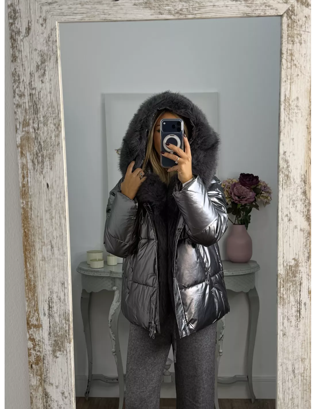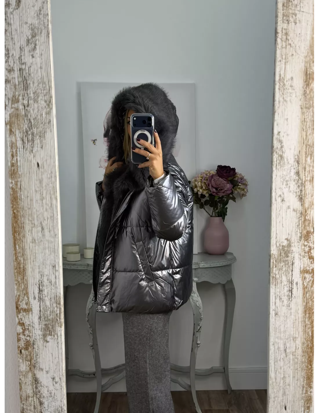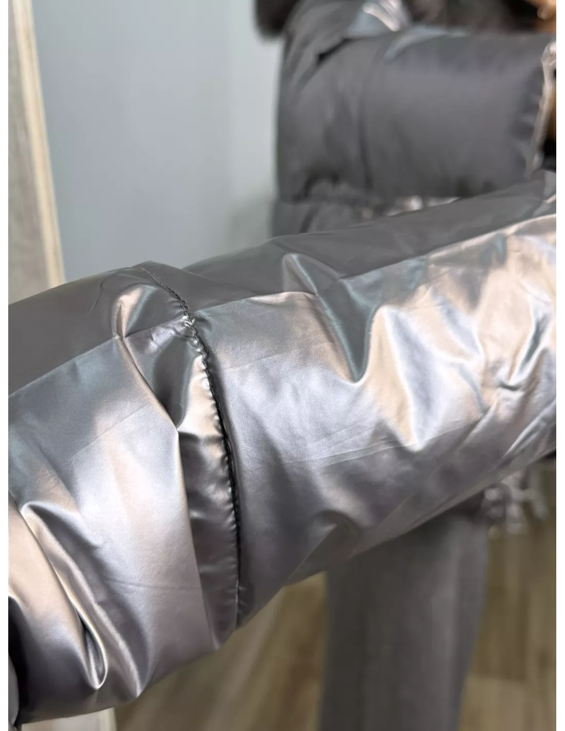 Abrigo de efecto metalizado. Lleva capucha que no se puede quitar. El pelo si se puede quitar, el pelo es sintético. El corte es oversize y recto.