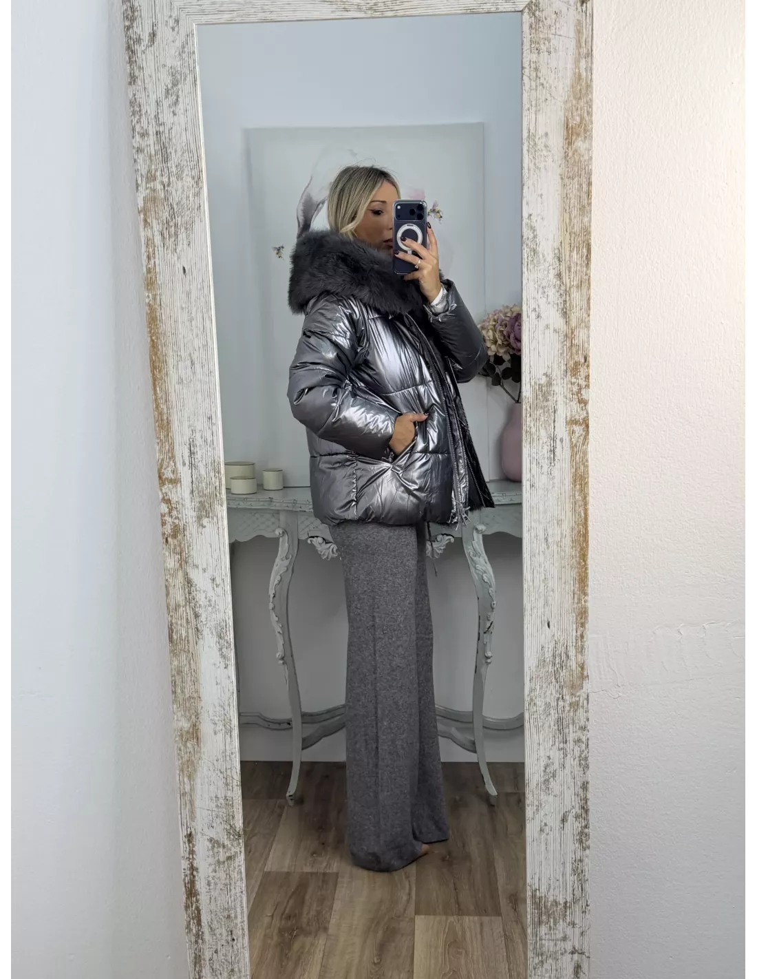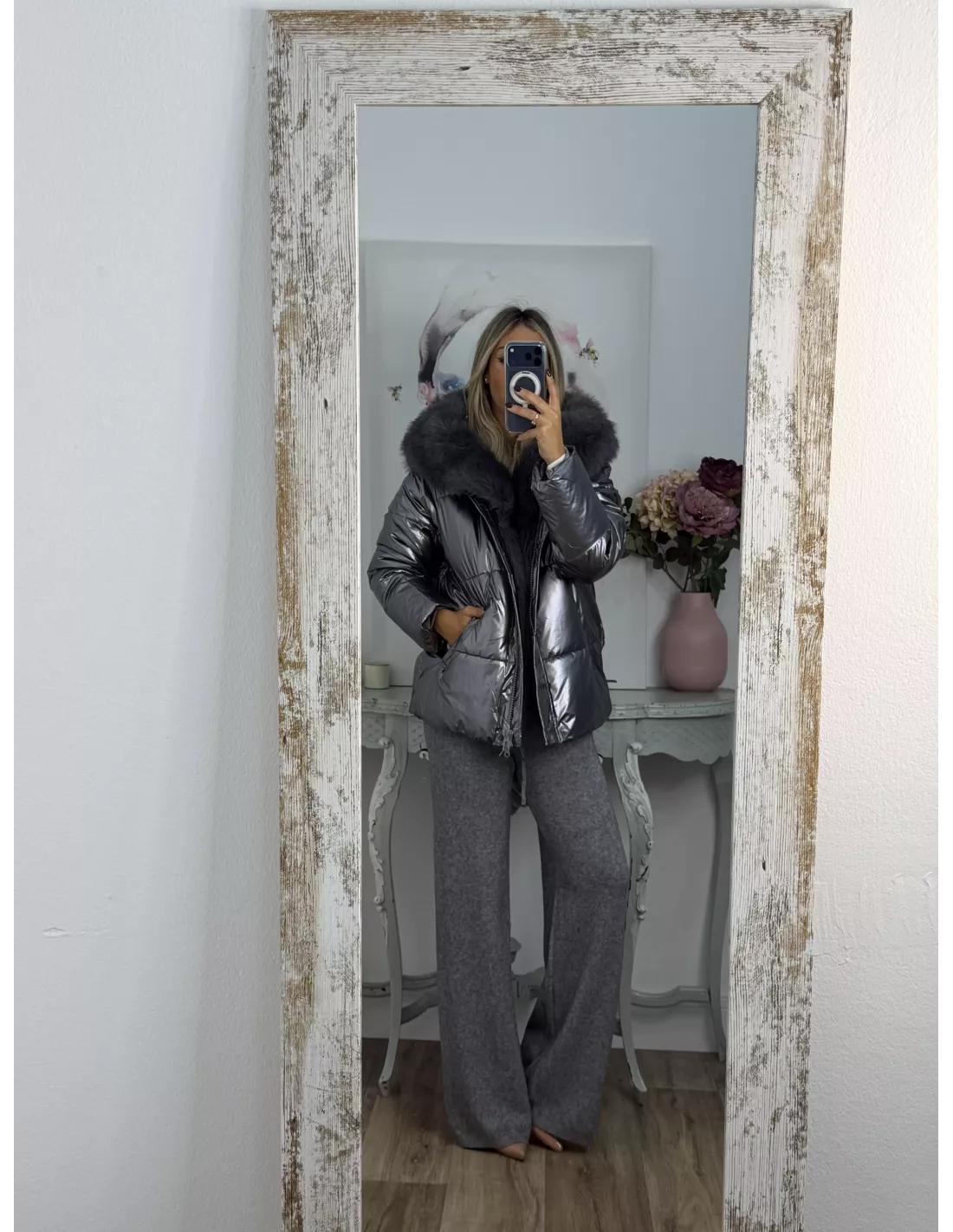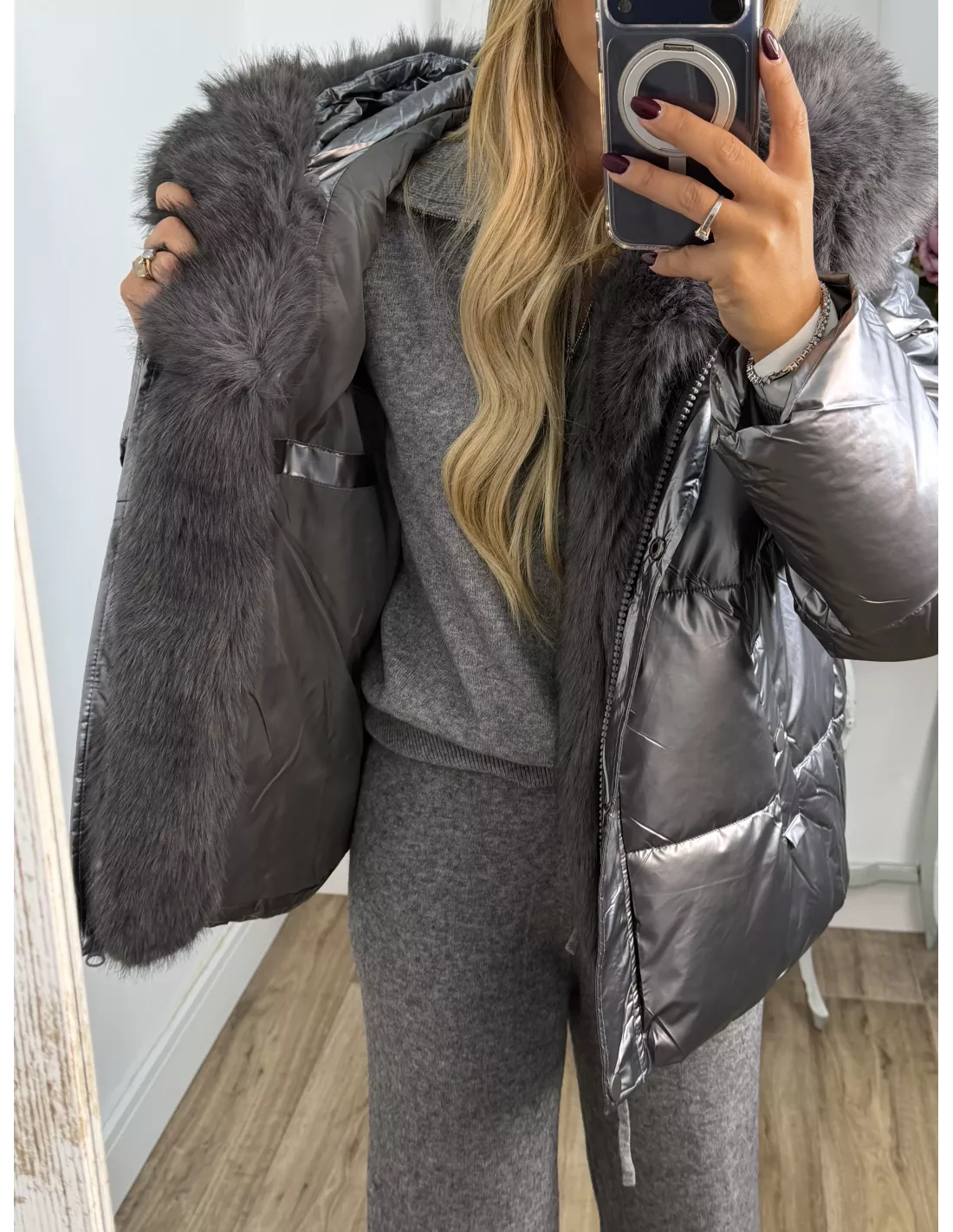 Abrigo de efecto metalizado. Lleva capucha que no se puede quitar. El pelo si se puede quitar, el pelo es sintético. El corte es oversize y recto.