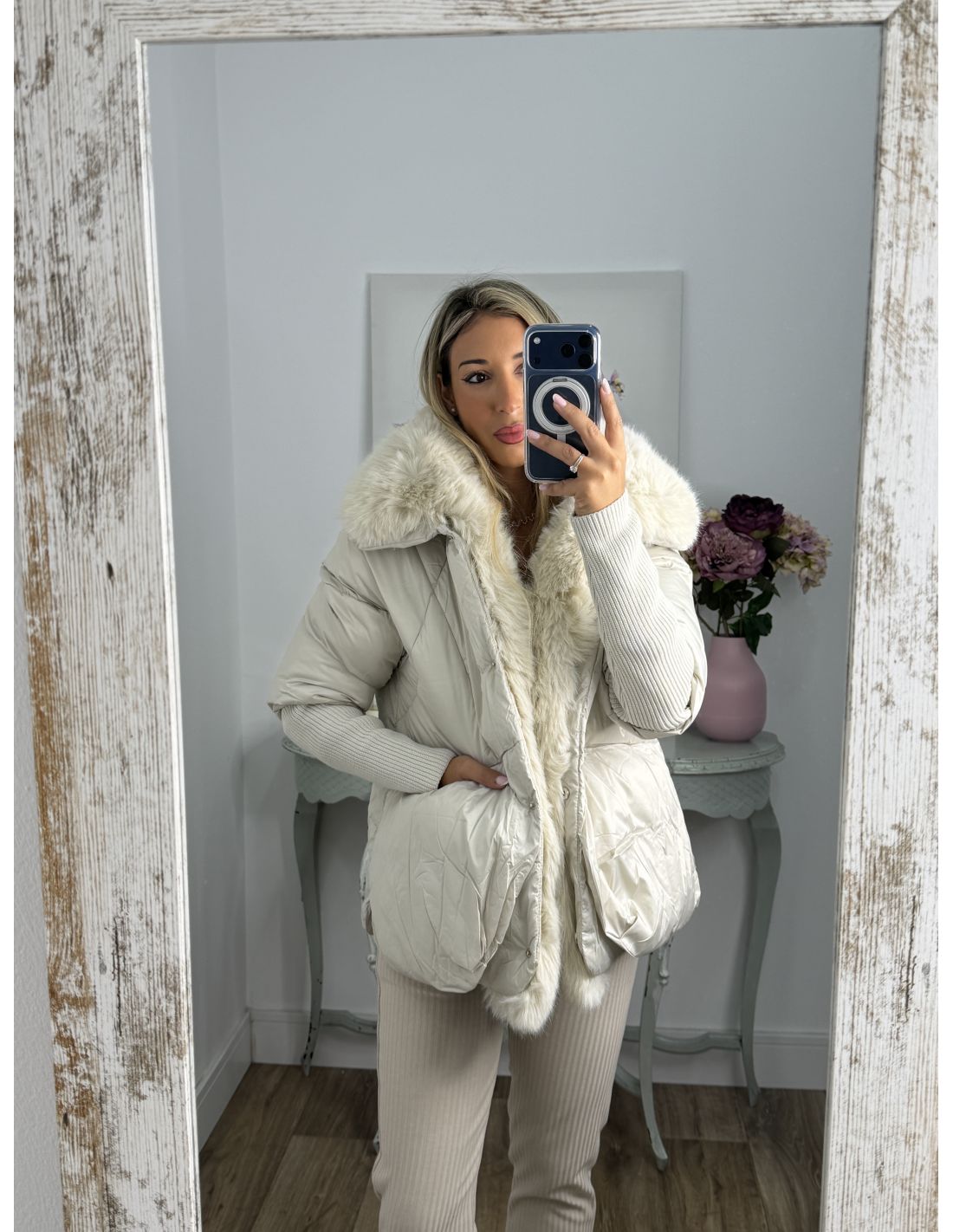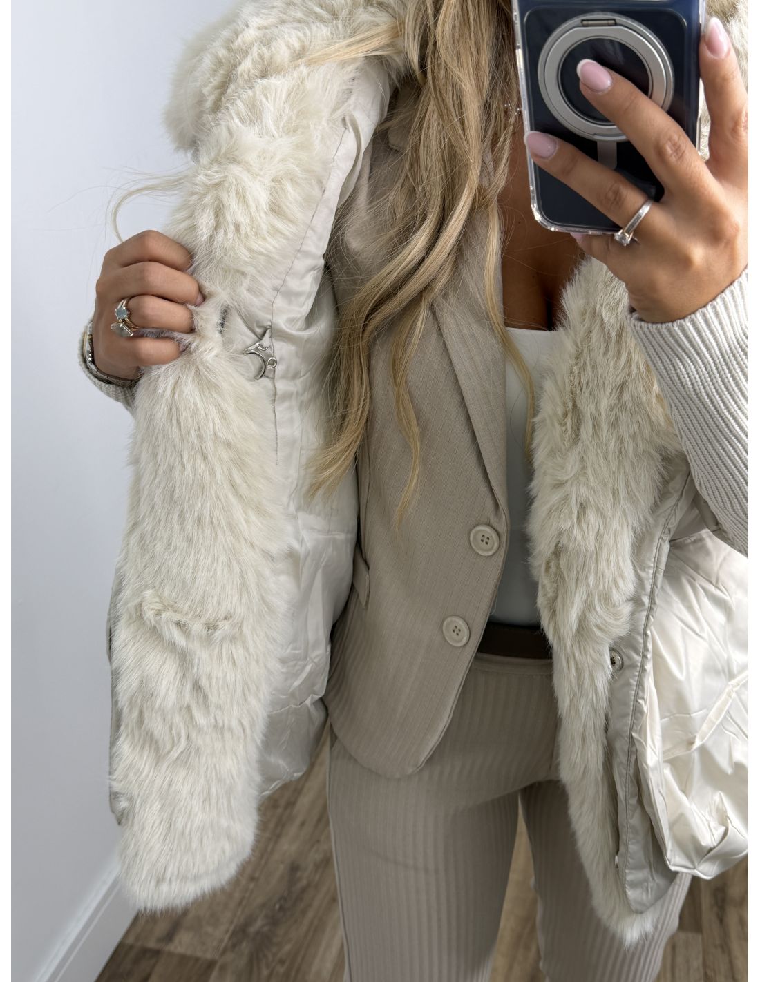 Abrigo que lleva pelo sintético que se pude quitar. Se cierra con botones de clips plateados. La zona de la manga lleva un puño grande y ajustado de punto de canalé. Recomendamos coger la talla habitual y si estás entre dos tallas y utilizas jersey grueso coger la talla mayor.