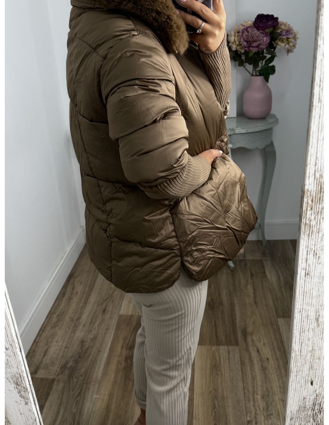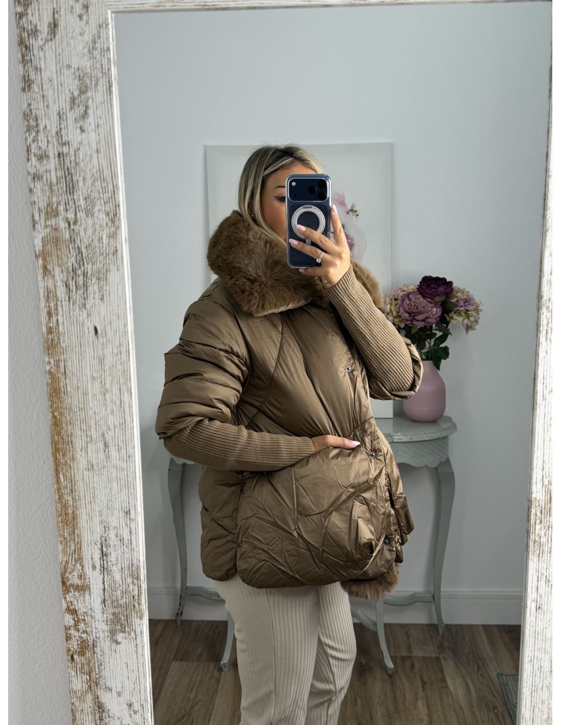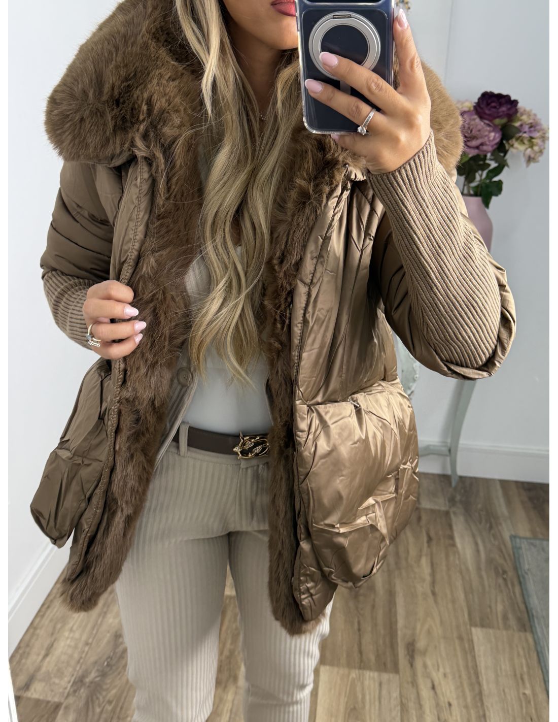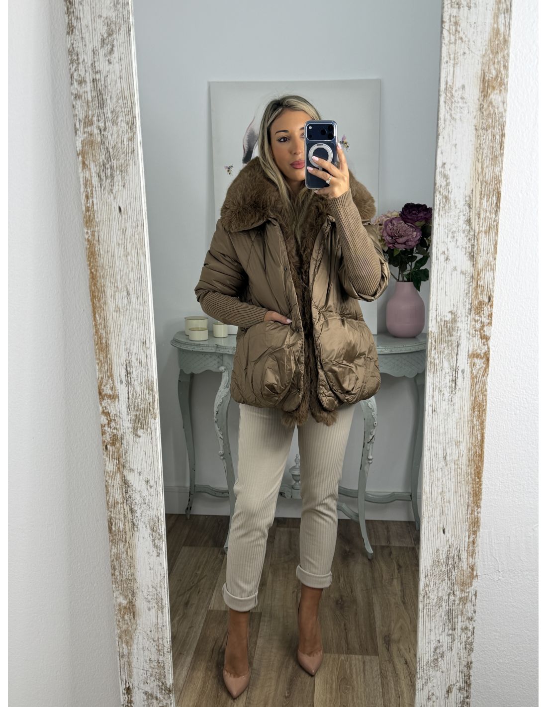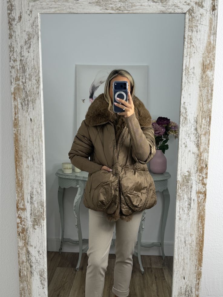 Abrigo que lleva pelo sintético que se pude quitar. Se cierra con botones de clips plateados. La zona de la manga lleva un puño grande y ajustado de punto de canalé. Recomendamos coger la talla habitual y si estás entre dos tallas y utilizas jersey grueso coger la talla mayor.