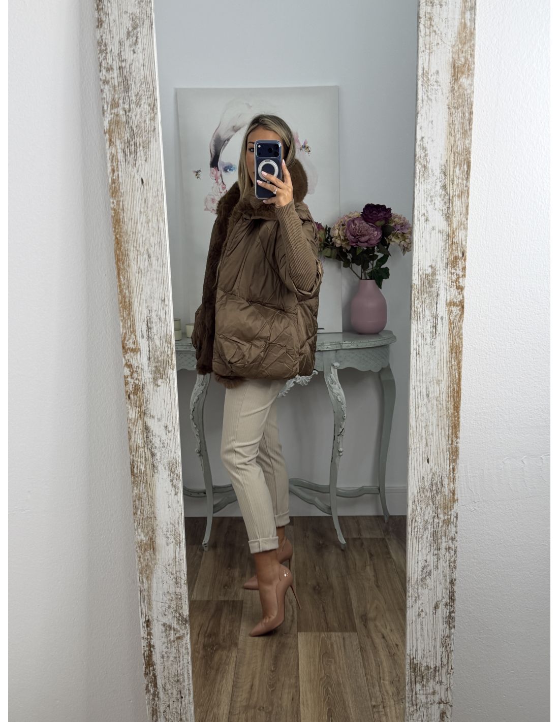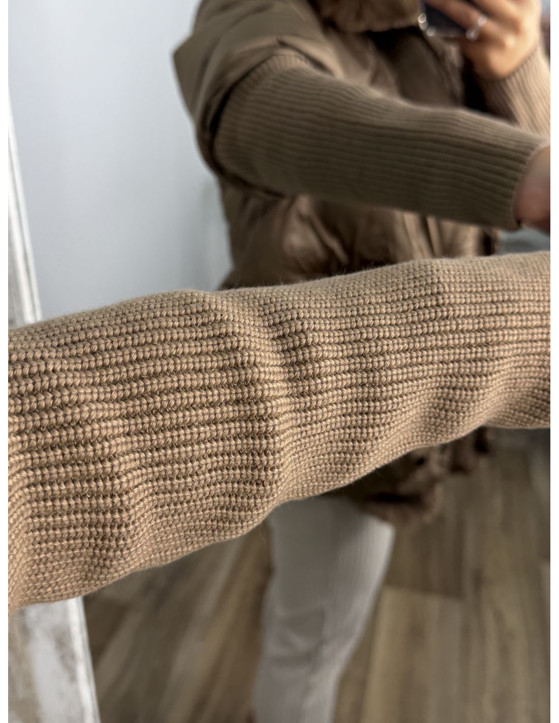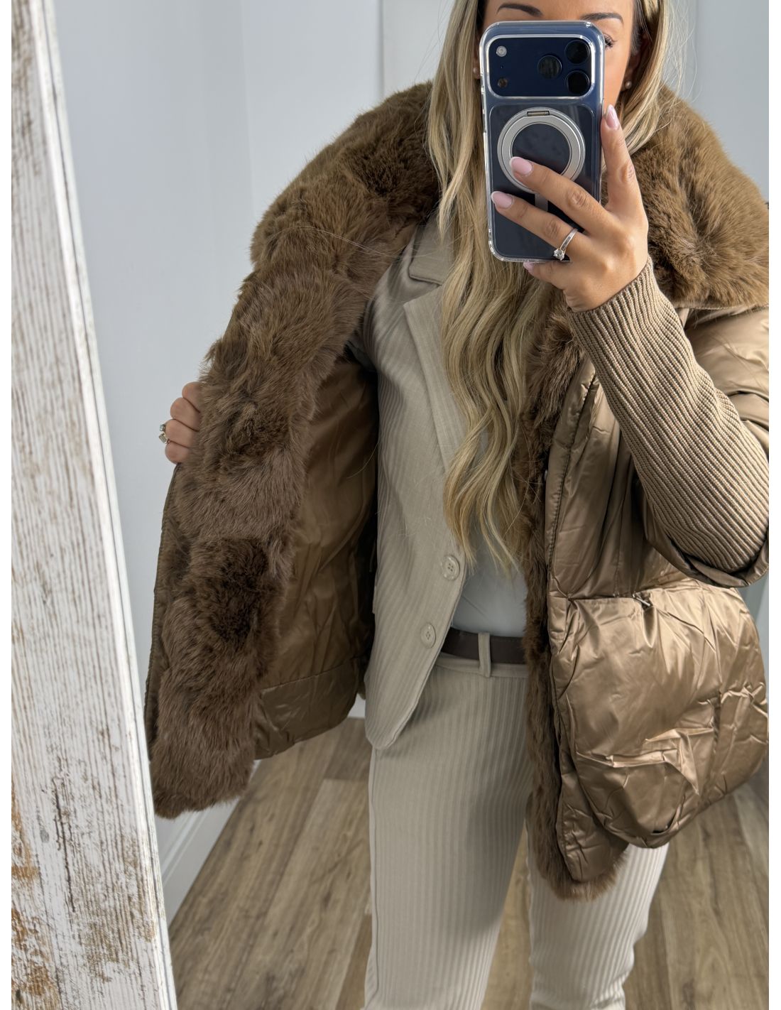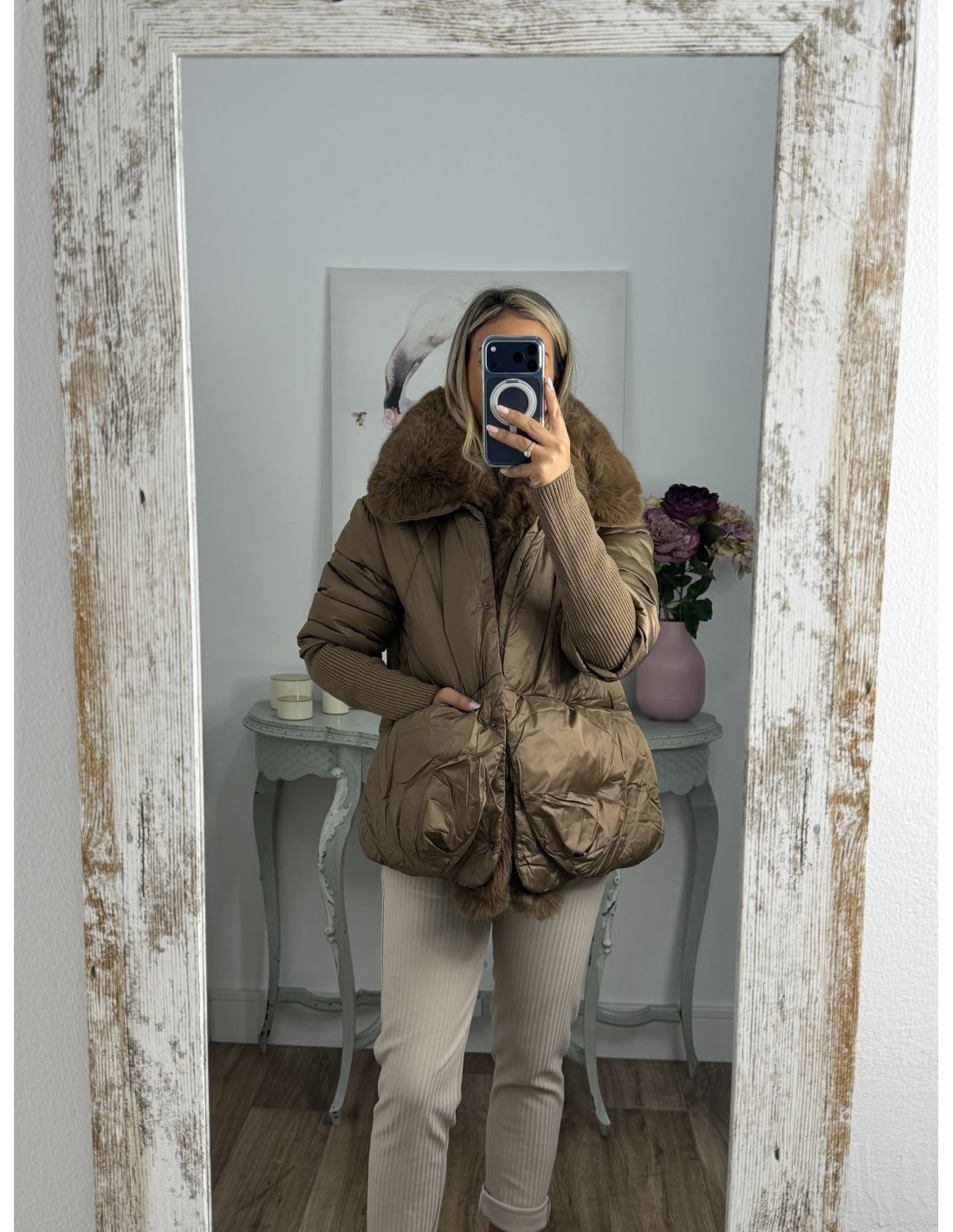 Abrigo que lleva pelo sintético que se pude quitar. Se cierra con botones de clips plateados. La zona de la manga lleva un puño grande y ajustado de punto de canalé. Recomendamos coger la talla habitual y si estás entre dos tallas y utilizas jersey grueso coger la talla mayor.