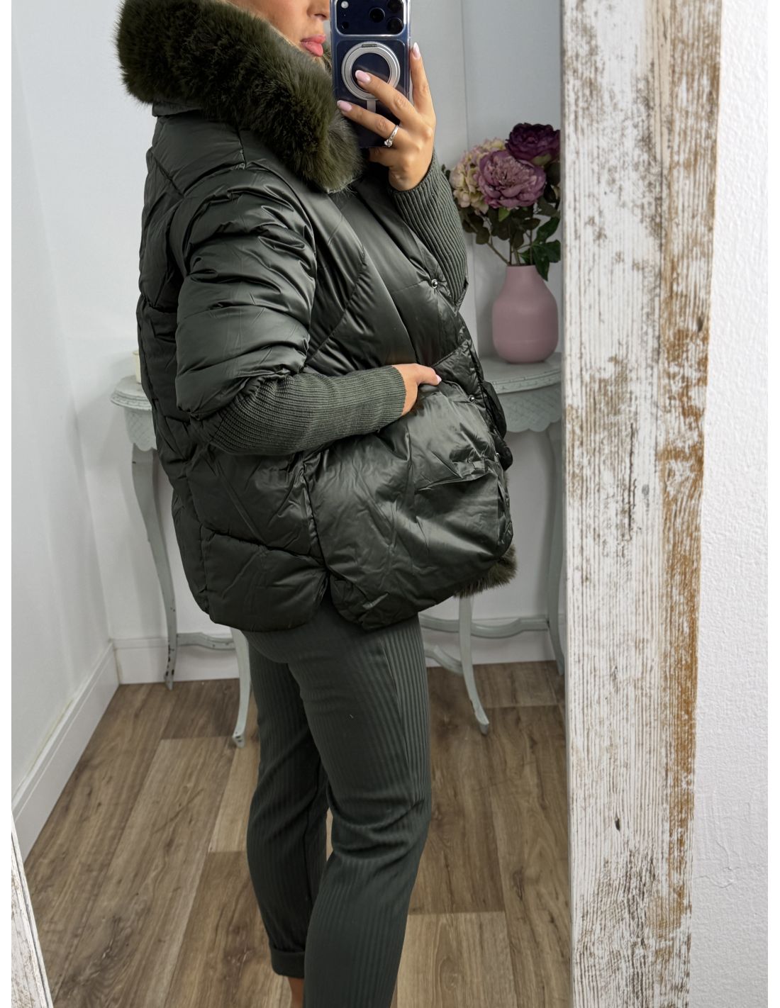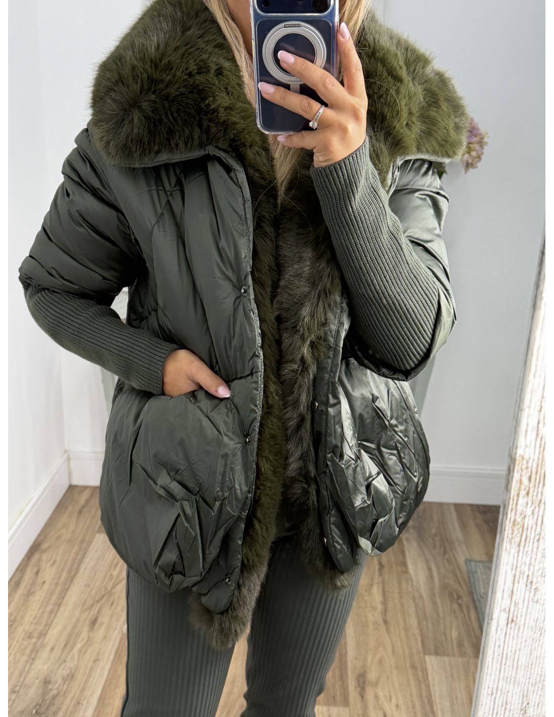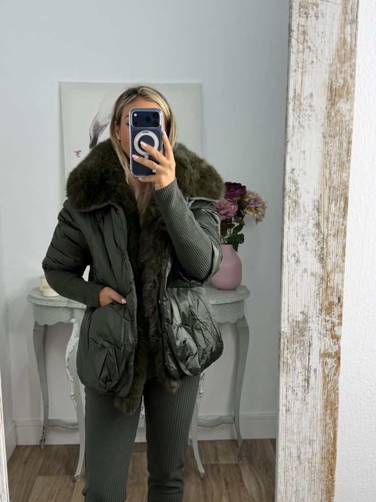 Abrigo que lleva pelo sintético que se pude quitar. Se cierra con botones de clips plateados. La zona de la manga lleva un puño grande y ajustado de punto de canalé. Recomendamos coger la talla habitual y si estás entre dos tallas y utilizas jersey grueso coger la talla mayor.