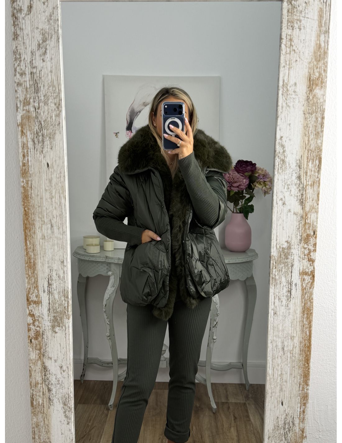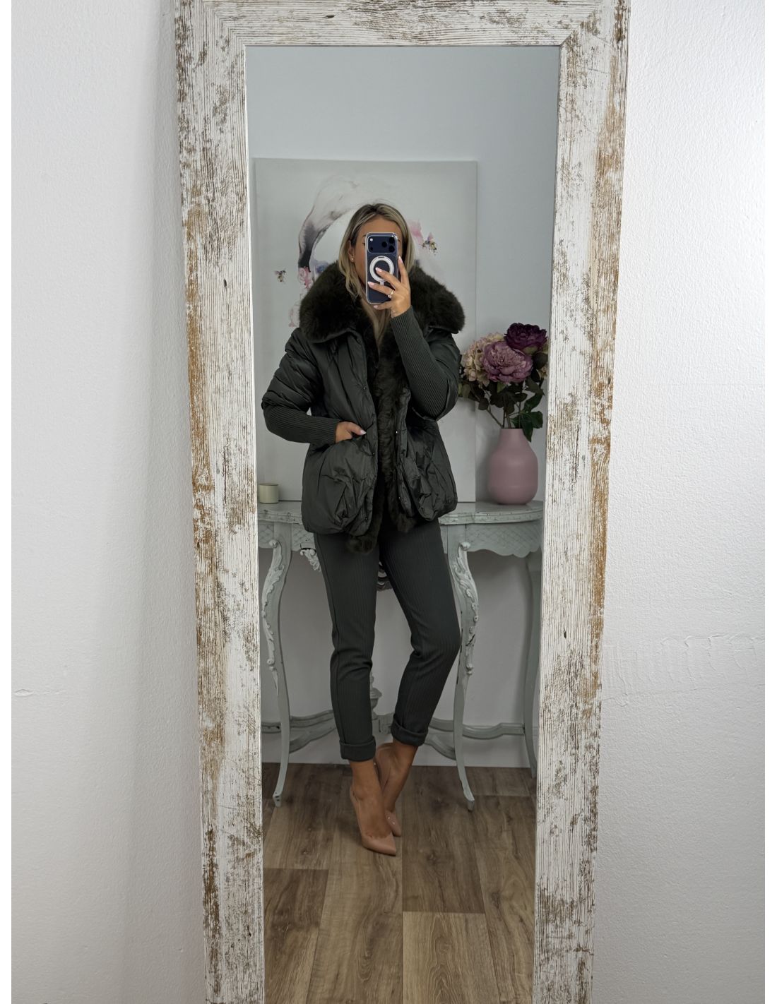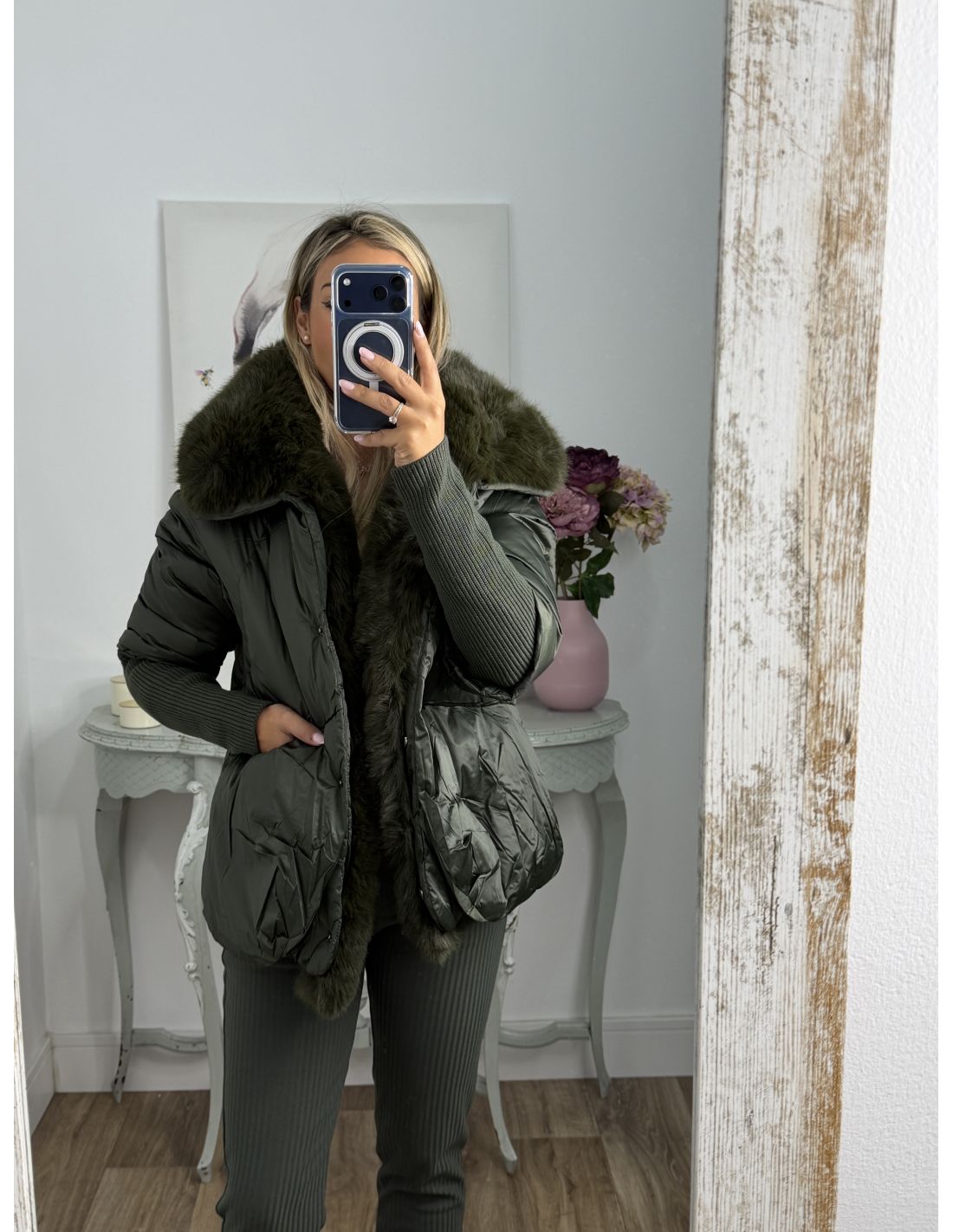Abrigo que lleva pelo sintético que se pude quitar. Se cierra con botones de clips plateados. La zona de la manga lleva un puño grande y ajustado de punto de canalé. Recomendamos coger la talla habitual y si estás entre dos tallas y utilizas jersey grueso coger la talla mayor.