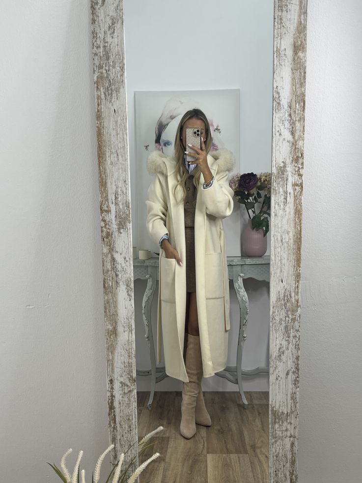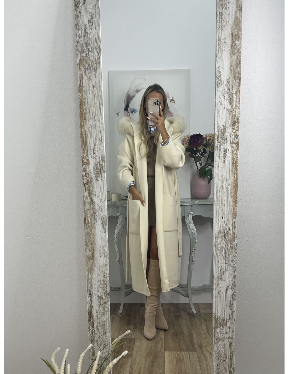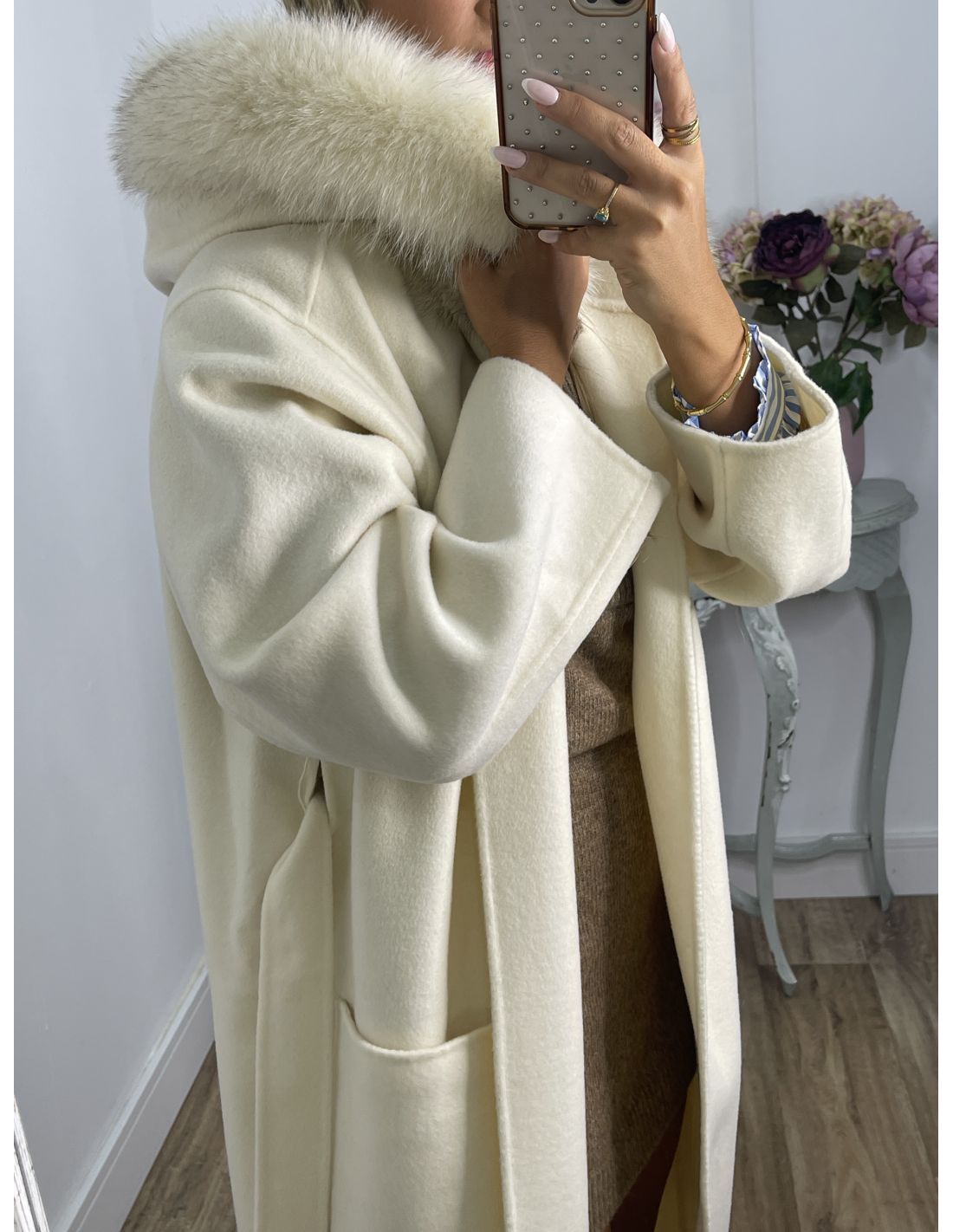 Abrigo de lana con capucha. La capucha lleva pelo natural que se puede quitar y utilizar de cuello con otras prendas. El corte es oversize y recto. Tiene bolsillos delanteros. No va forrado. Trae cinturón del mismo tejido. En la zona lateral de la costura lleva una abertura para pasar el cinturón por el interior.