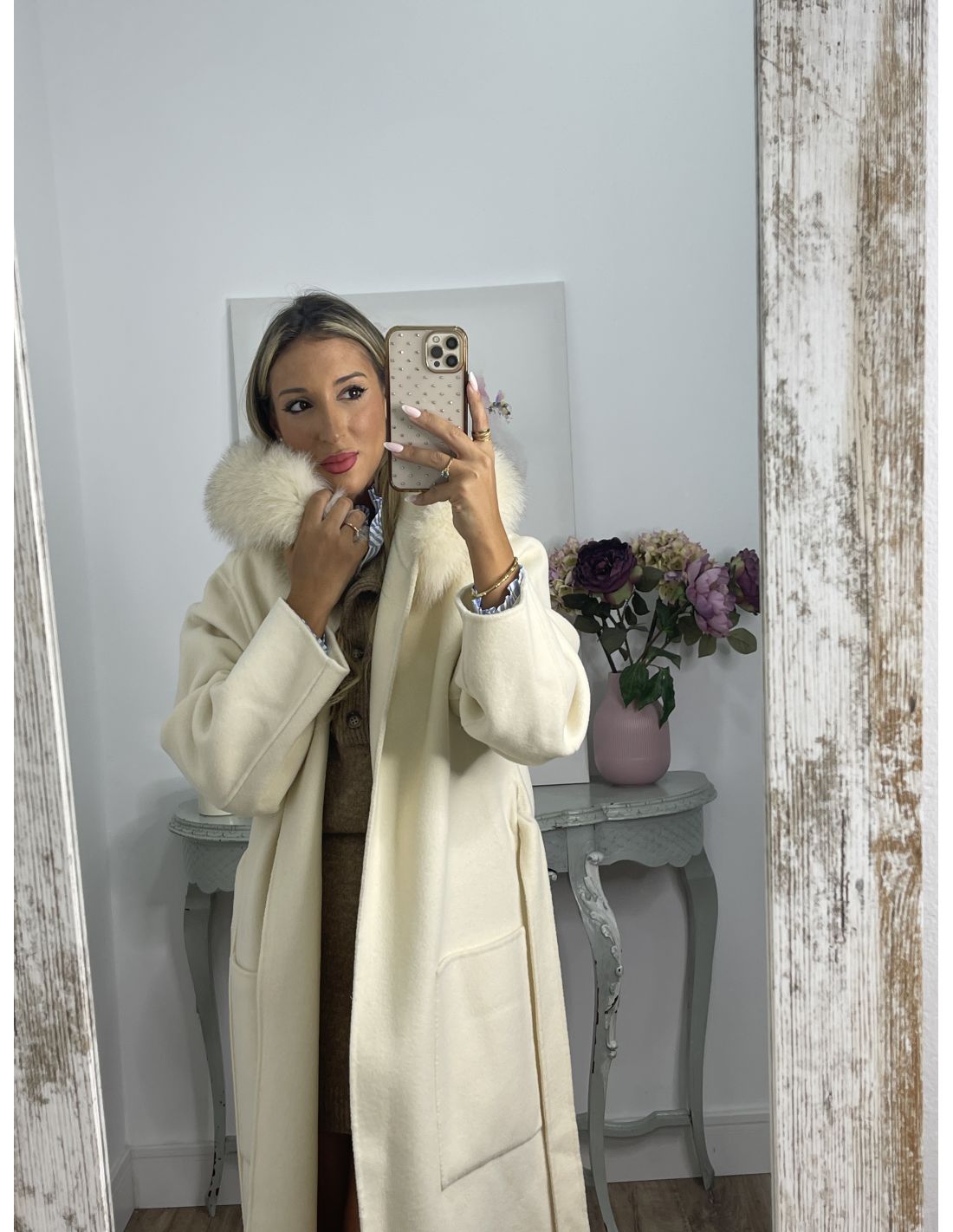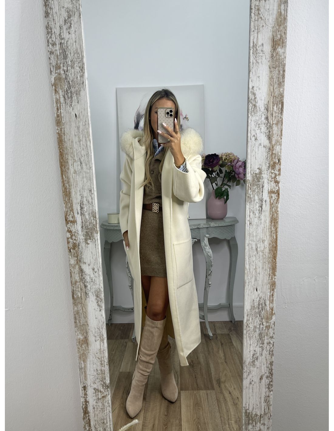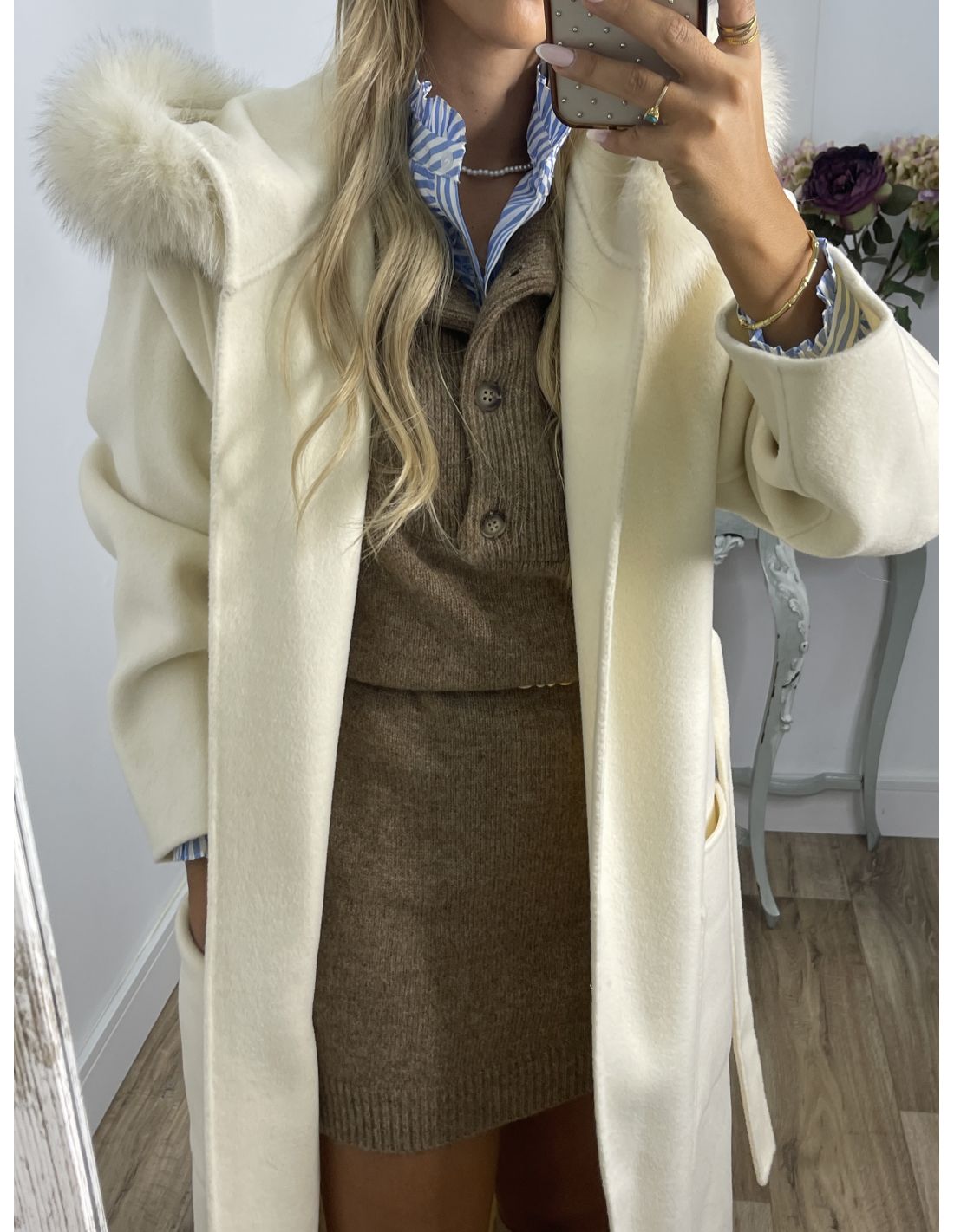 Abrigo de lana con capucha. La capucha lleva pelo natural que se puede quitar y utilizar de cuello con otras prendas. El corte es oversize y recto. Tiene bolsillos delanteros. No va forrado. Trae cinturón del mismo tejido. En la zona lateral de la costura lleva una abertura para pasar el cinturón por el interior.
