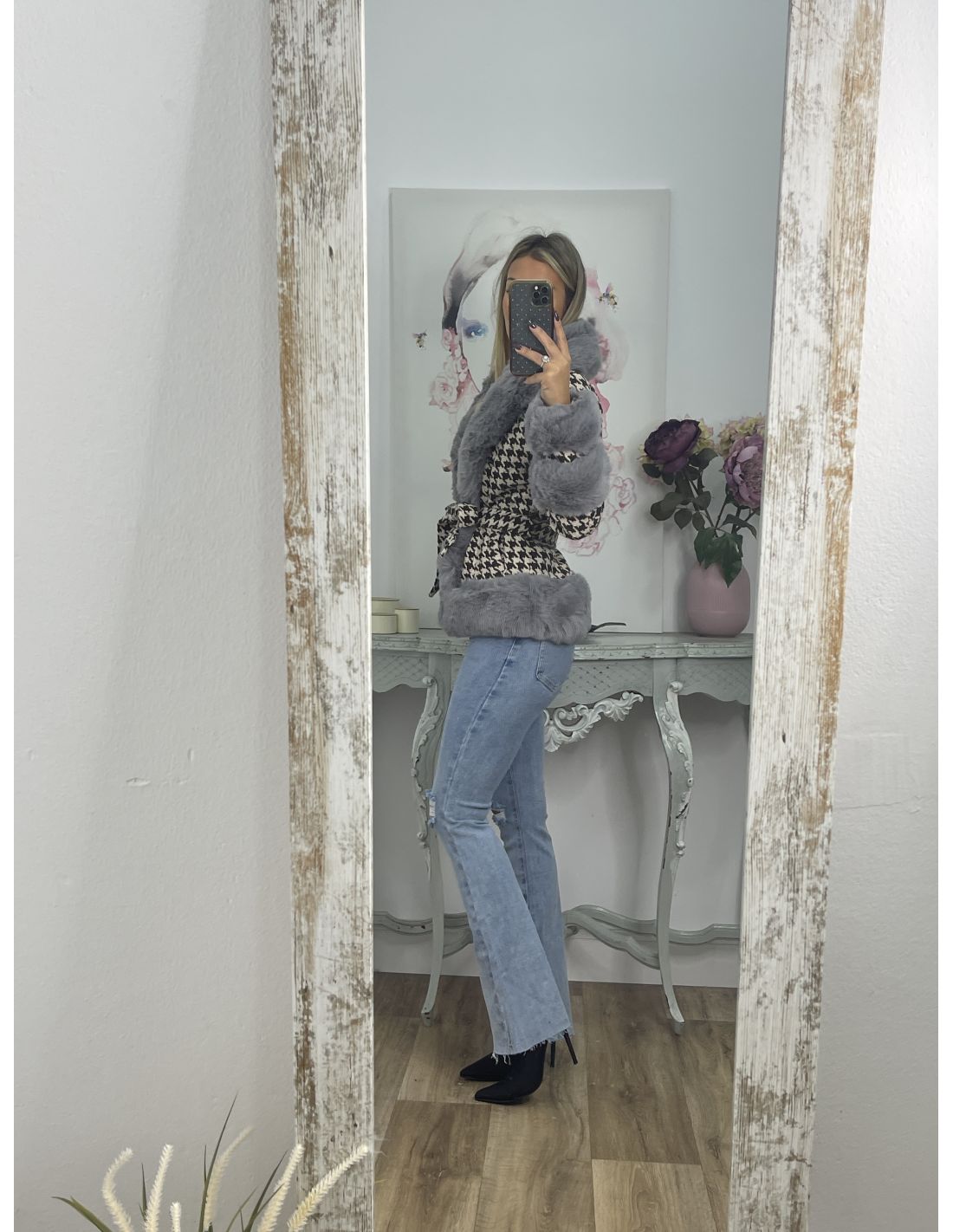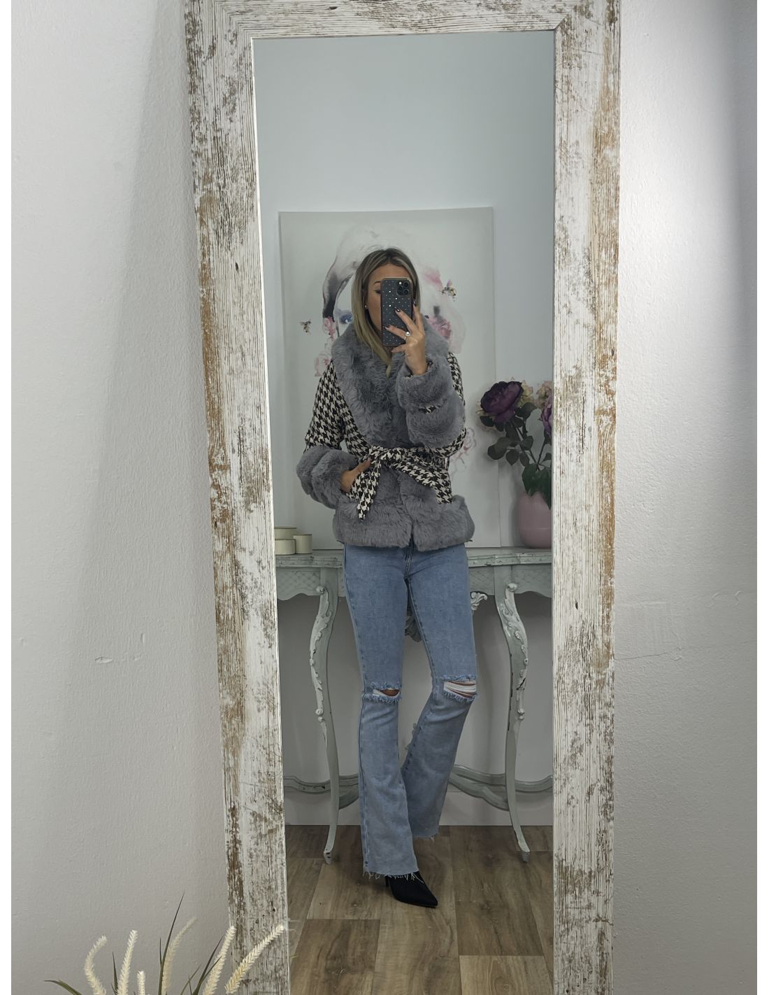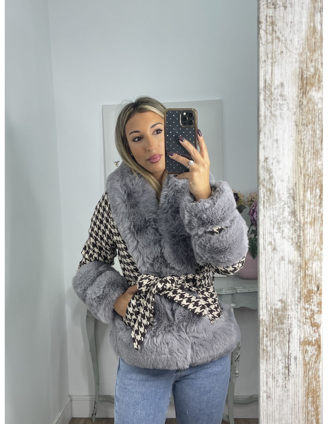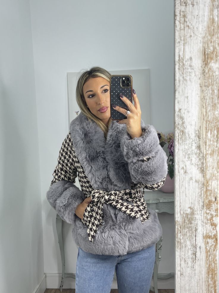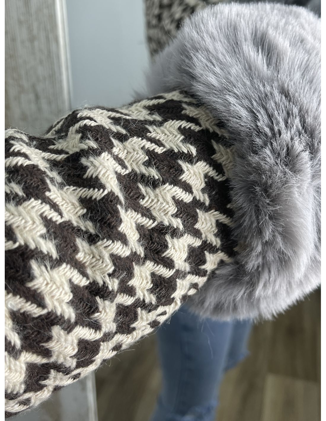 Abrigo pata de gallo marrón con pelo gris