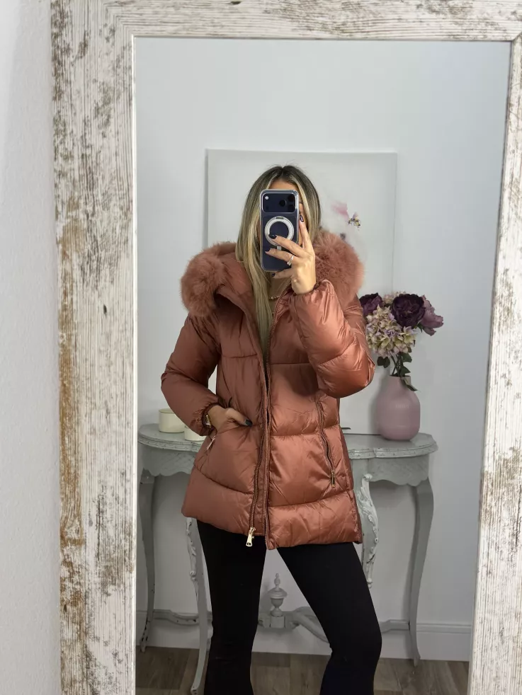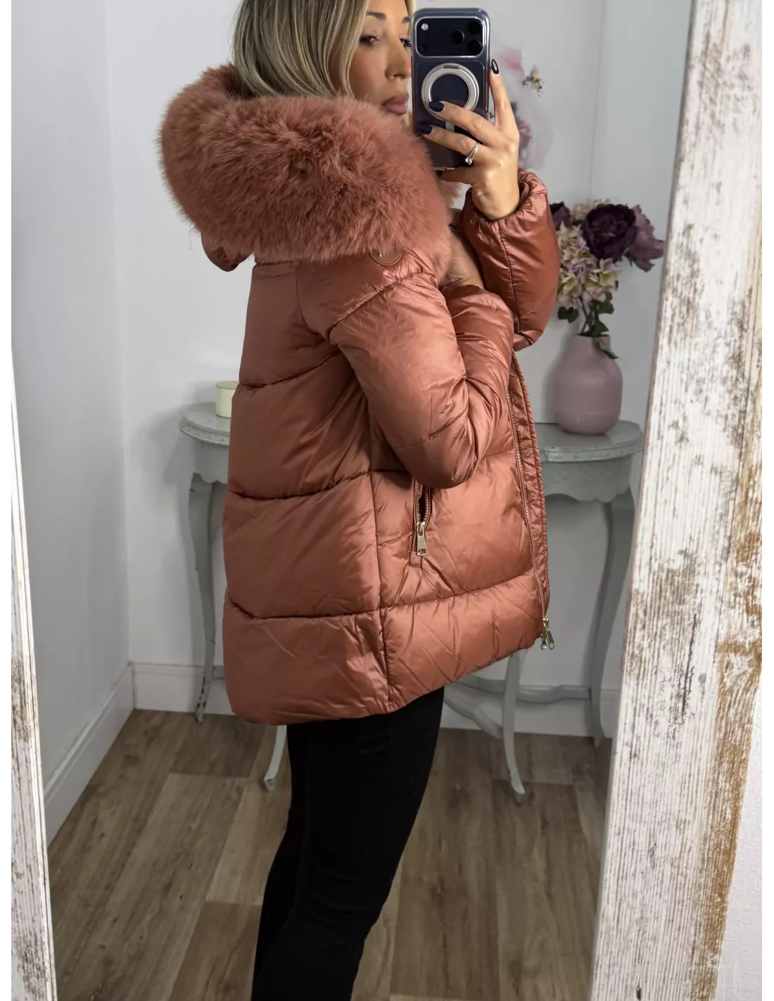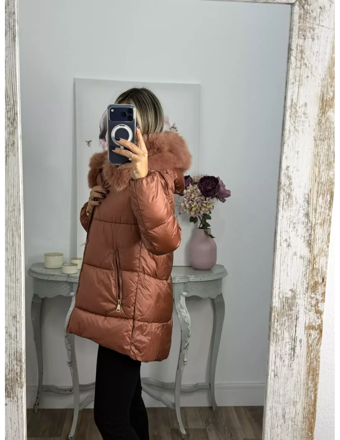 Abrigo que es más largo por detrás que por delante. LLeva gorro que no se puede quitar, si se puede quitar el pelo.