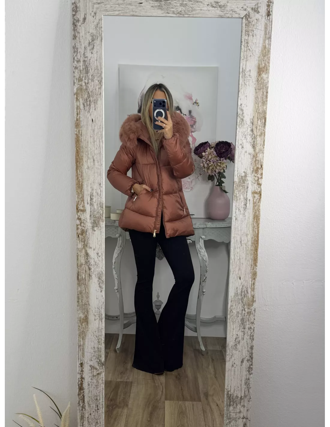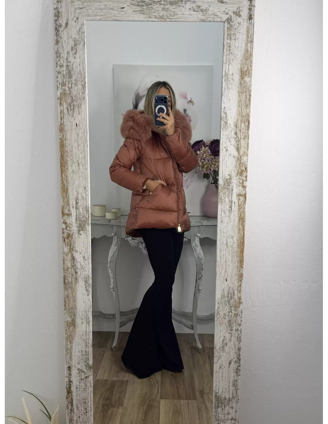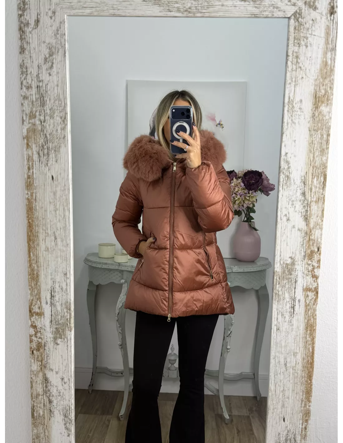 Abrigo que es más largo por detrás que por delante. LLeva gorro que no se puede quitar, si se puede quitar el pelo.