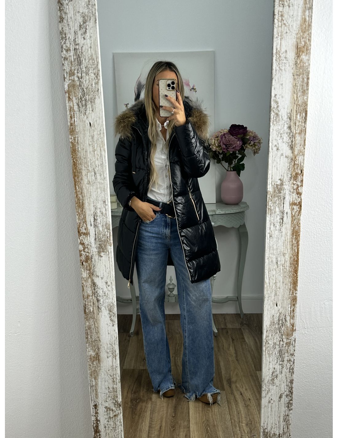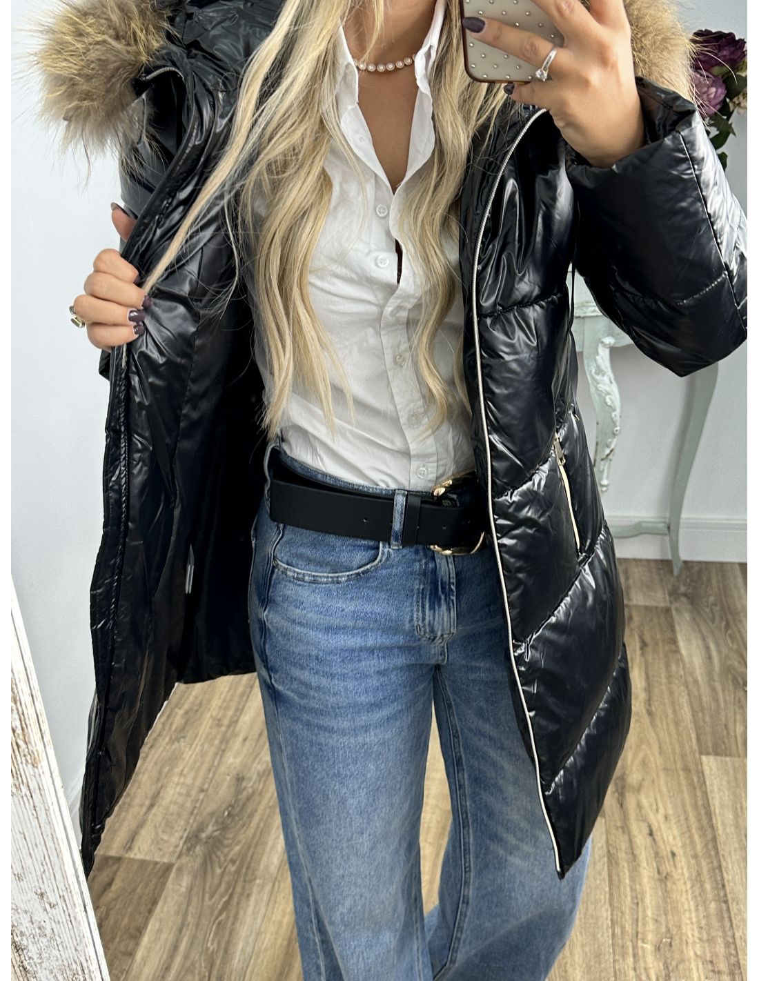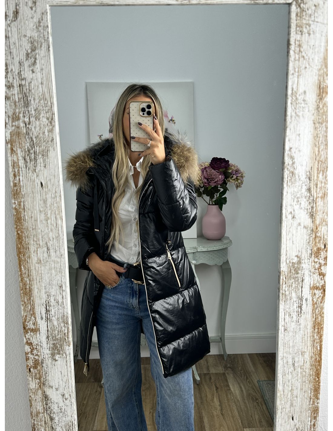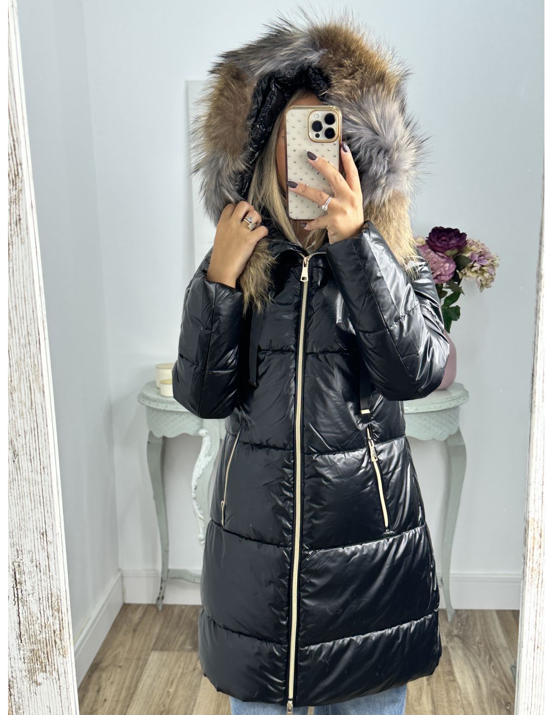 Abrigo con capucha de efecto metalizado. Lleva capucha que no se puede quitar. El pelo de la capucha es pelo natural y se puede quitar.Tapa el culete. Recomendamos coger la talla habitual y si estás entre dos tallas y utilizas jersey grueso coger la talla mayor.
