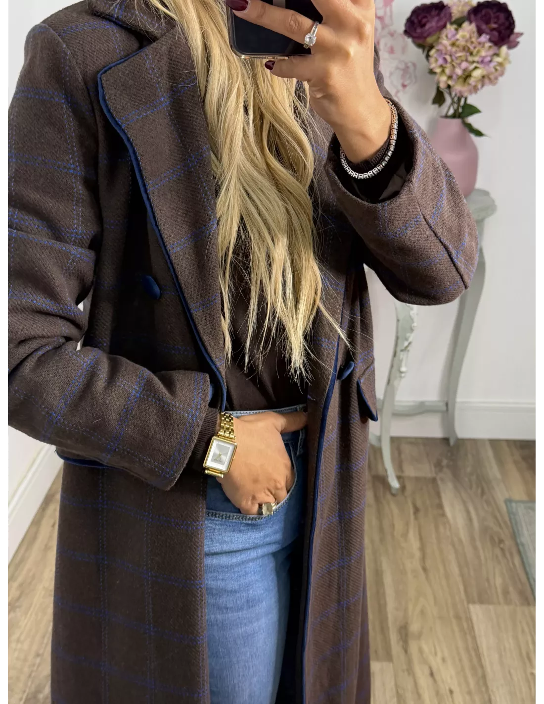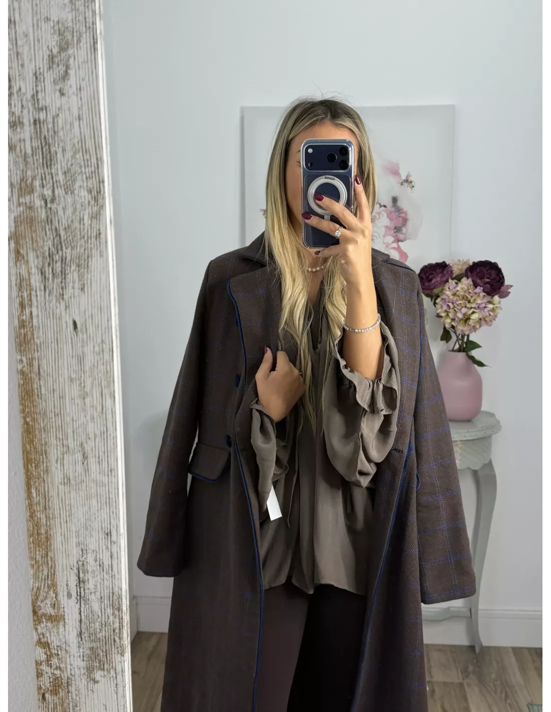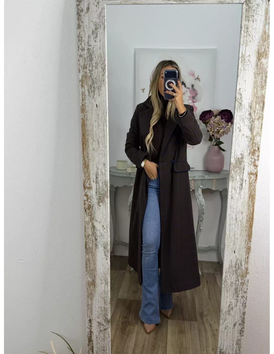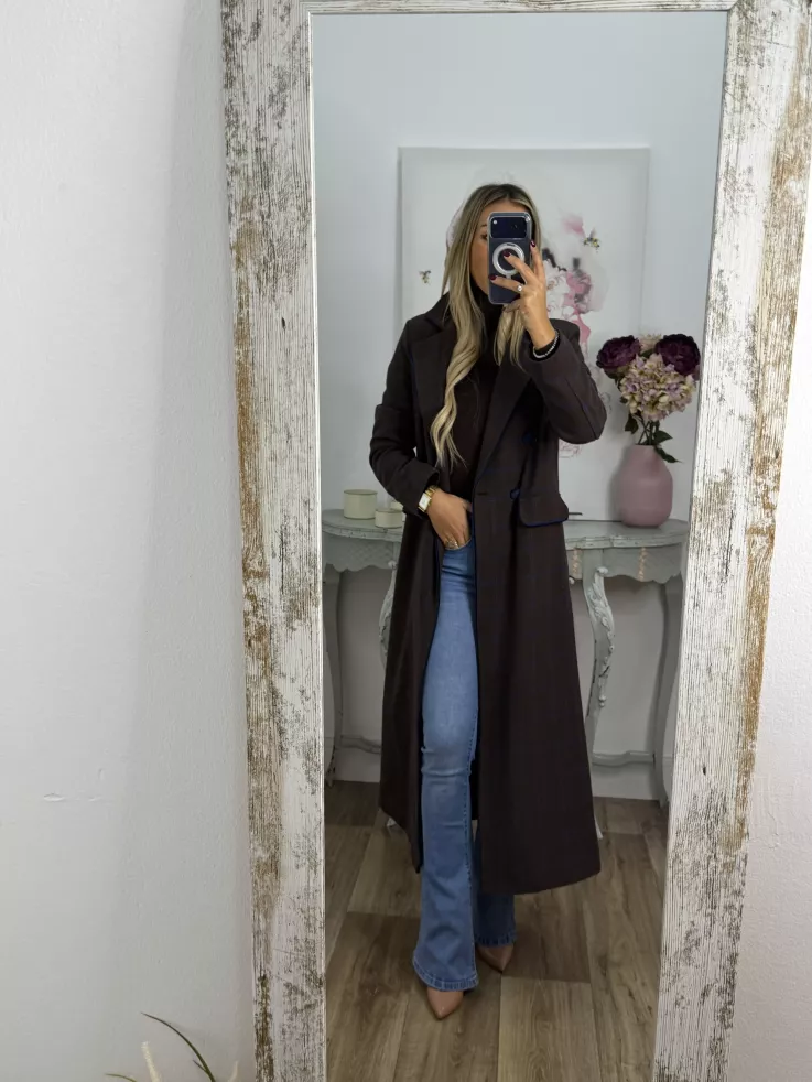 Abrigo de tejido tipo paño, el cortes es montado. Los botones donde terciopelo y el ribete que lleva en la zona de la solapa y las tapetas del bolsillo. No tiene bolsillos. Va forrado y tiene hombreras.