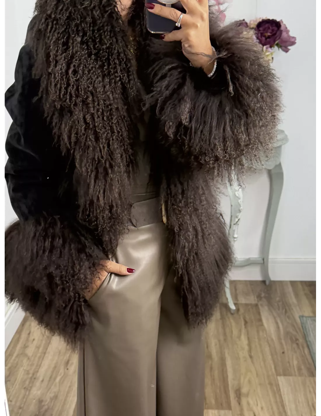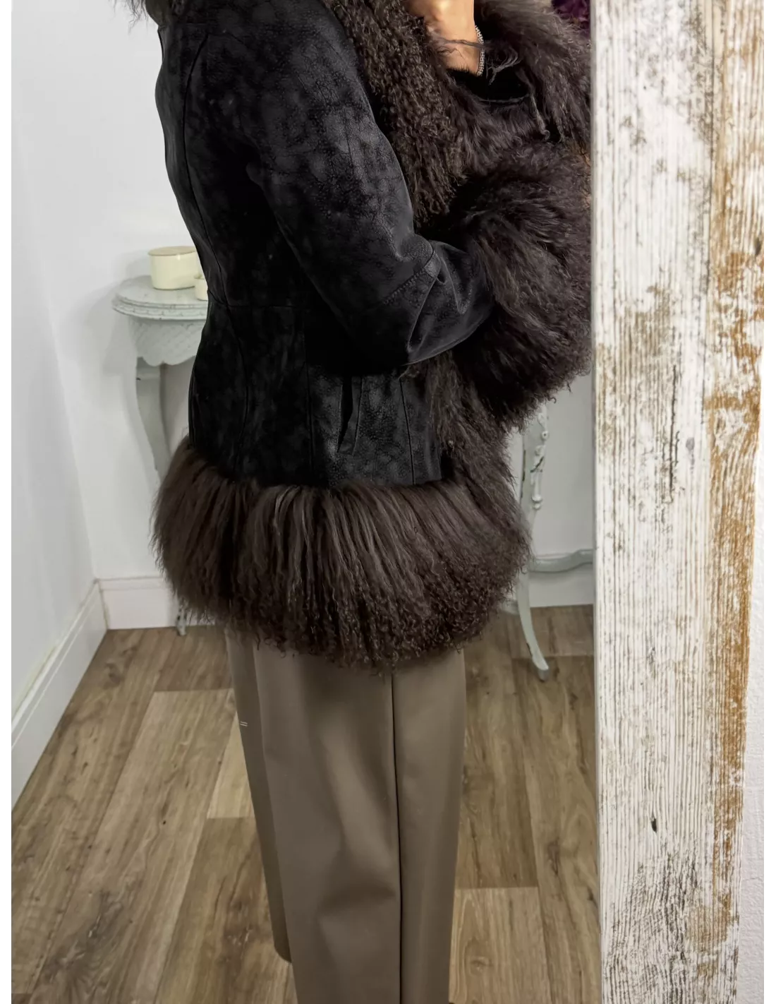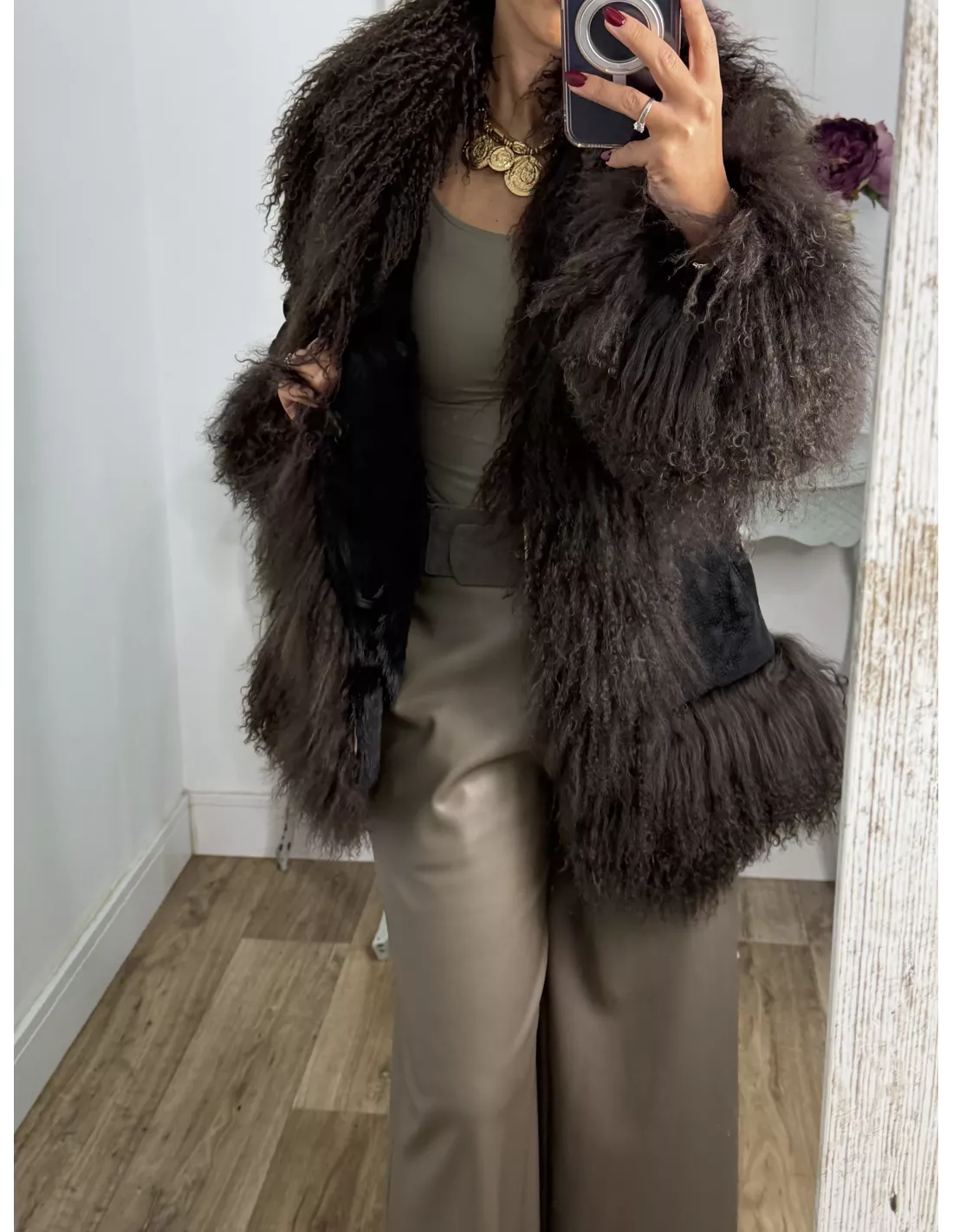 Abrigo de pelo natural, va forrado por dentro de pelo natural, las mangas no van forradas de pelo. El pelo exterior de rizado. Tiene bolsillos.