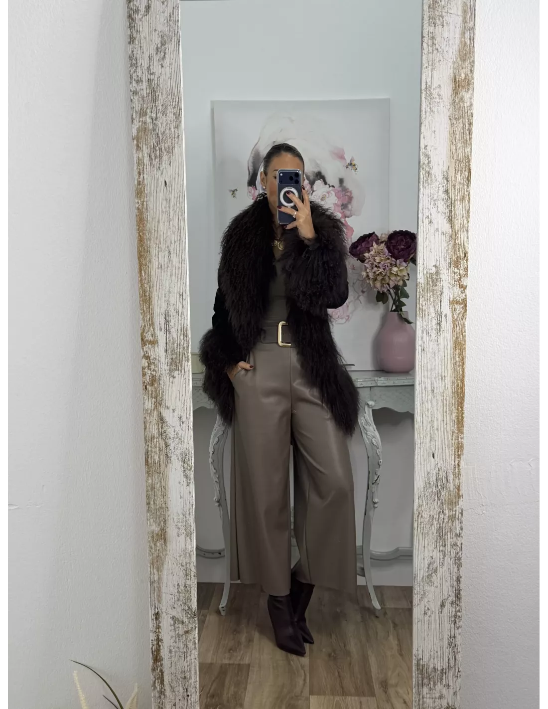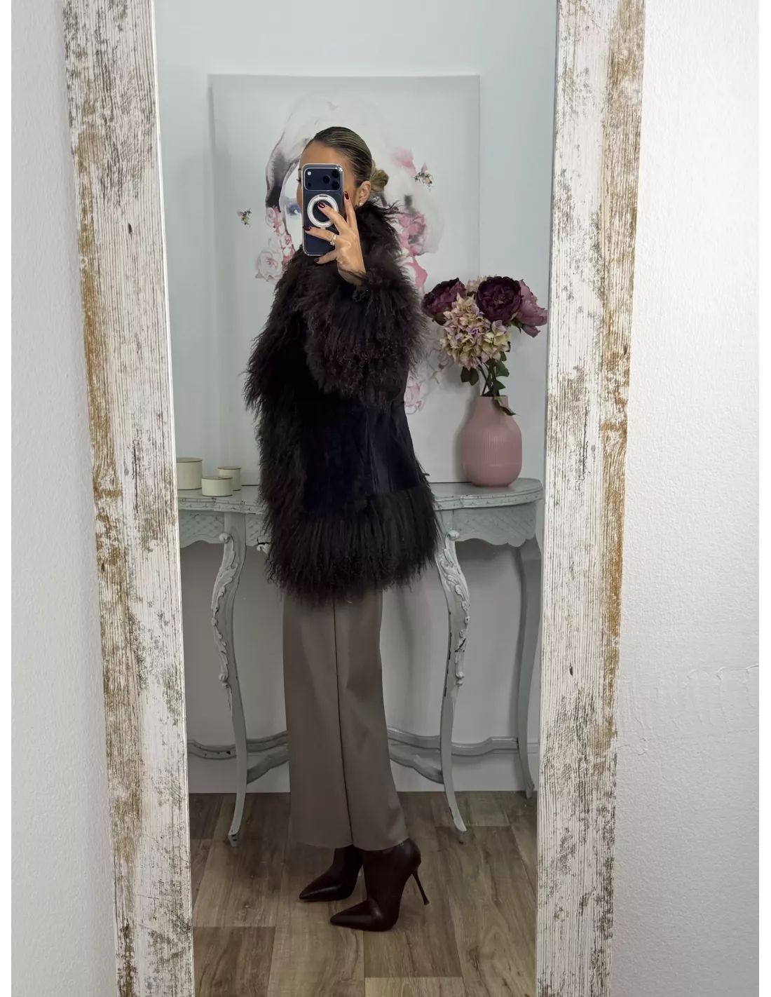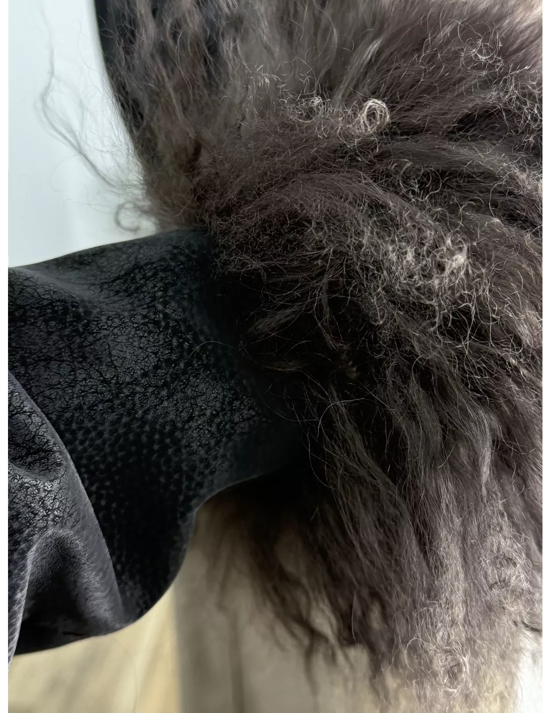 Abrigo de pelo natural, va forrado por dentro de pelo natural, las mangas no van forradas de pelo. El pelo exterior de rizado. Tiene bolsillos.