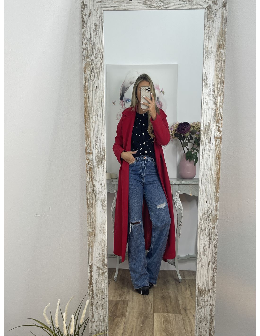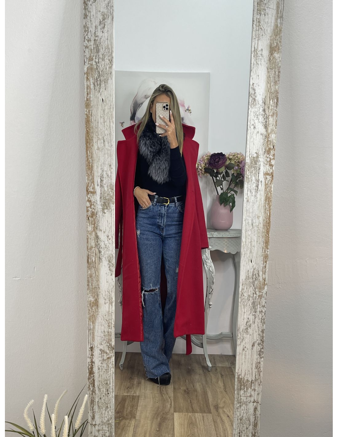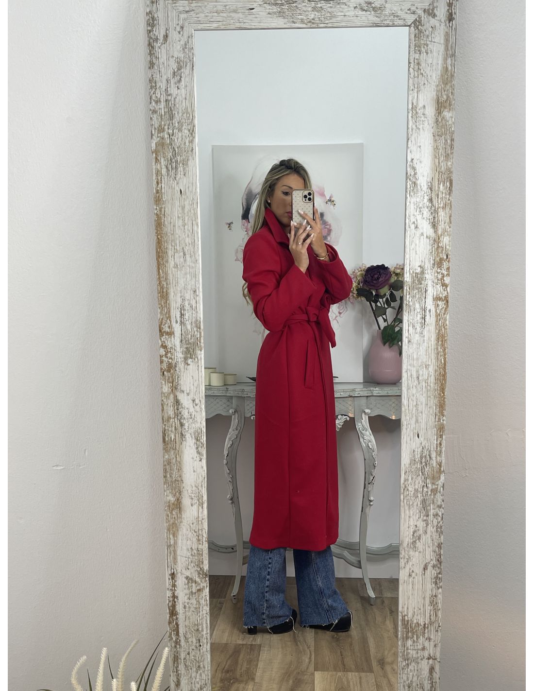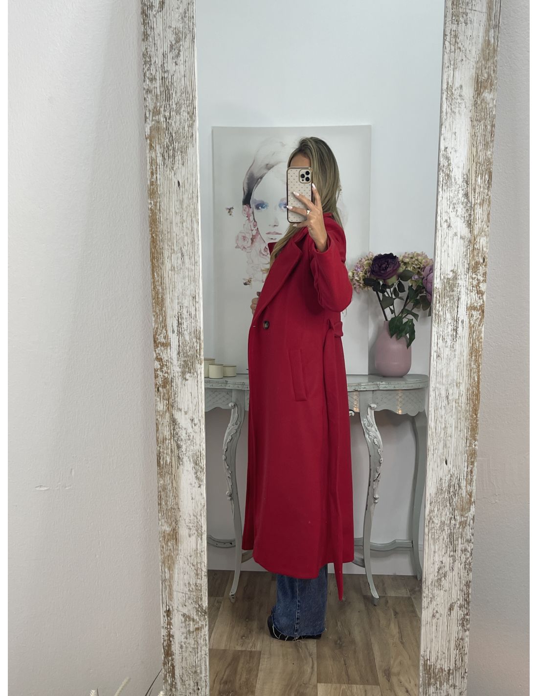 Abrigo de tejido tipo paño, el cortes es tipo bata, va forrado. Tiene bolsillos y cinturón del mismo tejido. Tiene dos botones en el centro.