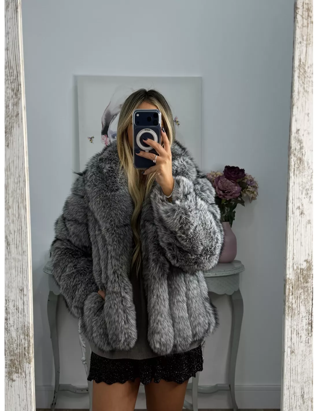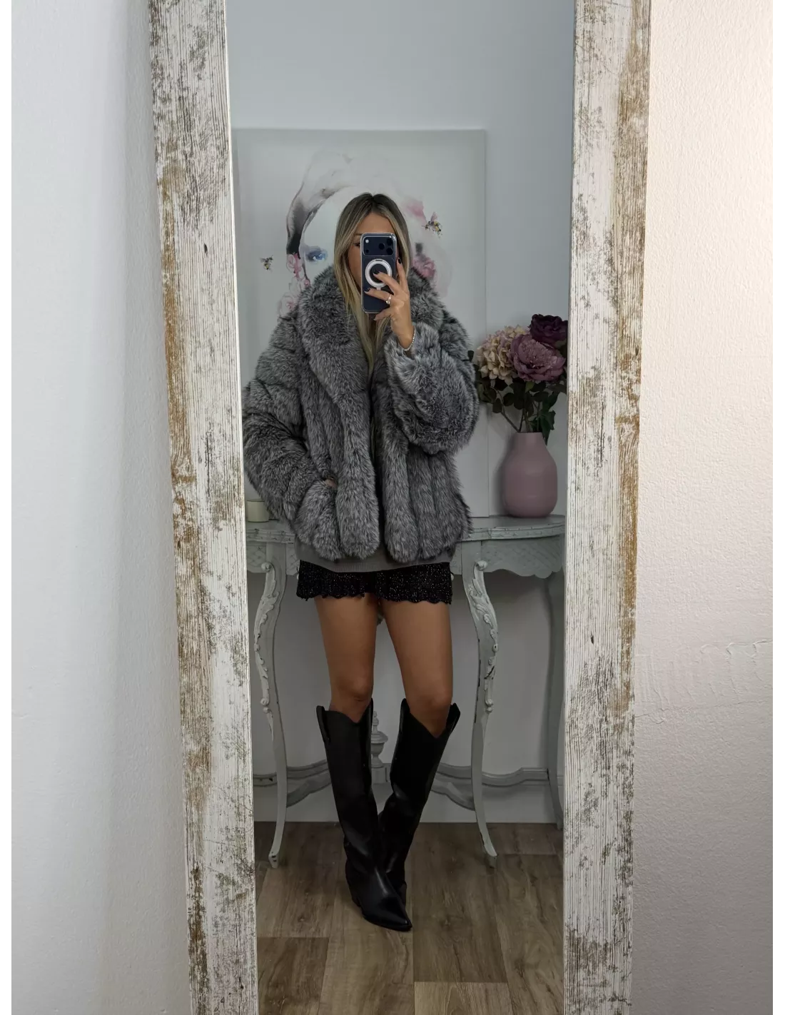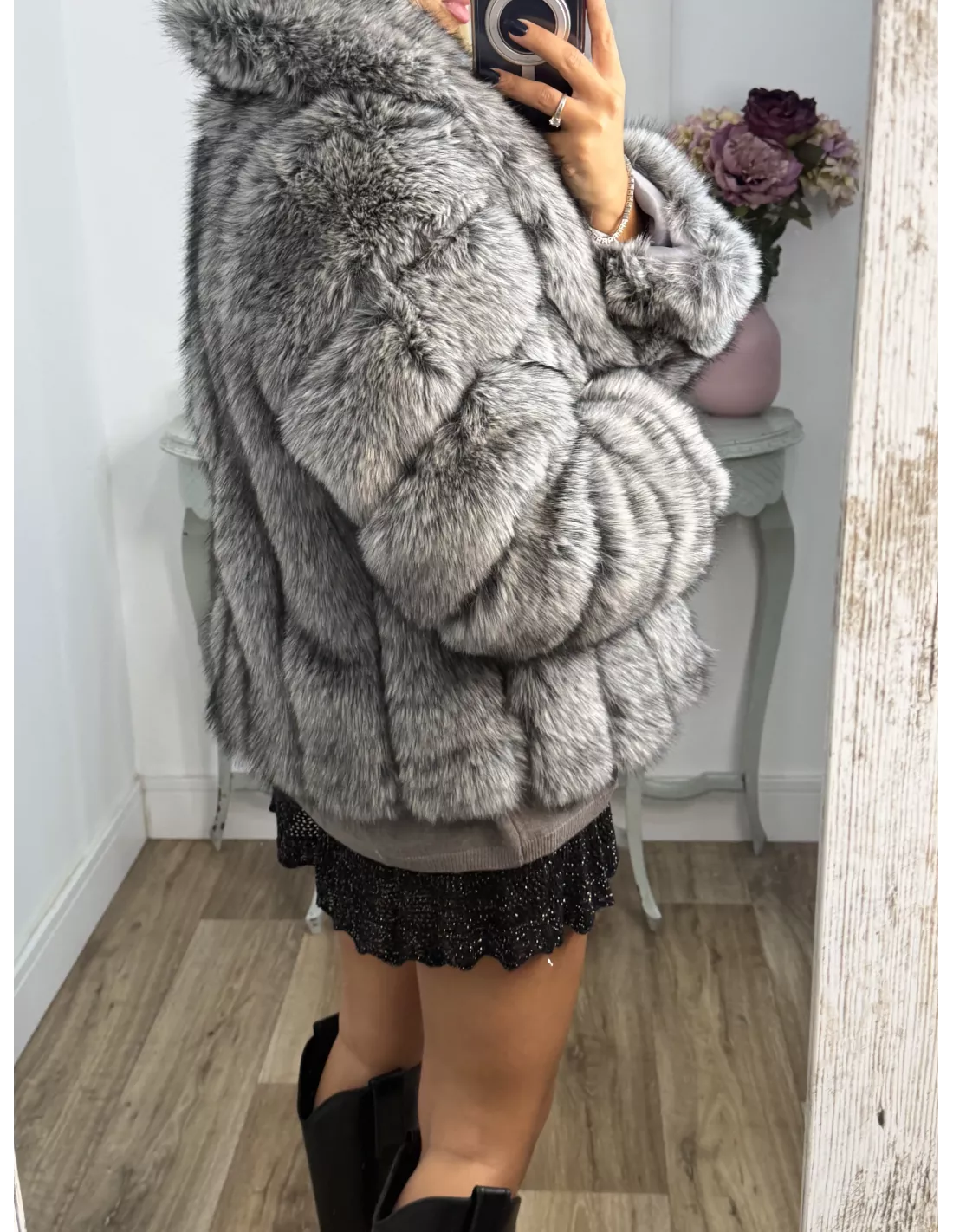 Abrigo de pelo sintético. Va forrado y tiene bolsillos. El tacto es muy suave. Se cierra con un enganche de Peleteria justo en la zona del cuello, solo lleva un cierre.