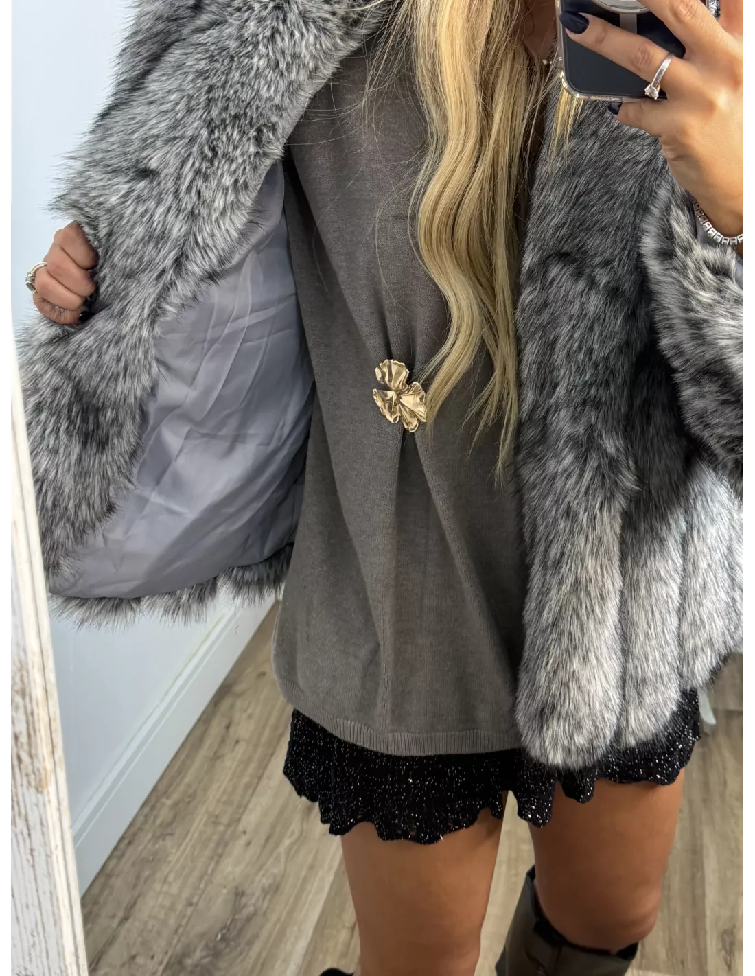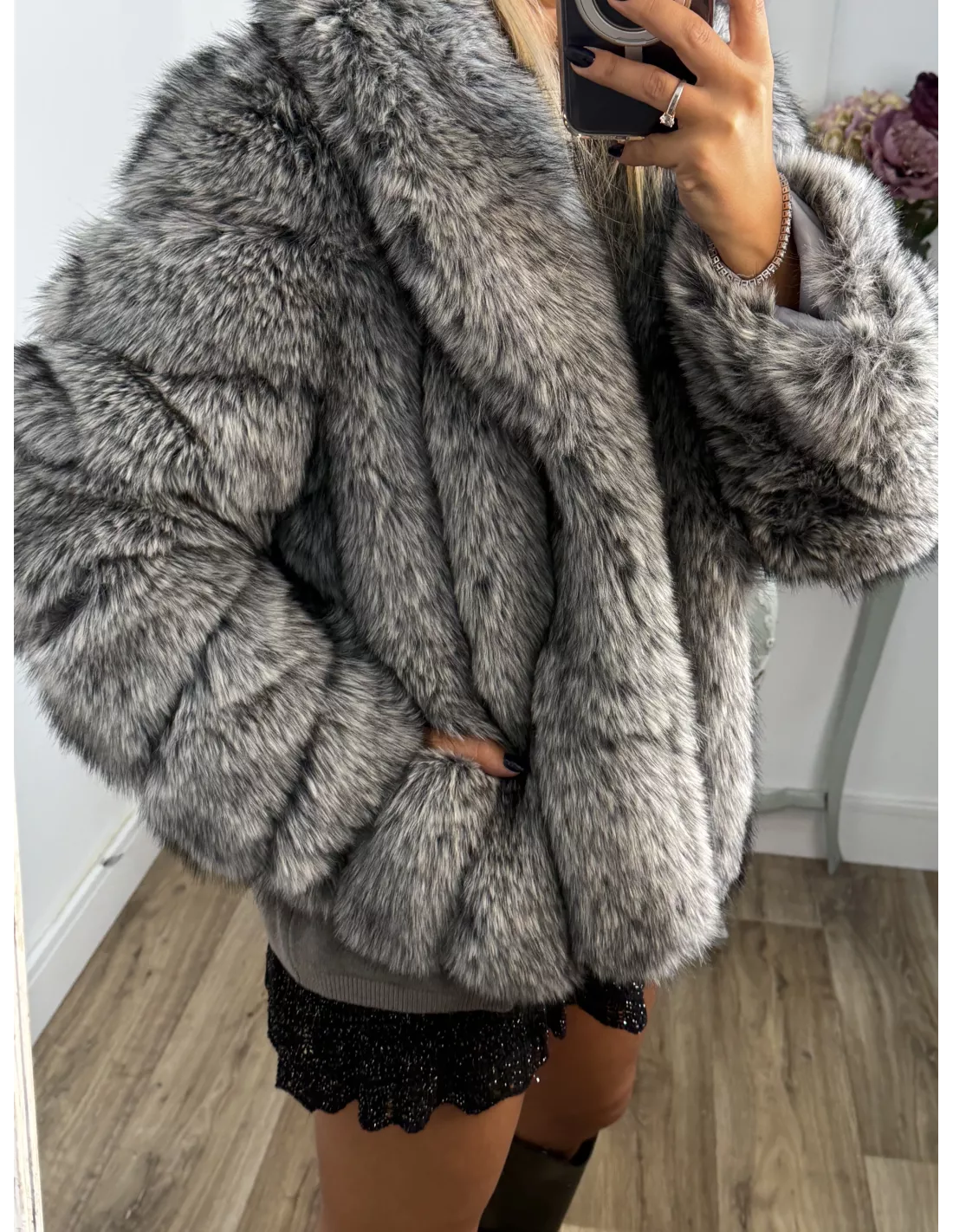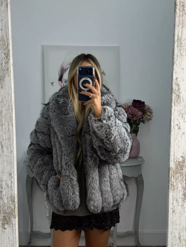Abrigo de pelo sintético. Va forrado y tiene bolsillos. El tacto es muy suave. Se cierra con un enganche de Peleteria justo en la zona del cuello, solo lleva un cierre.