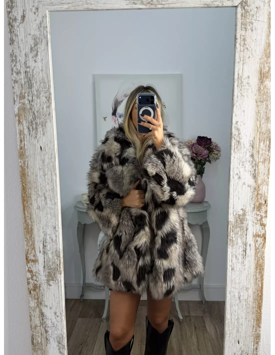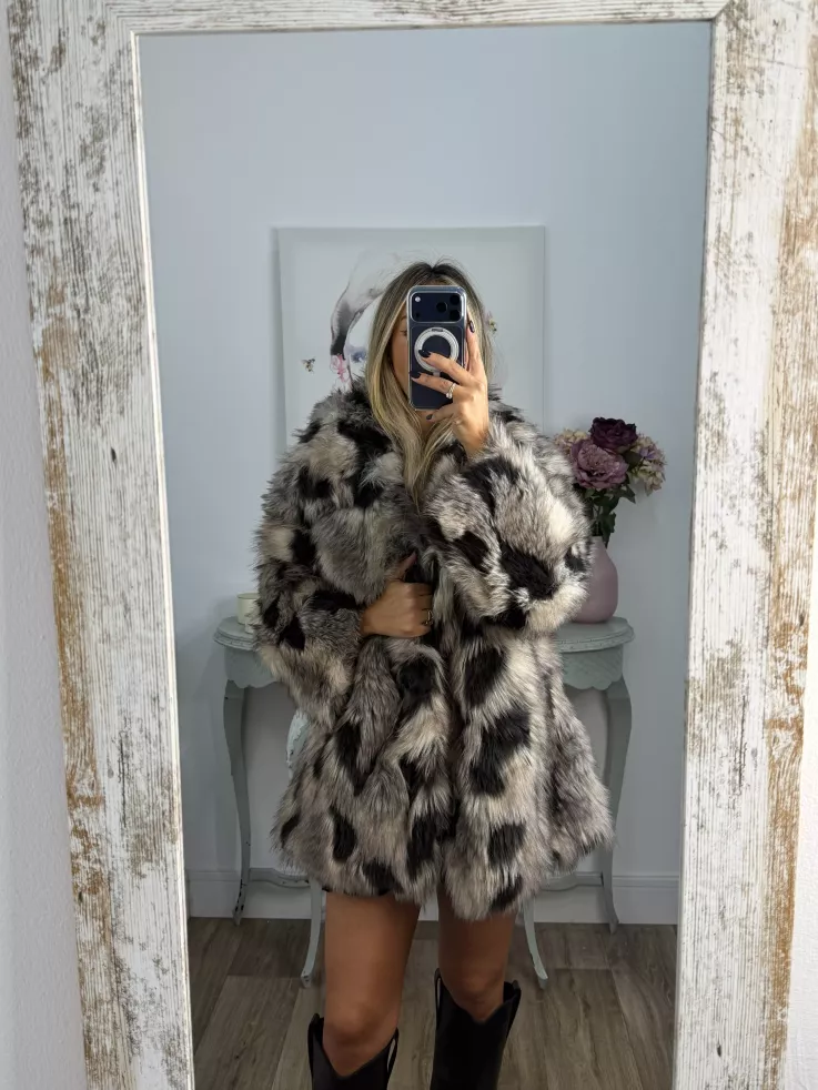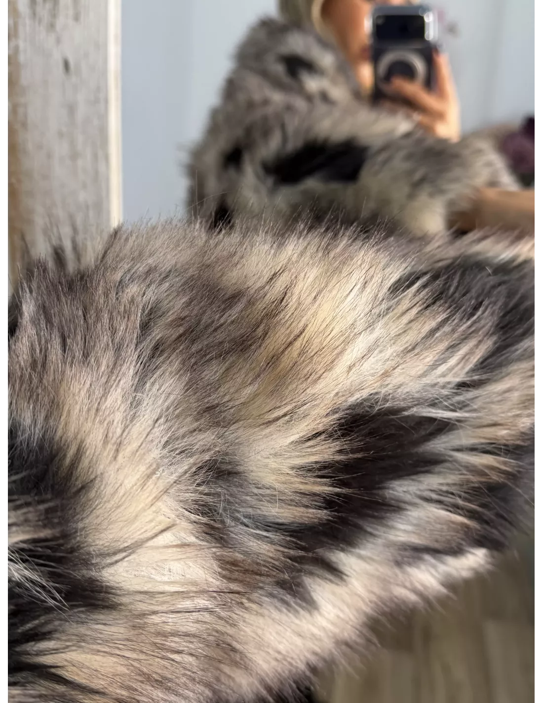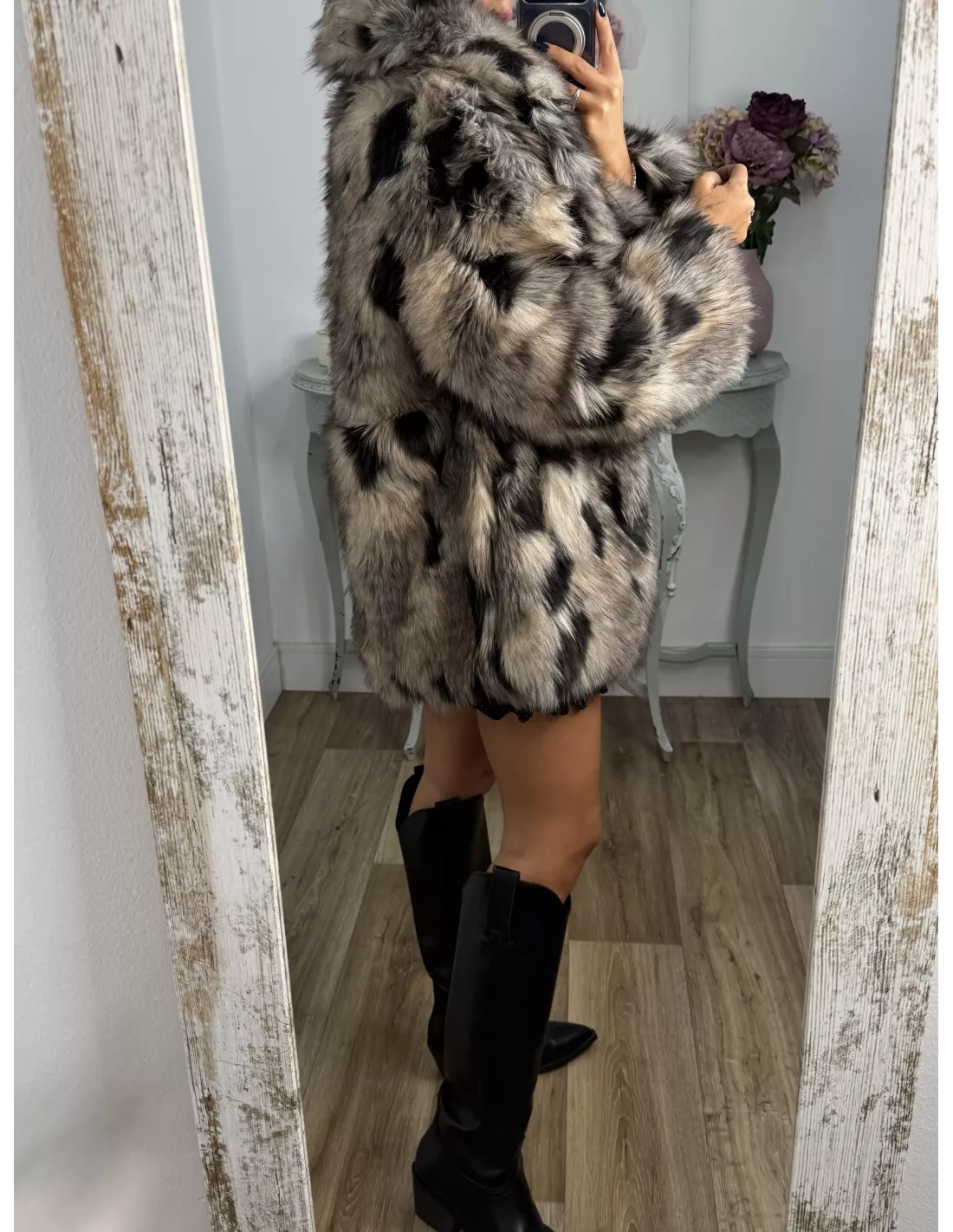 Abrigo de pelo sintético. Va forrado y tiene bolsillos. El tacto es muy suave. Se cierra com botones de clips