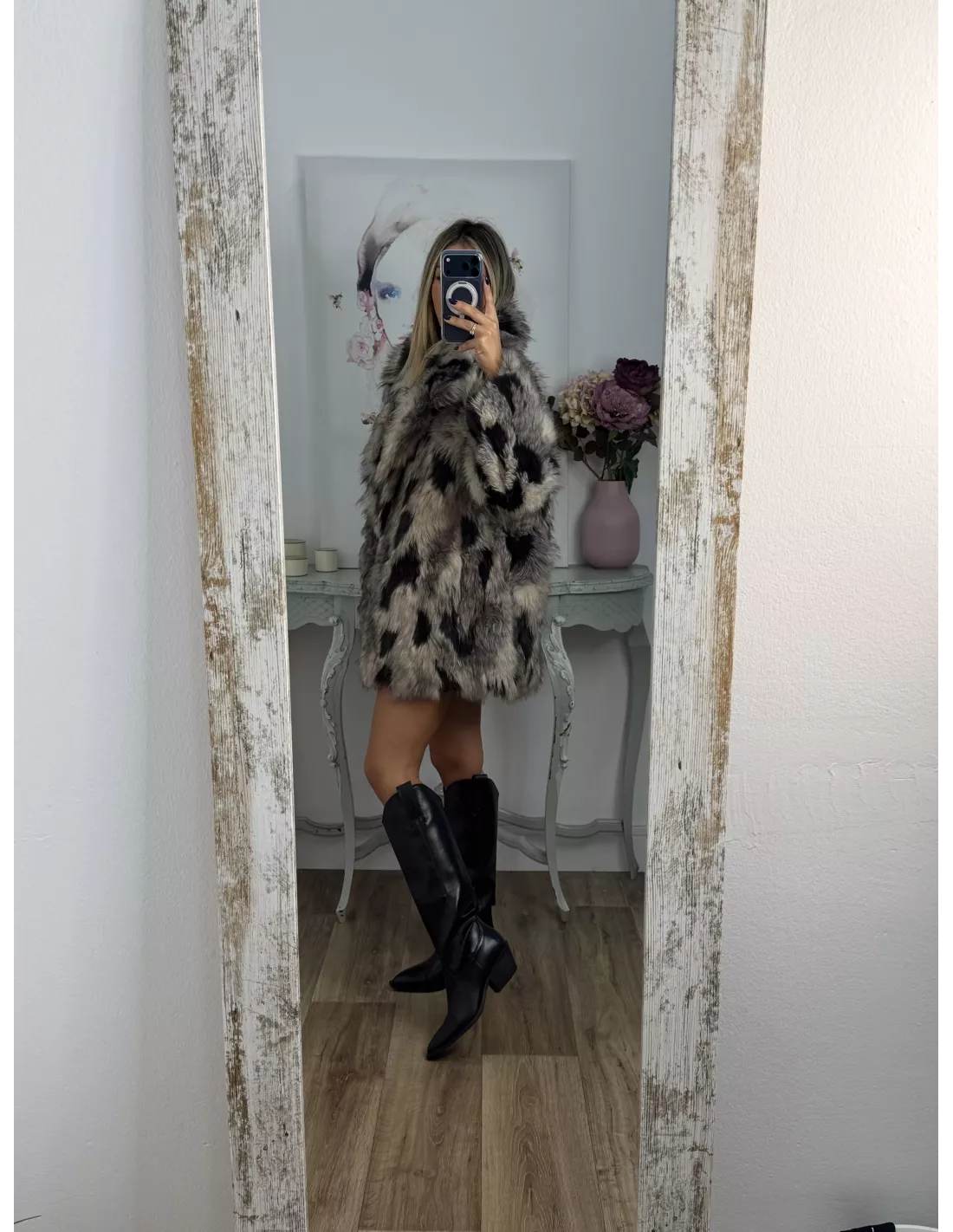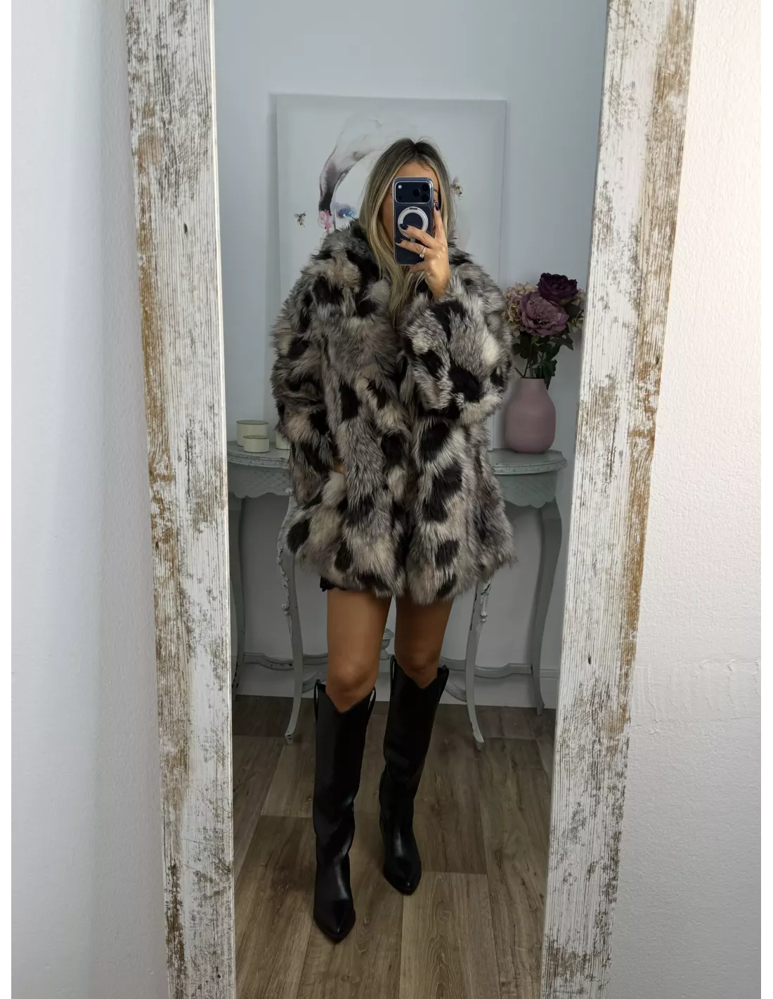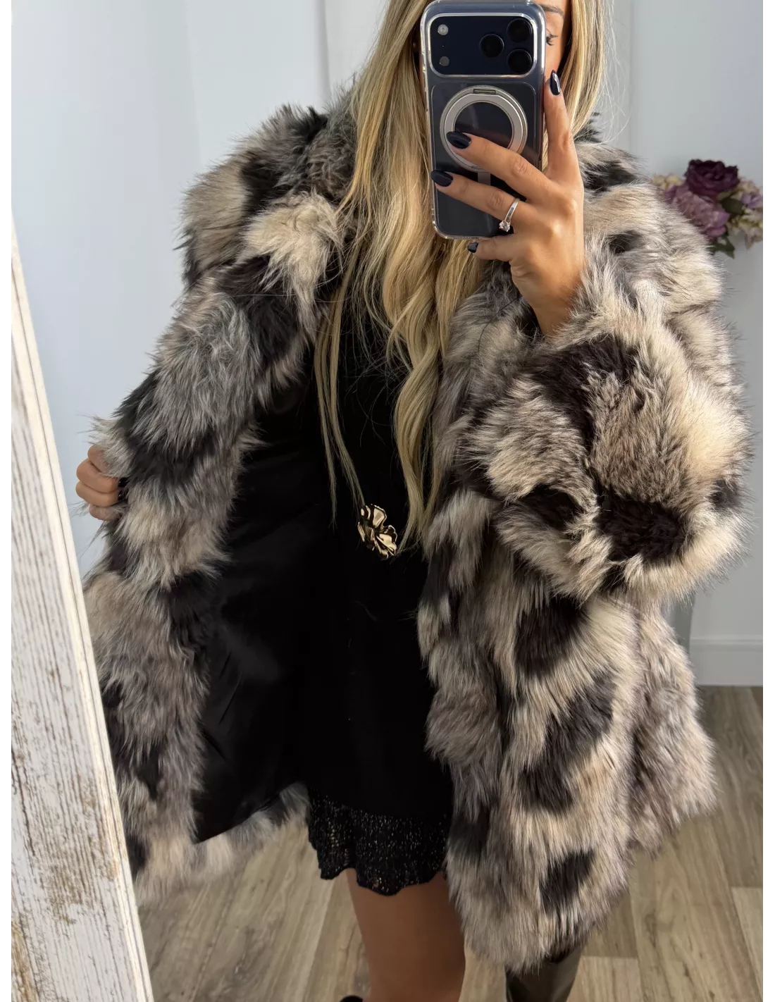 Abrigo de pelo sintético. Va forrado y tiene bolsillos. El tacto es muy suave. Se cierra com botones de clips
