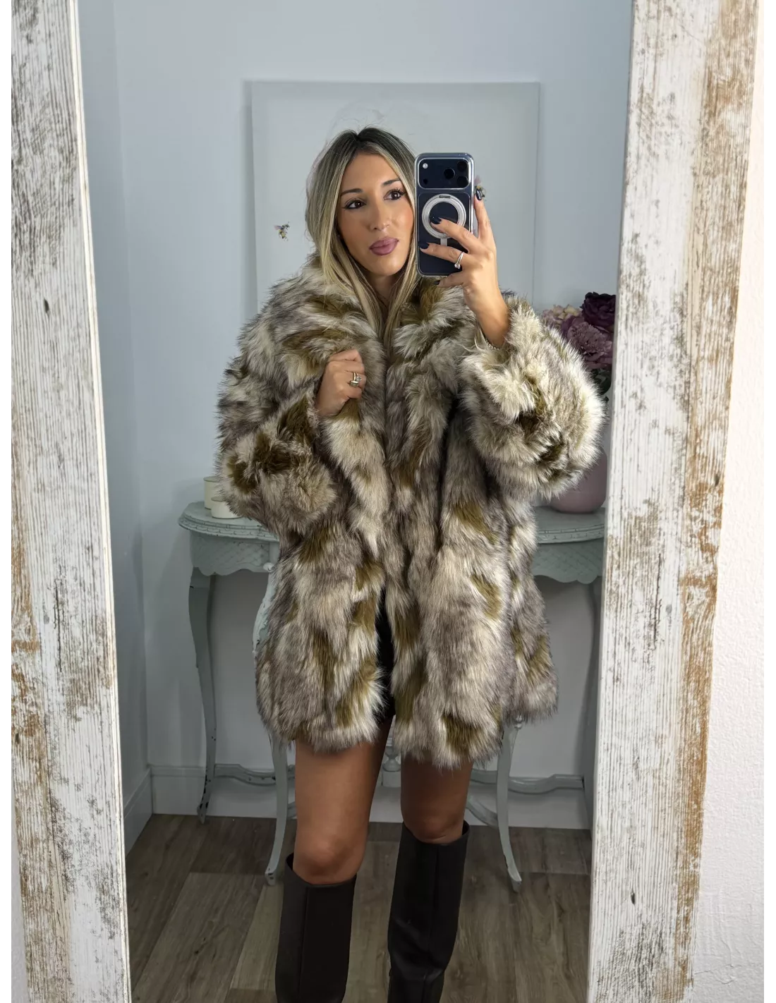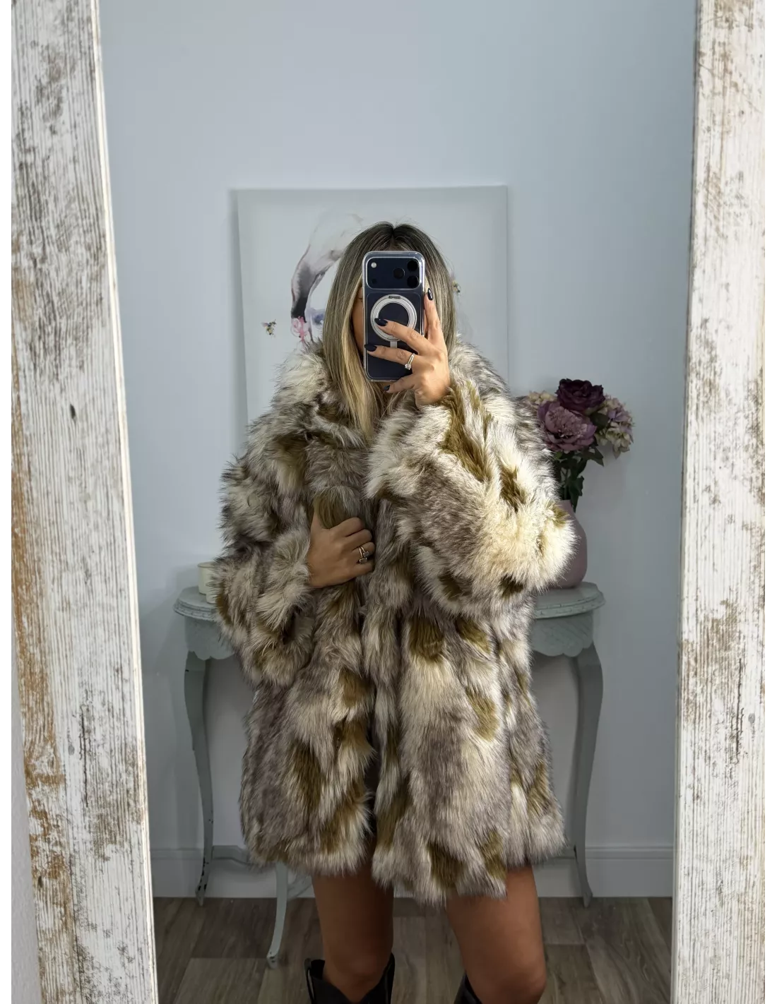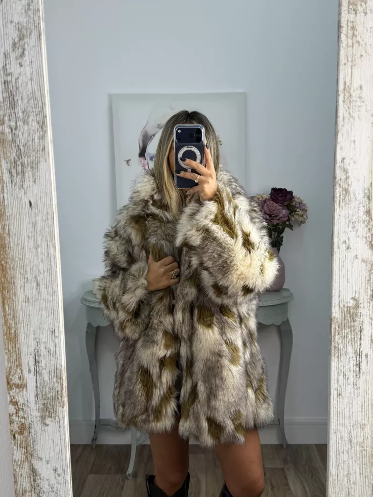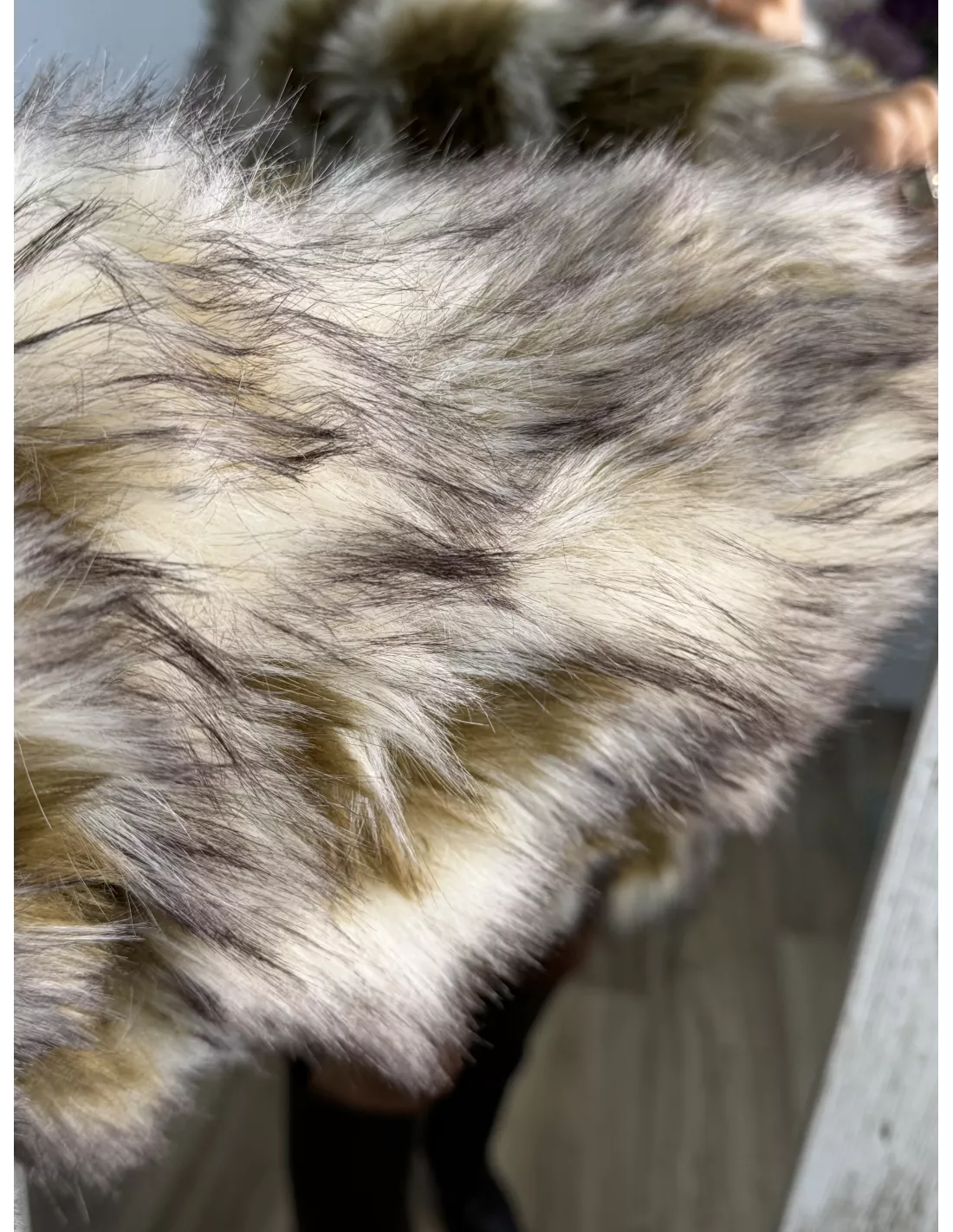 Abrigo de pelo sintético. Va forrado y tiene bolsillos. El tacto es muy suave. Se cierra com botones de clips