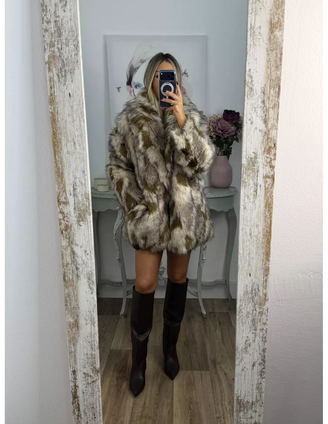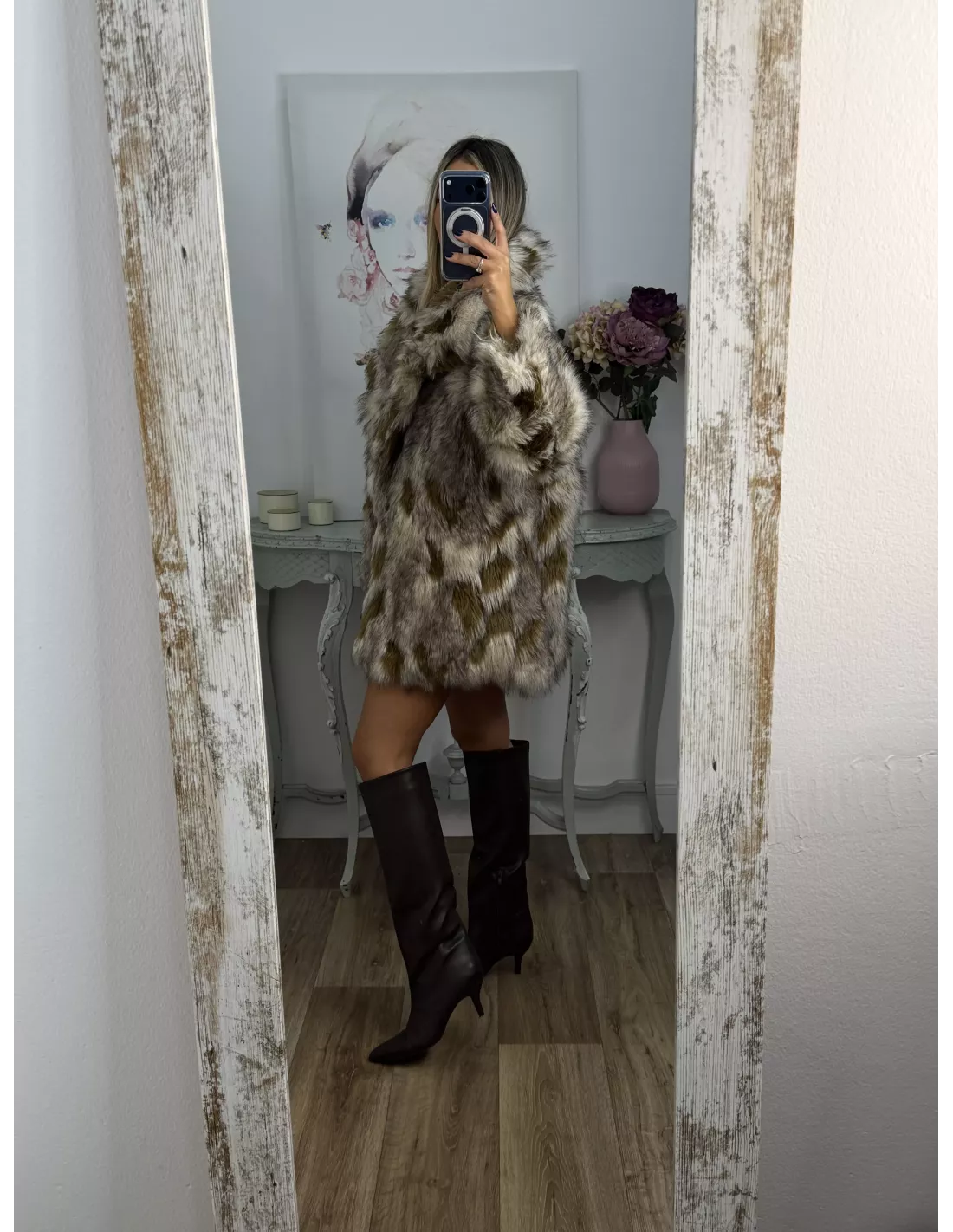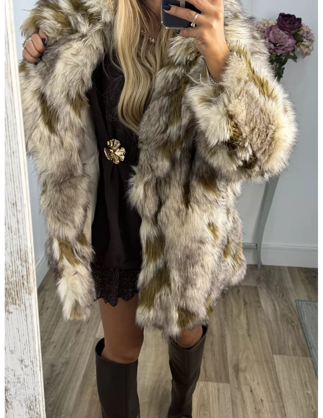 Abrigo de pelo sintético. Va forrado y tiene bolsillos. El tacto es muy suave. Se cierra com botones de clips