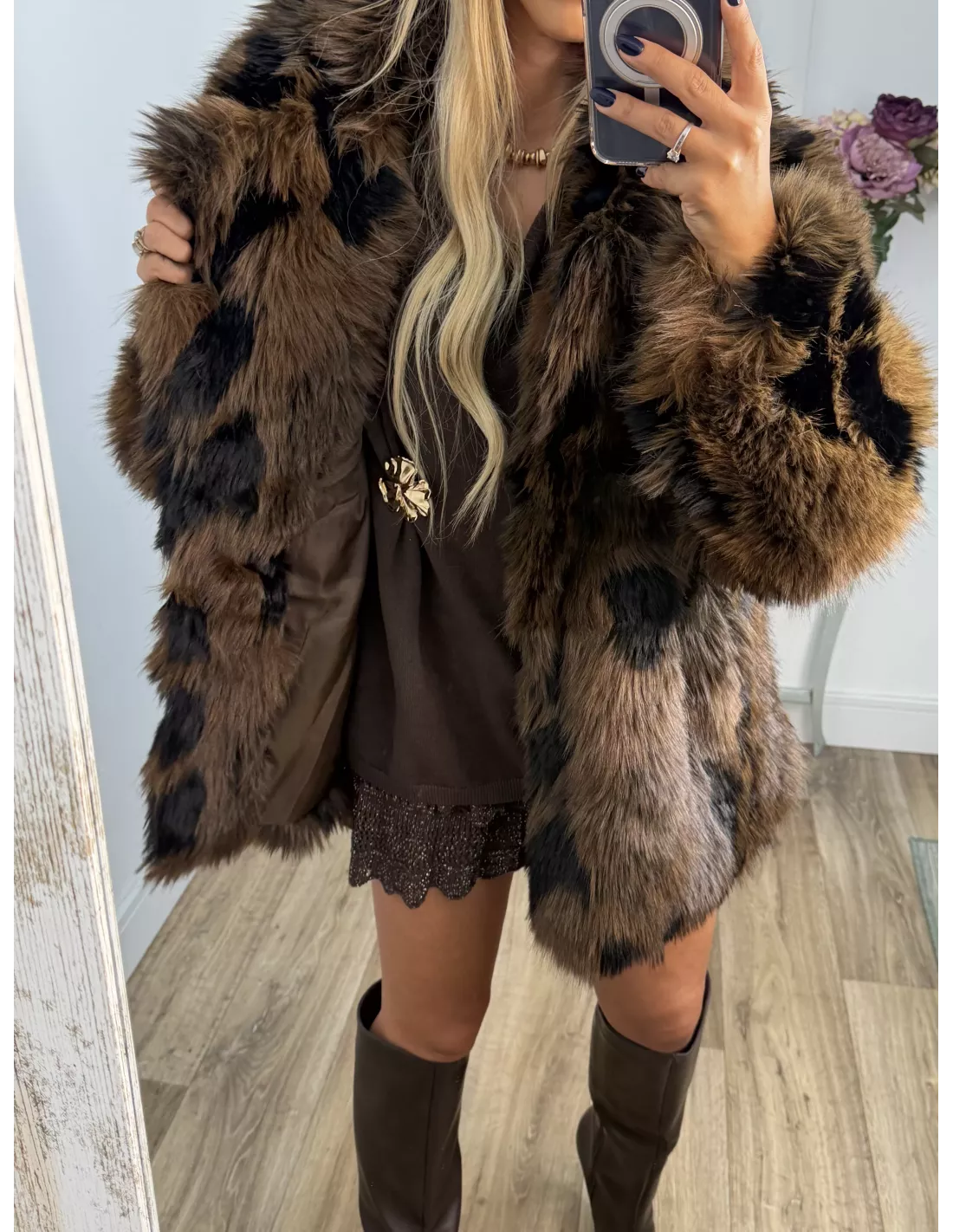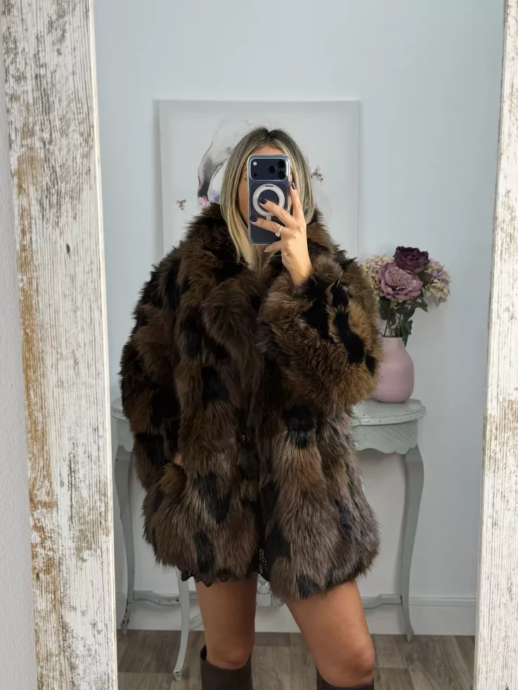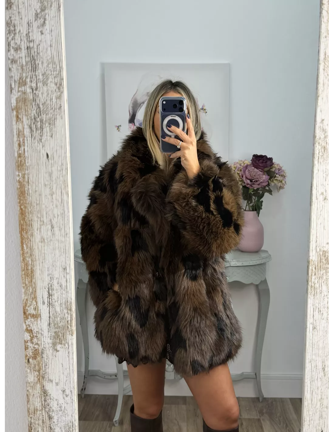 Abrigo de pelo sintético. Va forrado y tiene bolsillos. El tacto es muy suave. Se cierra com botones de clips