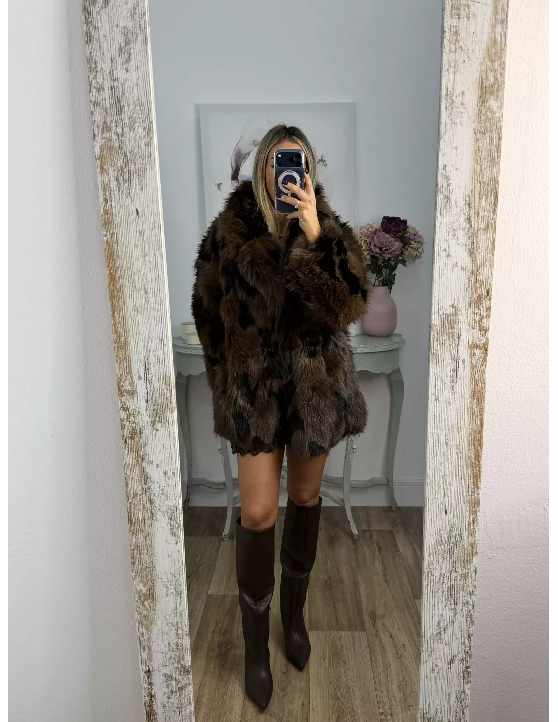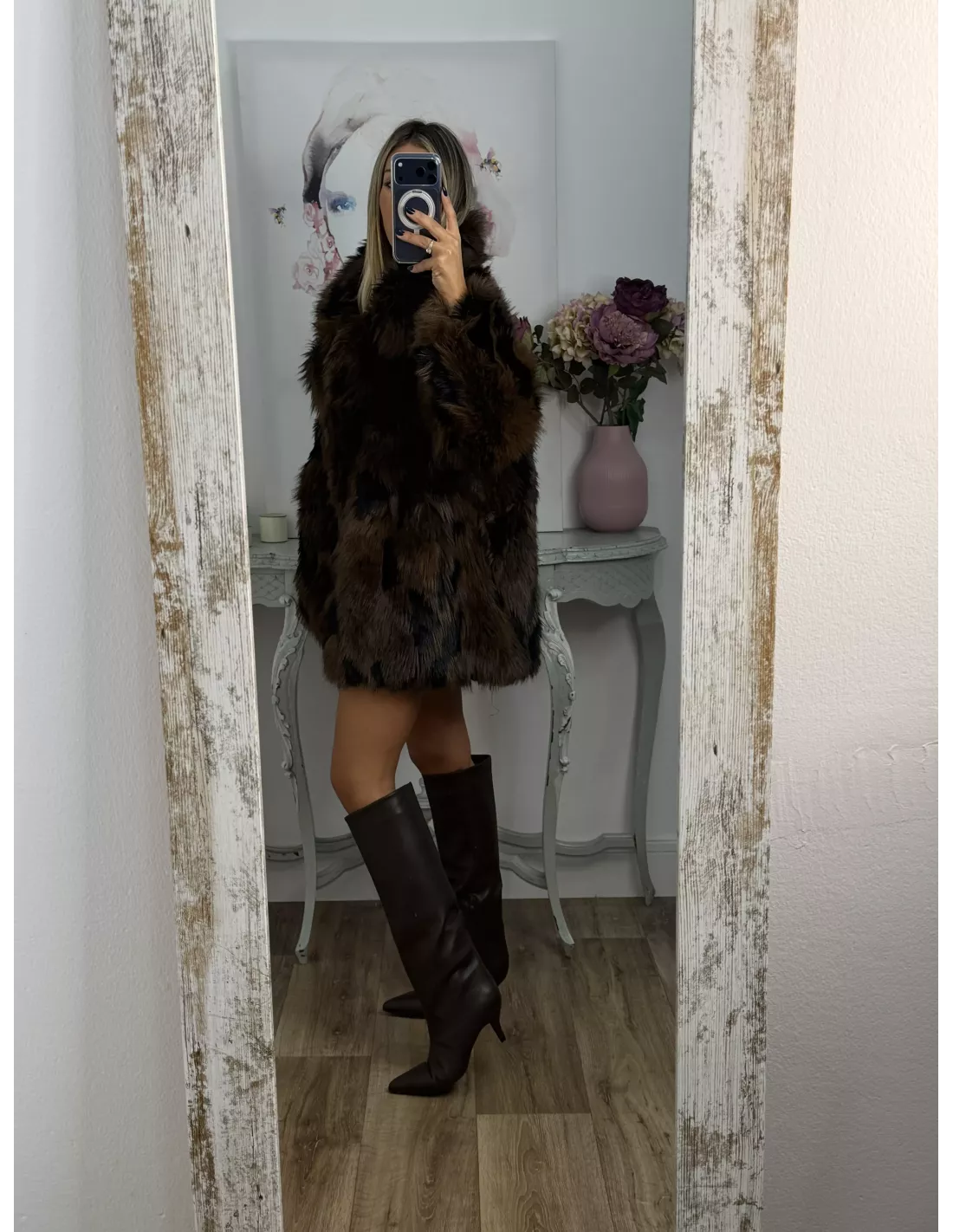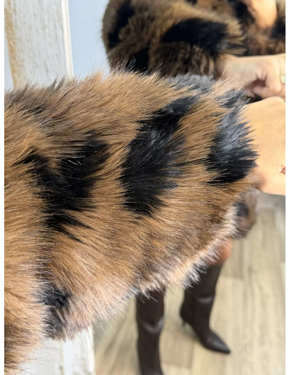Abrigo de pelo sintético. Va forrado y tiene bolsillos. El tacto es muy suave. Se cierra com botones de clips