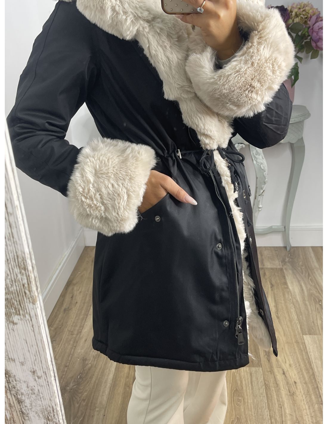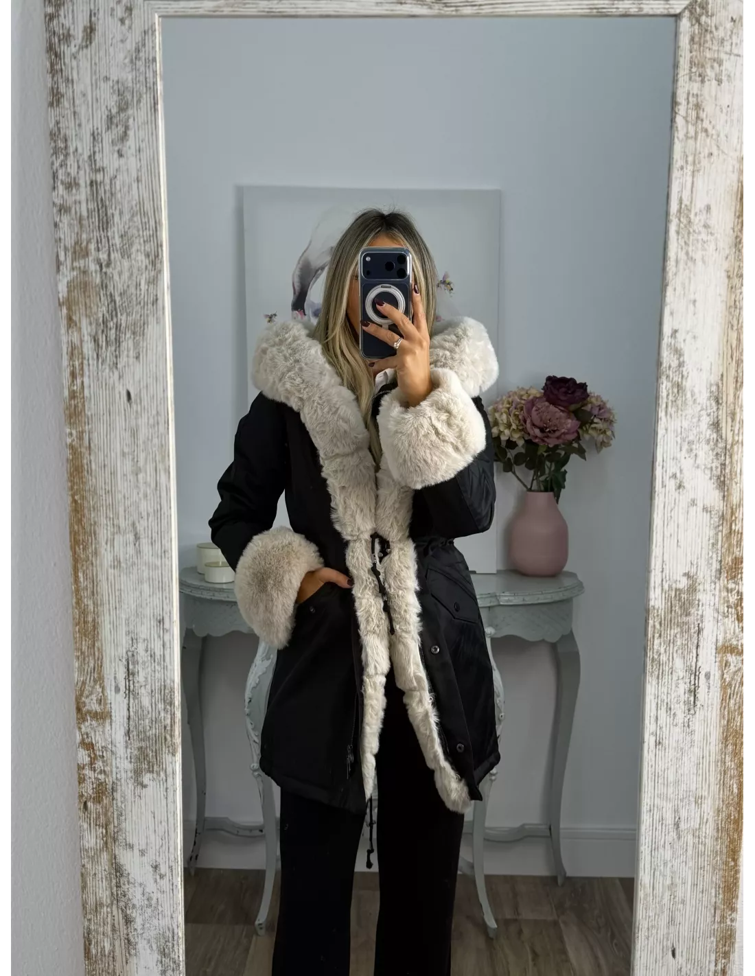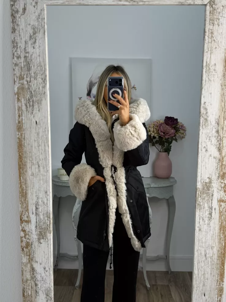Abrigo de corte tipo parka con pelo sintético. El pelo que lleva al rededor de la capucha y de los puños se puede quitar. La parte del intentar va de pelito, la zona de la manga no. Lleva corte en la cintura con un cordón. Talla amplio