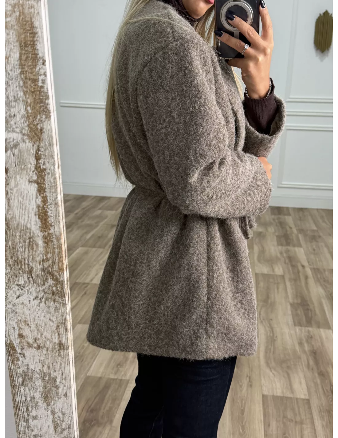 Chaqueta de cuello a la caja, de corte montado. Se cierra con un botón dorado y trae un cinturón del mismo tejido. Va forrada . No tiene bolsillos.