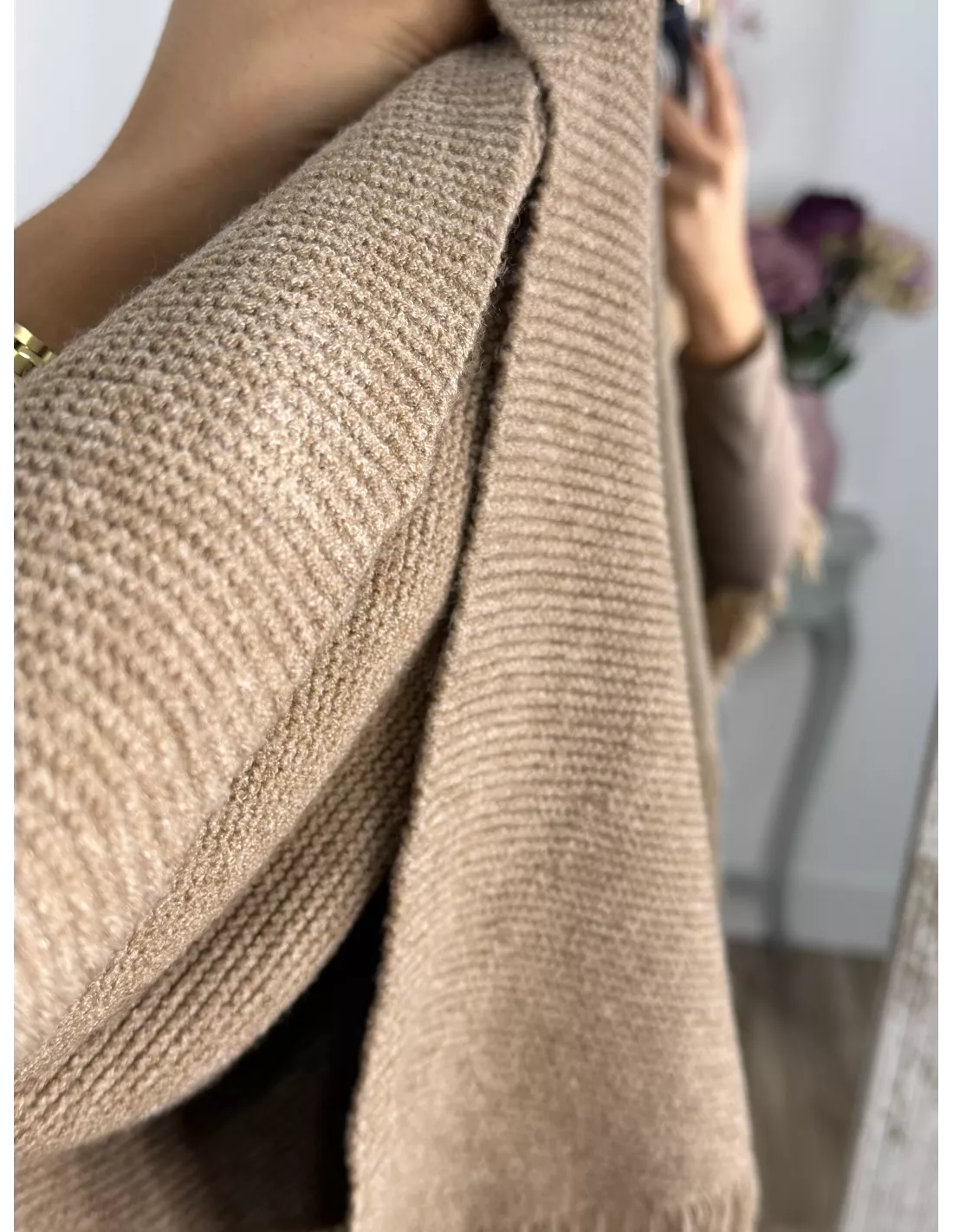 Chal de punto con flecos en la parte de abajo.