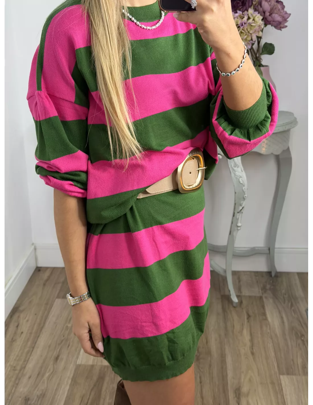 Cinturón ancho tacto de melocotón. La parte de atrás es elástica y se adapta muy bien.