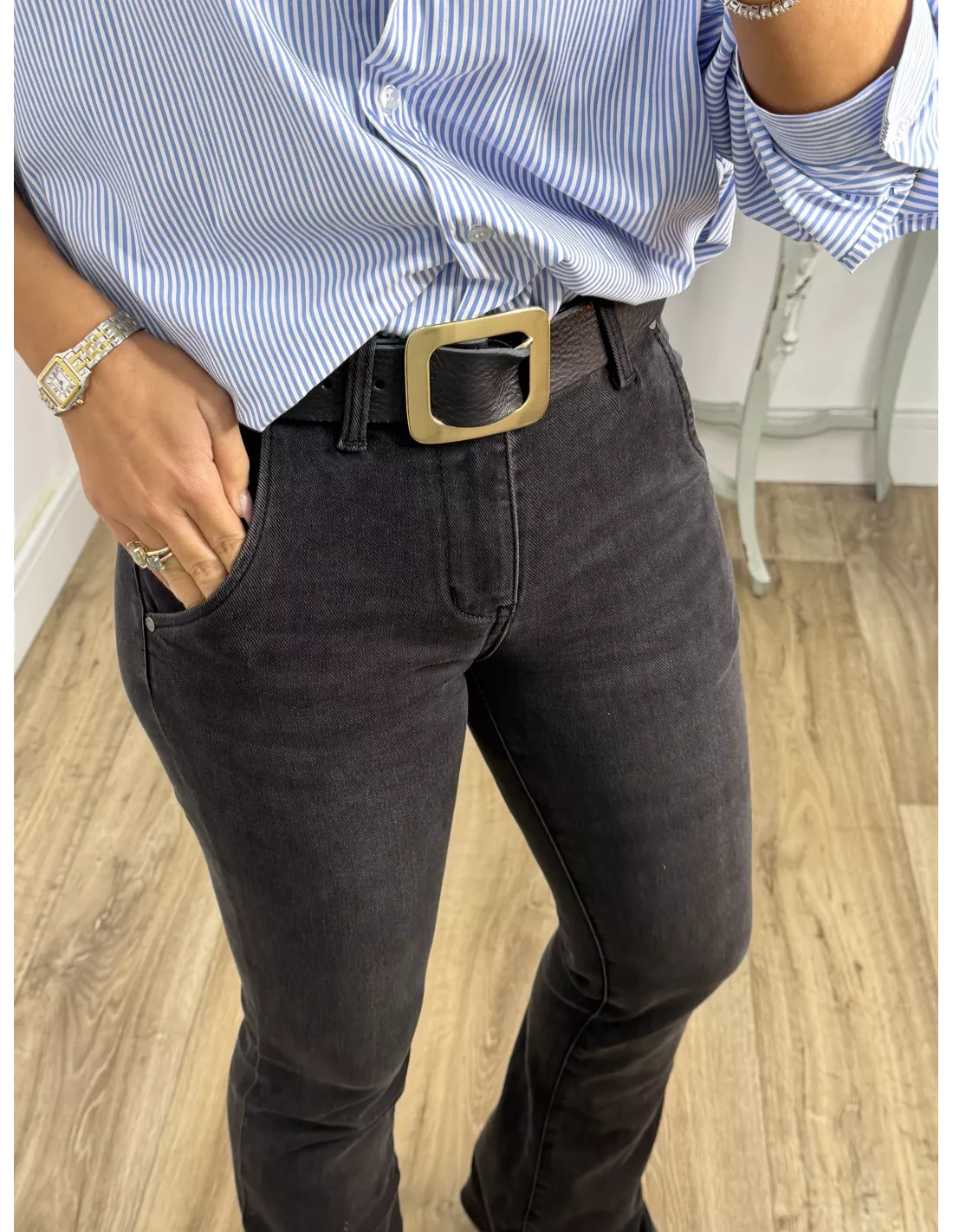 Cinturón piel negro hebilla dorada