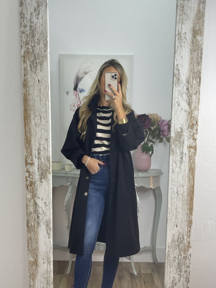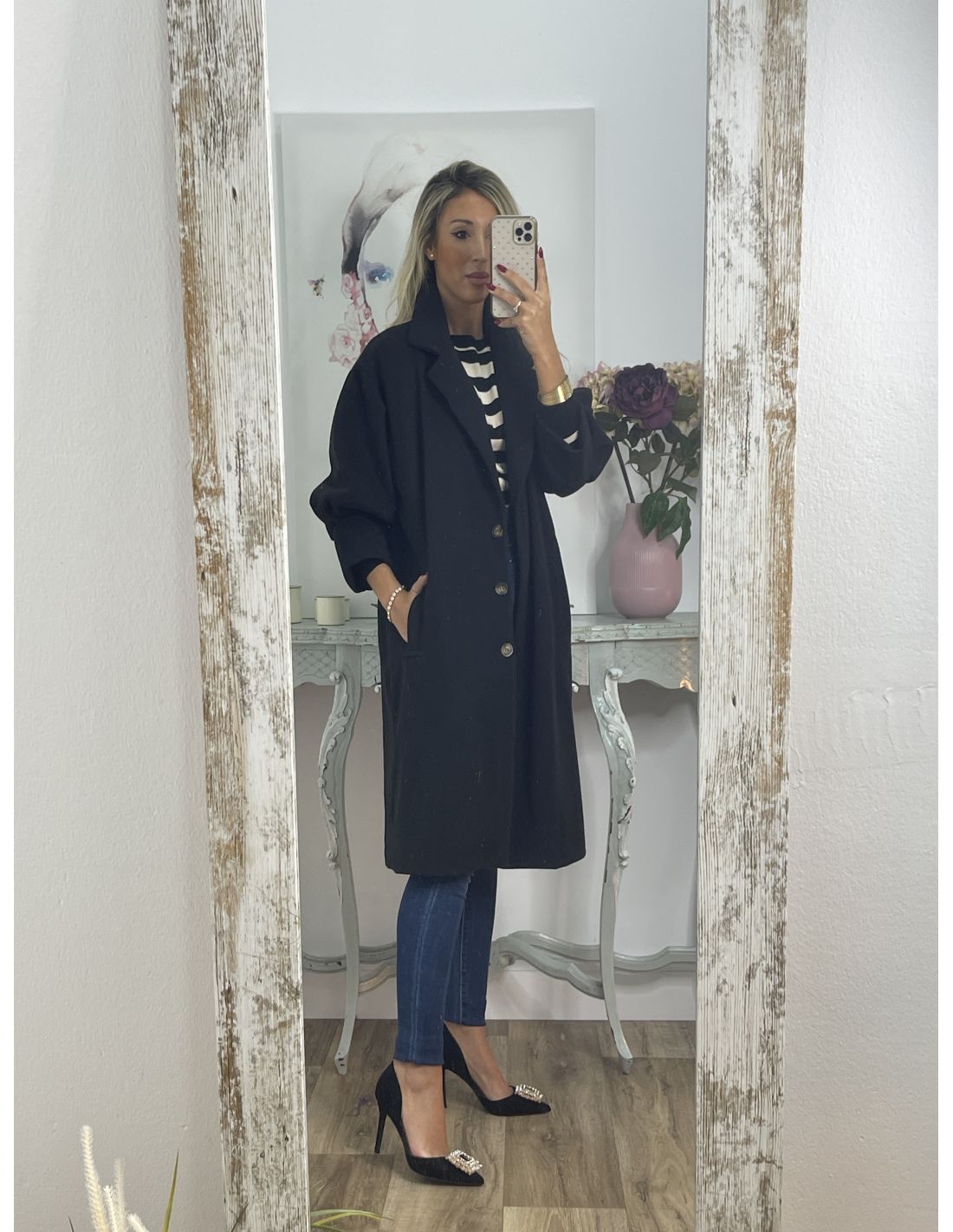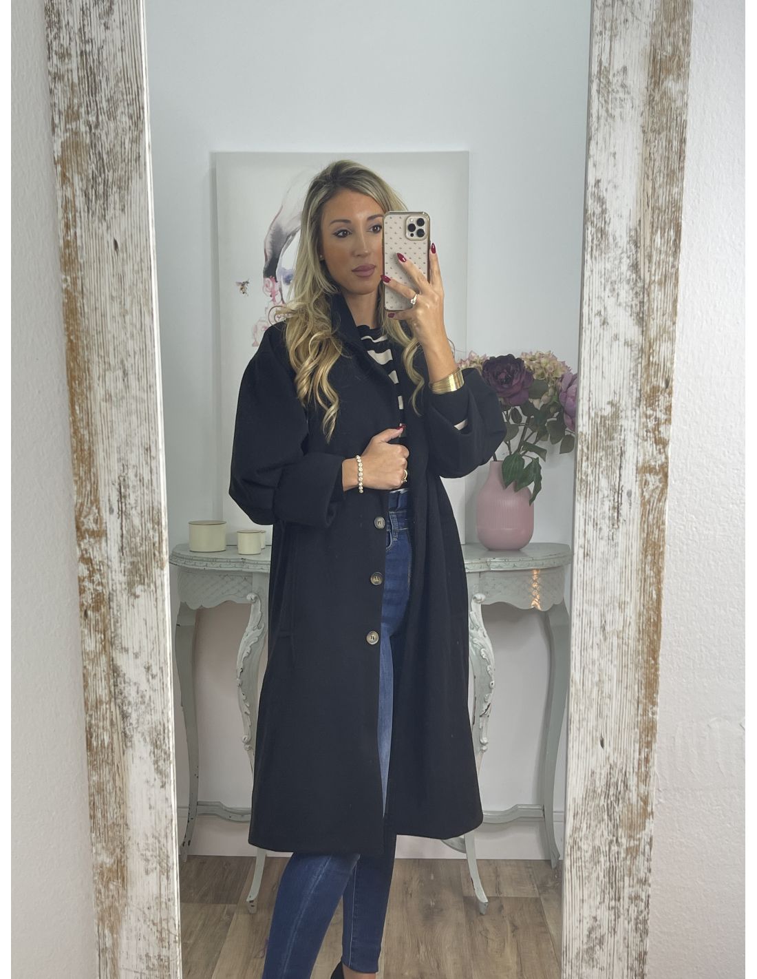 Abrigo va forrado de corte oversize. De manga amplia con un puño ancho. Tiene bolsillos y se cierra con botones.