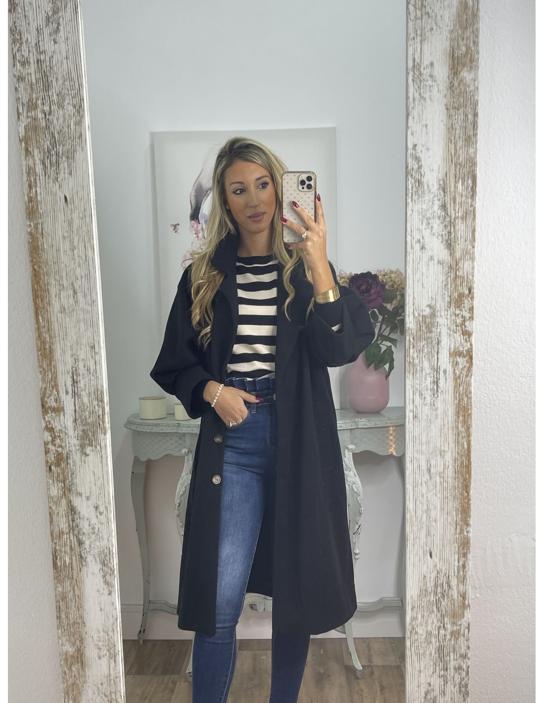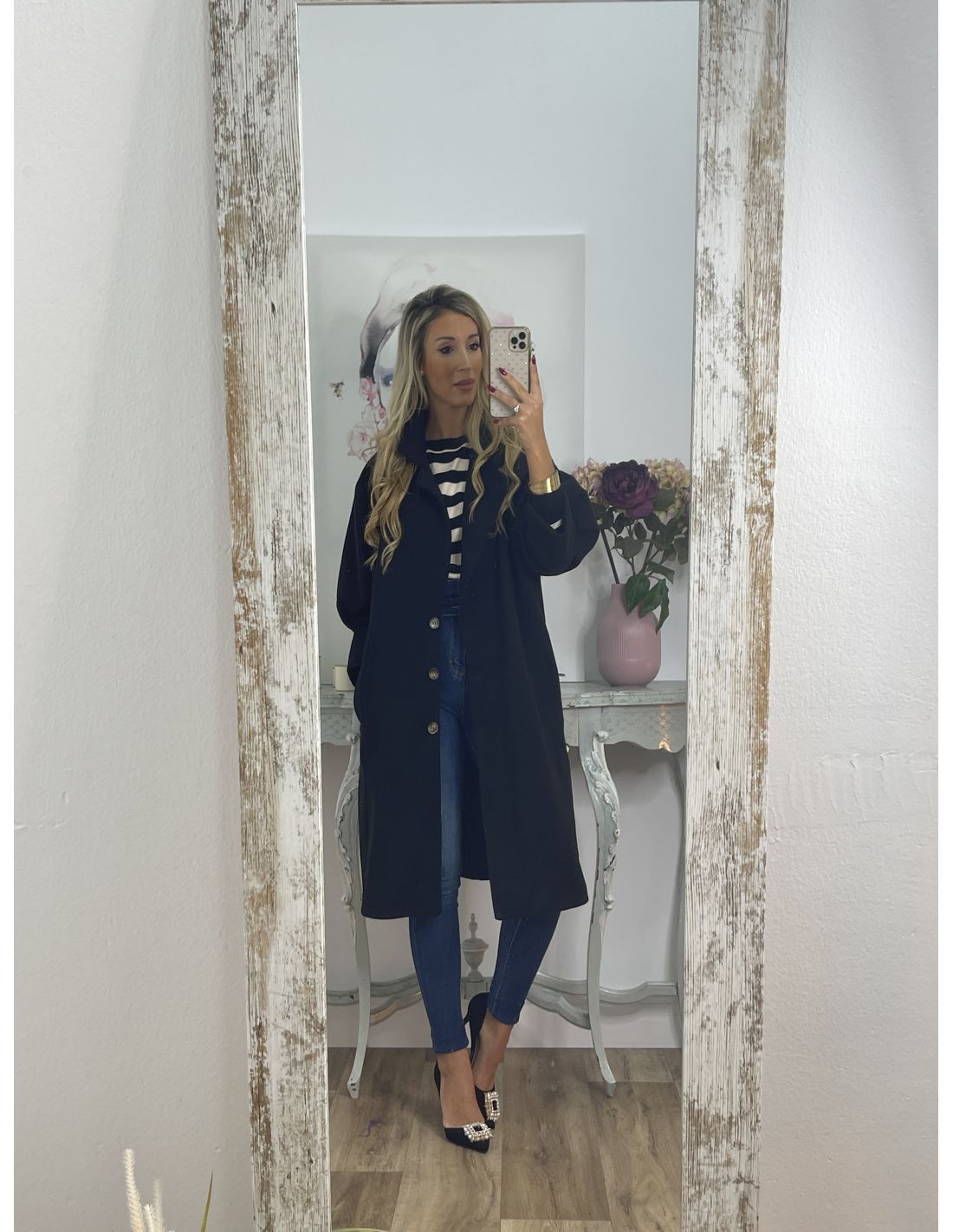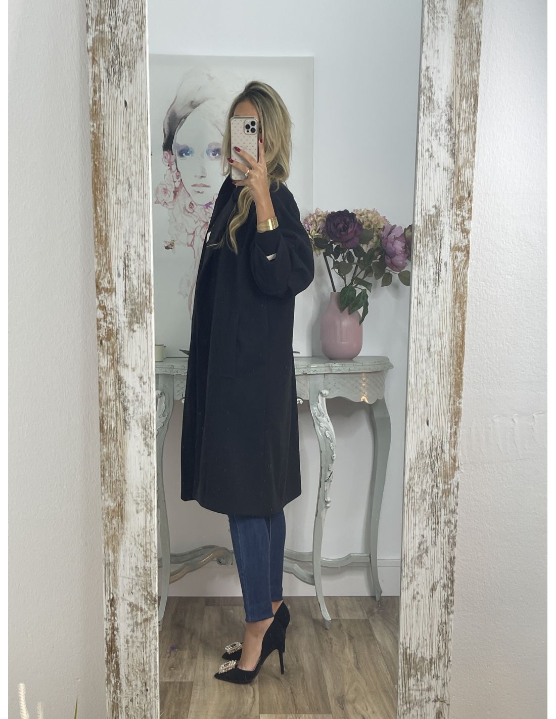 Abrigo va forrado de corte oversize. De manga amplia con un puño ancho. Tiene bolsillos y se cierra con botones.