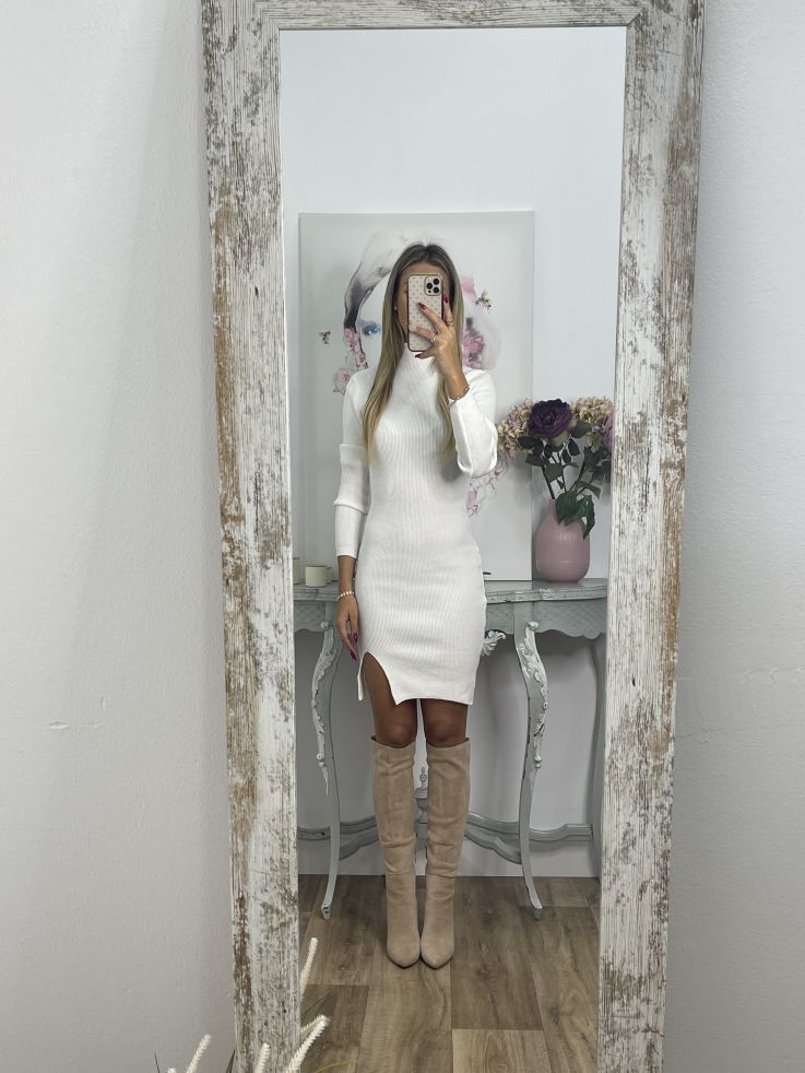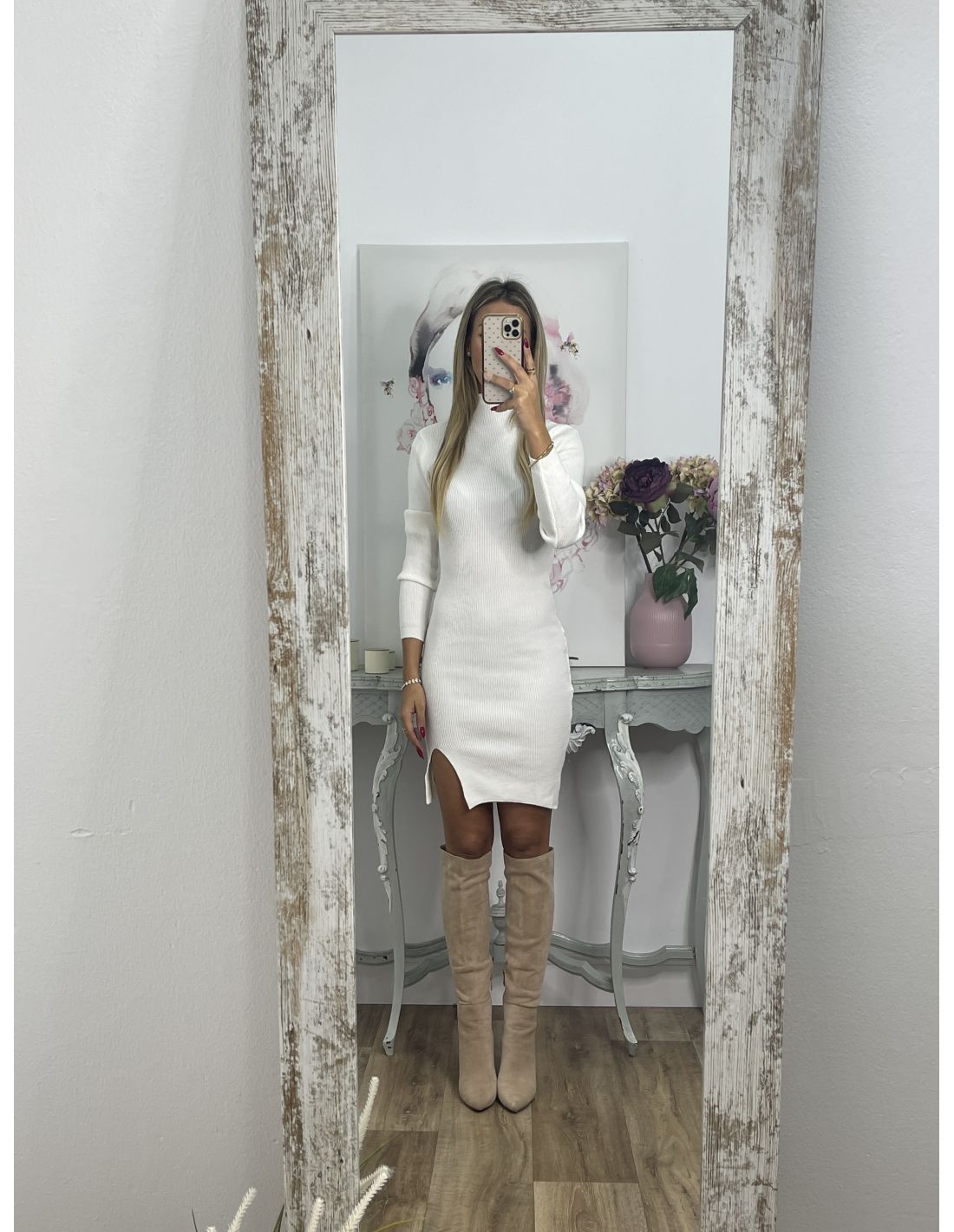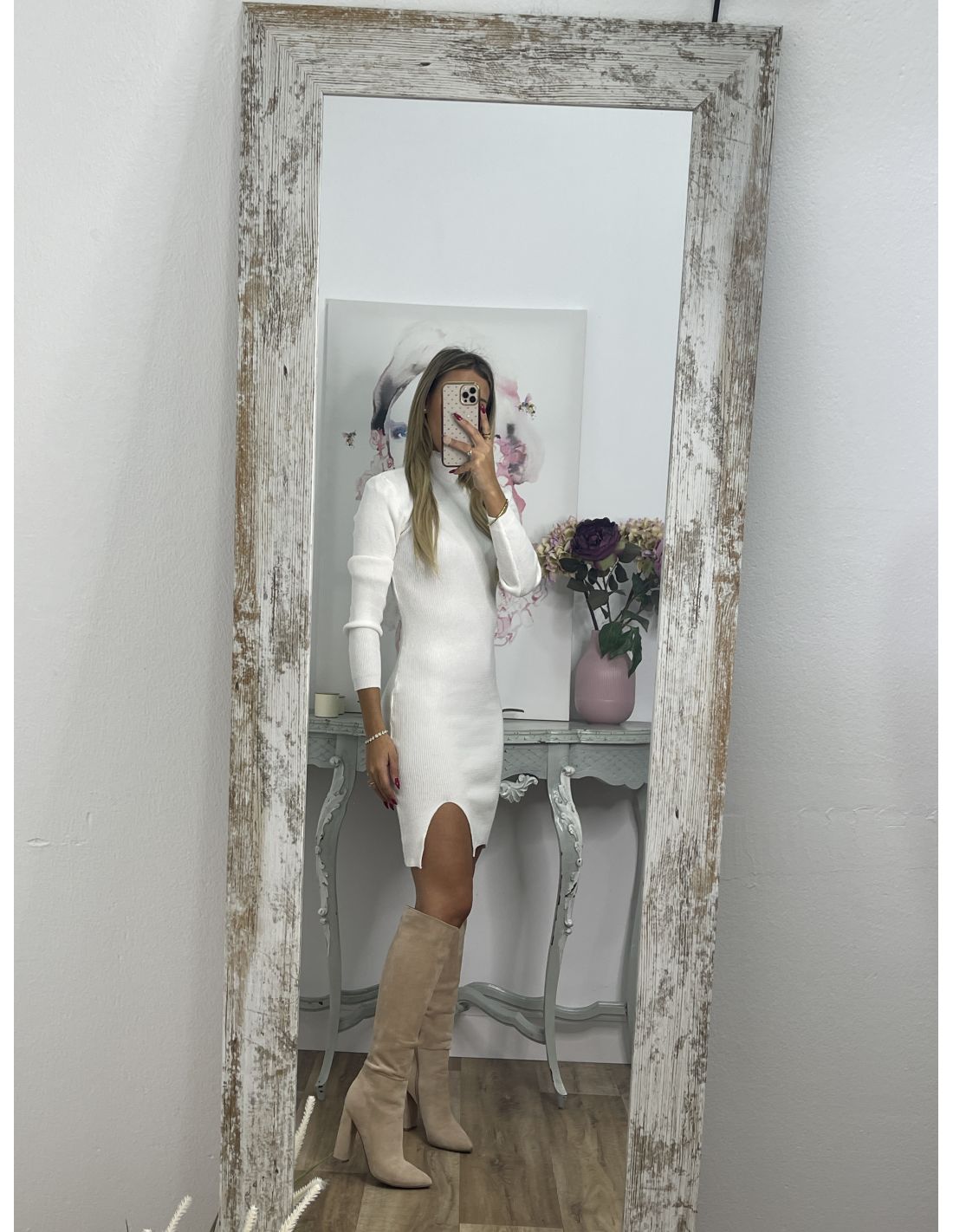 Vestido de punto ajustado, con cuello chimenea, con raja en la zona de la falda.